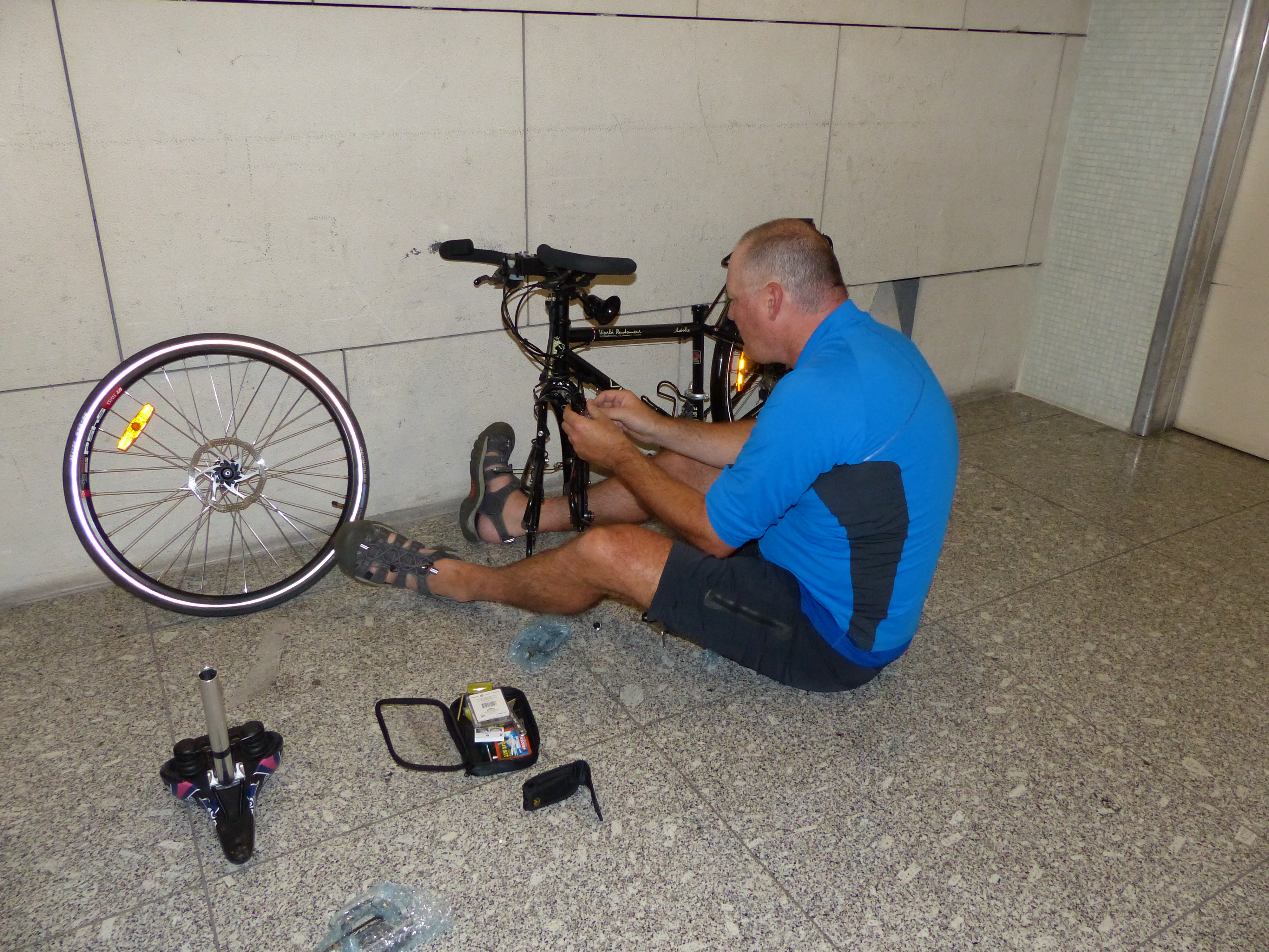 Now…to tackle Steve’s bike which is, of course, twice the size of mine. Steve reached for his knife to cut the cable ties that were holding all the separate parts to the frame and then…”Ooowww”, he shouted, accompanied by some jumping and hopping, “quick, band-aid, grab a band-aid, actually a very big band-aid, actually just a cloth,” came Steve’s rapid-fire requests and instructions. As I was looking through bags to find our medical supplies, Steve stood there bleeding over the polished floor. Yes, he had wielded his cable-tie cutting knife with a little too much abandon and had sliced the pad of his hand. I said a band-aid wasn’t going to fix that and he should head off to First Aid, a sign for which I’d seen earlier. So the bike surgery was put on hold while Steve toddled off to find his own medical support. After some help from a nice security guard who called someone to the unmanned First Aid desk, Steve returned, nicely steri-stripped and patched up by the attending doctor and set about his bike-task again.