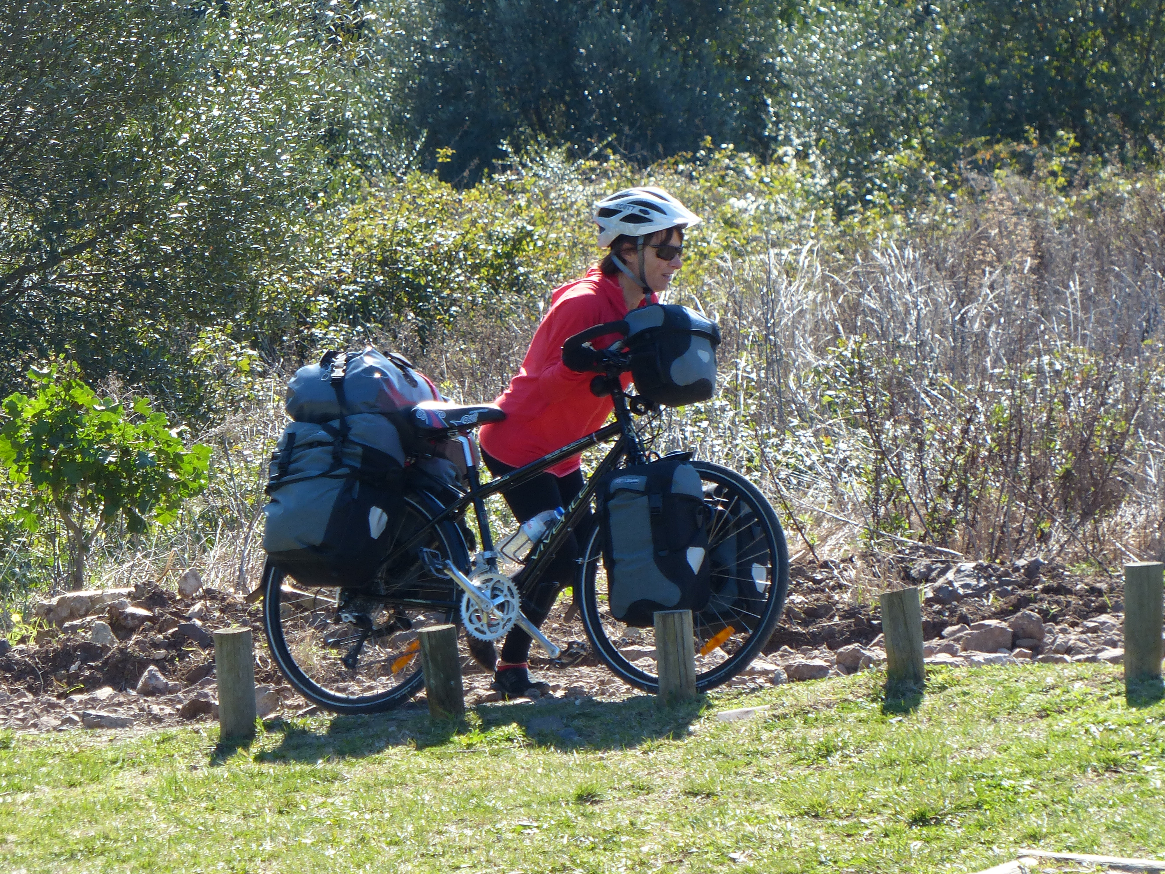 Then…heading out of the city we were confronted with a long, steep climb up a hill. We powered on. The hill got the better of Steve and his load, so he stopped and began walking and pushing the bike, so I stopped and started pushing my bike too. That is hard. That bike is heavy. The bike and all its load is my full body weight again. So we walked and pushed the bikes up that hill but thought OK, we’ve got a heavy load, we failed our first hill test, but not to worry, we got up in the end. The hill evened out so we remounted and pedalled off again.