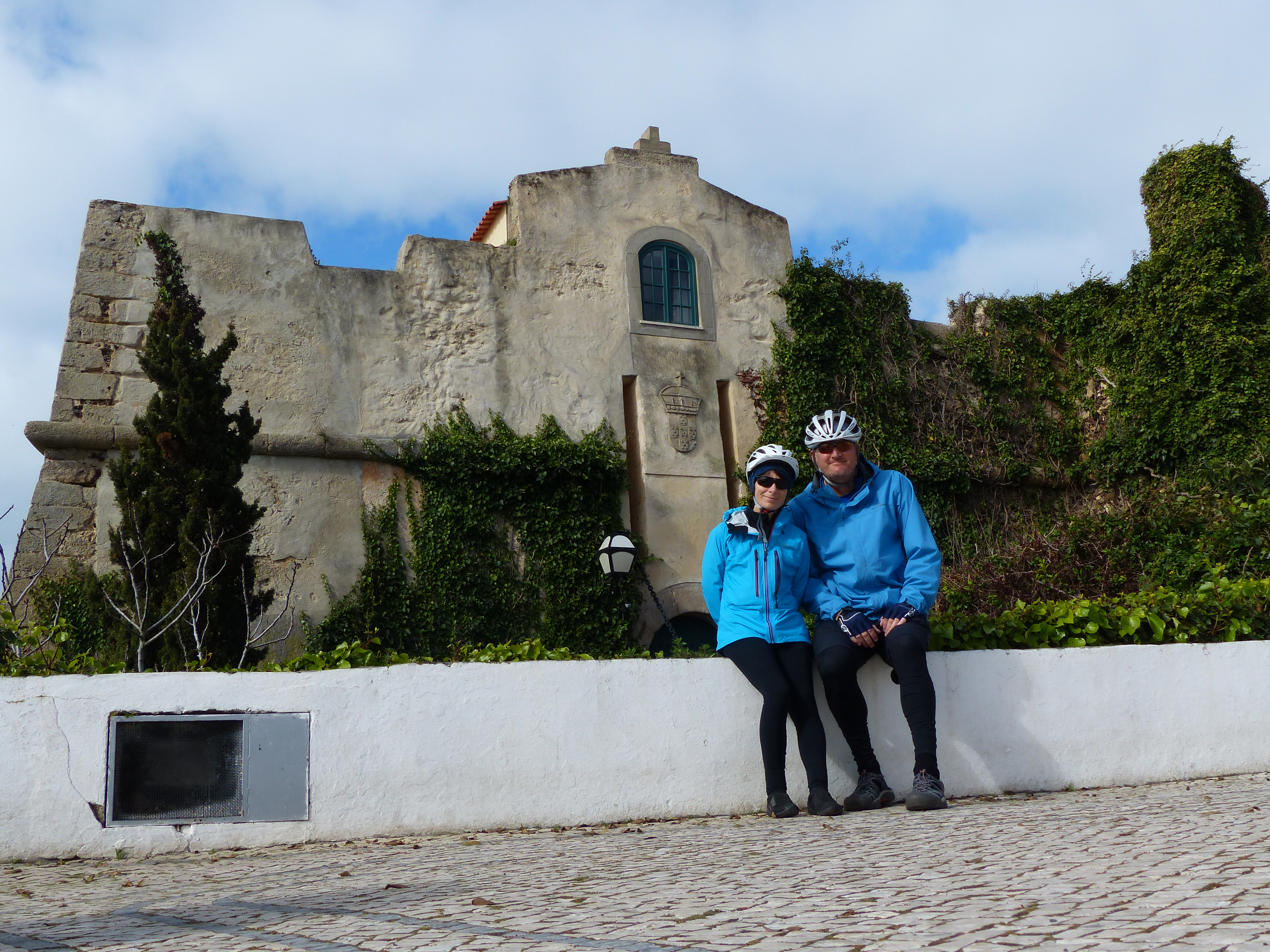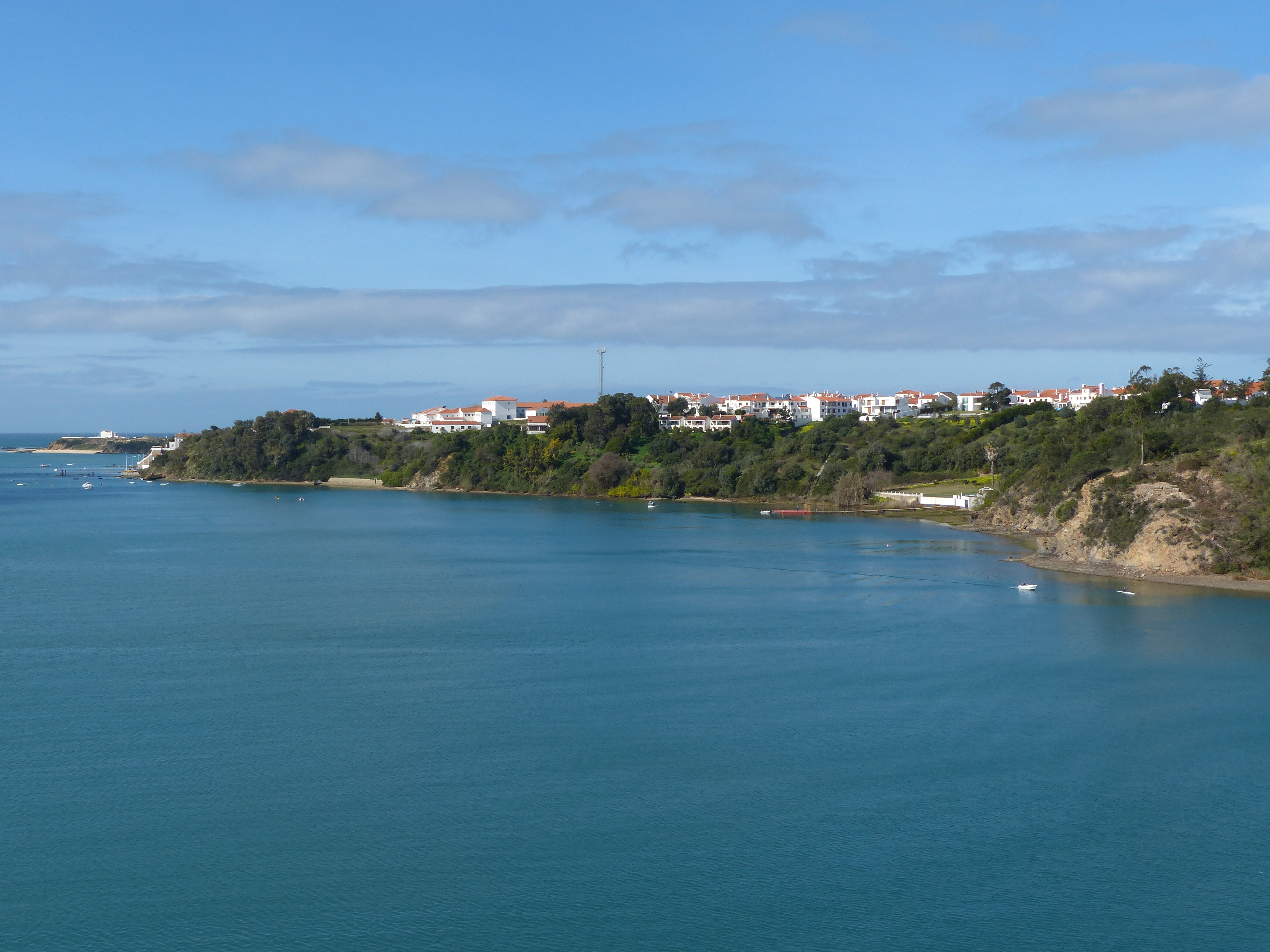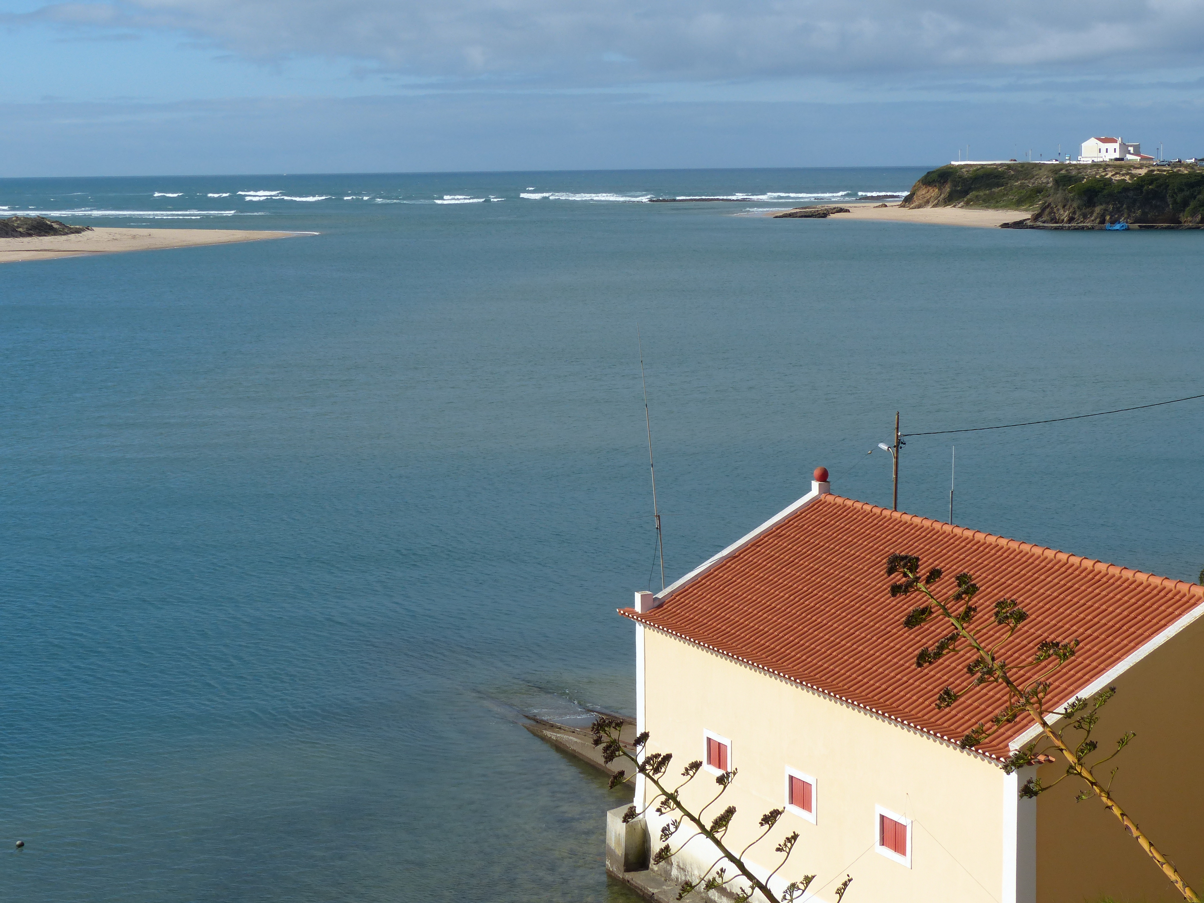 We turned off the main road to have a look at the little town of Vila Nora de Milfontes, which was a delightful little place. It was small but probably the most busy and bustling place we’ve been in so far. It had lots of little cobbled streets that converged together, so we would find ourselves in a spot with three streets running off it, with two saying No Entry and the other with an arrow pointing down it. So, being the skillful navigators that we are, we followed the arrow, only to find ourselves in a dead end street. Hmmm, back we went, down a different street and again found ourselves in a spot with three streets running off it, with two showing No Entry signs and one street we could go down and this would then take us to a tiny narrow little lane or a dead end. I felt like one of those little silver balls in the maze game, being rolled around the lane ways only to find “bump, no not that way, go back, roll up, down, sideways, no wrong way…” on and on we went. We eventually came out beside the historic fort and a spectacular view over the water with the boats below, a kayaker paddling away and a monument showing a plane and three men in brass. We took a picture of the plaque for later translation, because those men obviously did something important, but we couldn’t read what it was. In this town, we also saw a primary school with the children outside playing – that’s the first group of school kids we’ve seen, so it was nice to pedal past and see a little school in action.