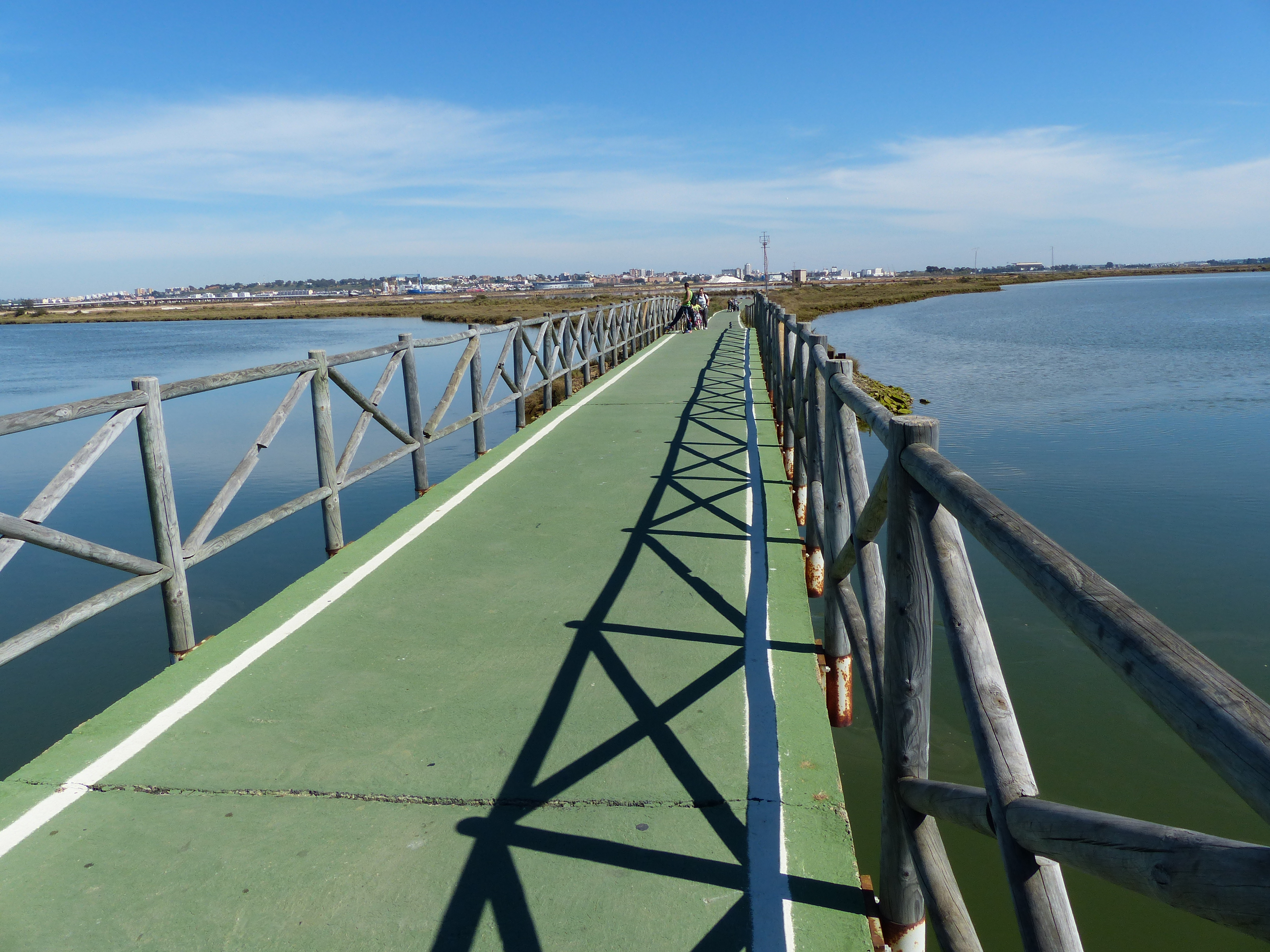 We rode in along an absolutely fantastic bike path. It ran alongside the main road, but ran through trees and then through wetlands and was brilliantly set up for recreational cyclists. There were picnic tables and bike stands in places along the path and it was a super place to ride. Lots of mountain bikers were passing us and we saw a few families out riding. One couple with their two little children stopped and talked to Steve. After an exchange of Steve’s limited Spanish and their limited English, it turned out they were asking him to take their photo for them, which he did. Off we then pedalled for the final push into Huelva with a great ride along that terrific bike path.