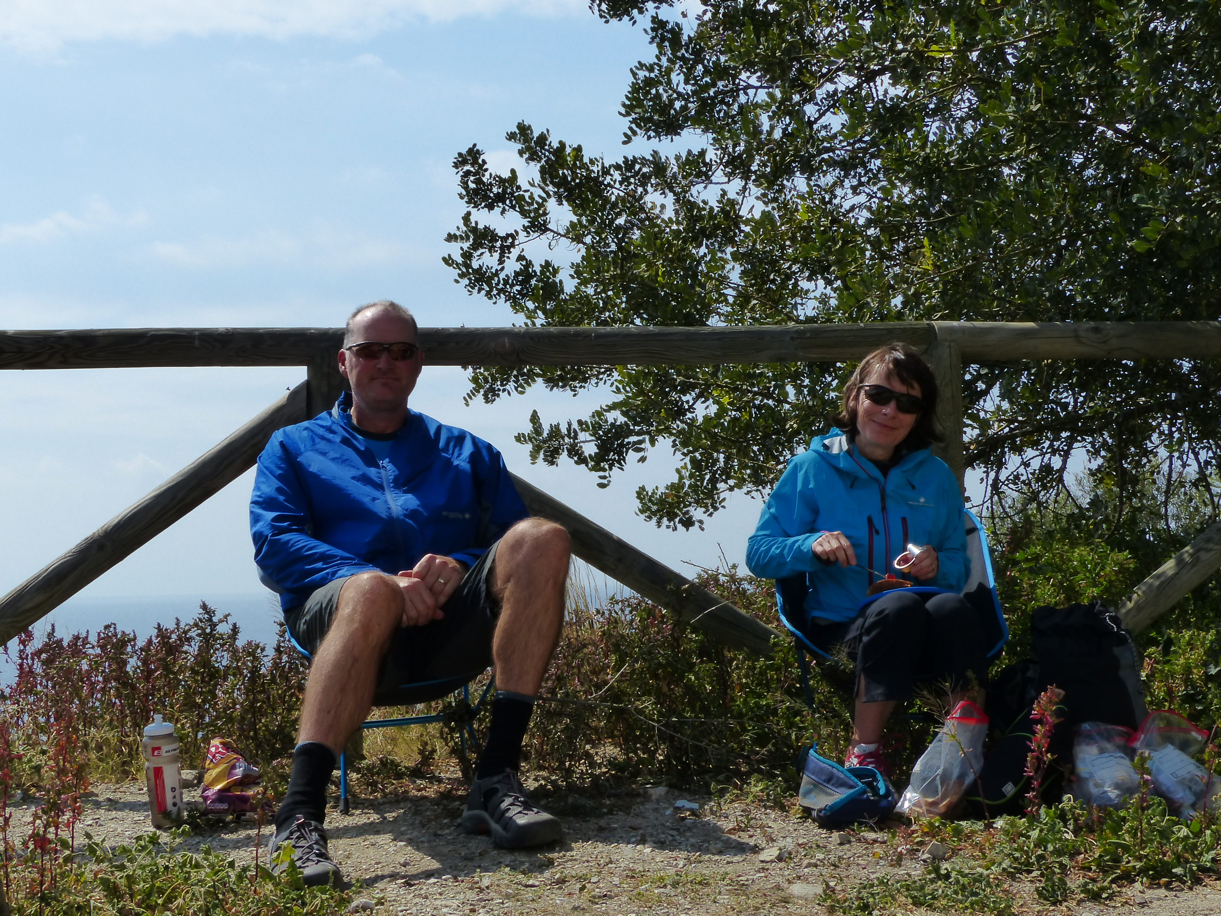 The bike was getting worse, it was scraping and grating and grinding and wasn’t happy. At the top of one hill, we stopped at a lookout, had a quick bite of lunch and then unloaded my bike for Steve to tip it upside down and do a bit of maintenance. Sure enough, the back mudguard had been pushed down by the heavy lock on the tyre after that clunk on the gutter and the front wheel had been pushed out of alignment. So Steve fixed those things and the bike seemed happier and even though the gears were now clunking and not changing properly, it was an improvement. As we were sitting having lunch, a couple of cyclists pedalled in and joined us and got chatting. They were from the UK and had a villa in the area they had just put on the market. We chatted to them about what we were doing. Then a French couple also pulled up and saw the bikes and asked me about them and what we were doing. So the bikes attracted a little bit of attention today too.