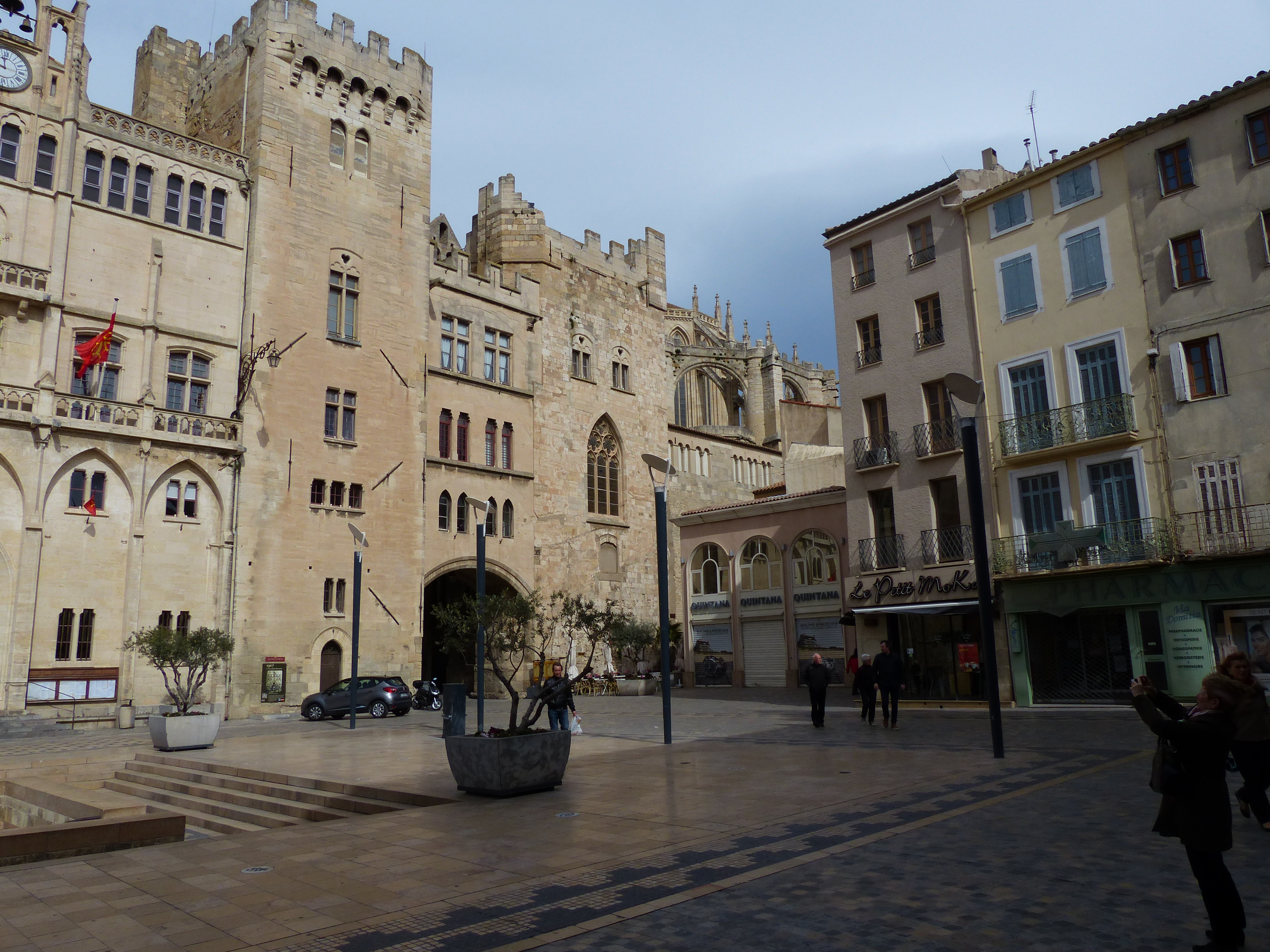 There wasn’t actually anywhere out of the wind, but we found a small plaza, with a historic church, that gave a little bit of shelter and it was a nice spot, so we sat down there. This is where one of our plans, didn’t quite work out, but it wasn’t a big plan, so it was OK. Today was our 18th wedding anniversary. We had planned to have a nice picnic lunch in Narbonne to mark the occasion and sit in a park or a plaza and just have a nice anniversary picnic, but the horrible wind put paid to that. It was too uncomfortable, unpleasant and cold to be able to go through with those plans, so a quick sit and a snack for elevenses outside that church became our “Anniversary Elevenses” instead. Oh well, maybe we can have a hotel room picnic instead and toast our wedding anniversary.