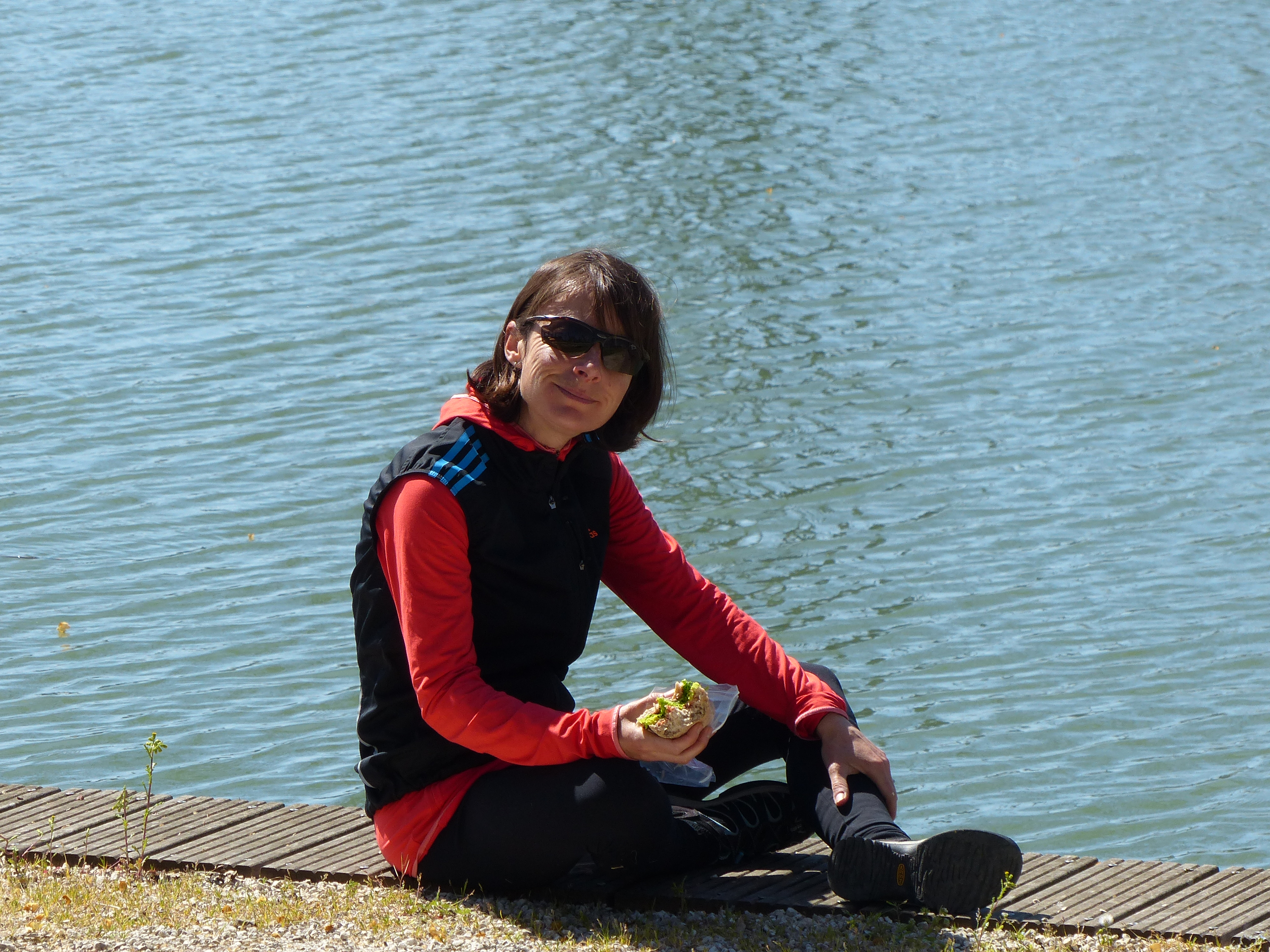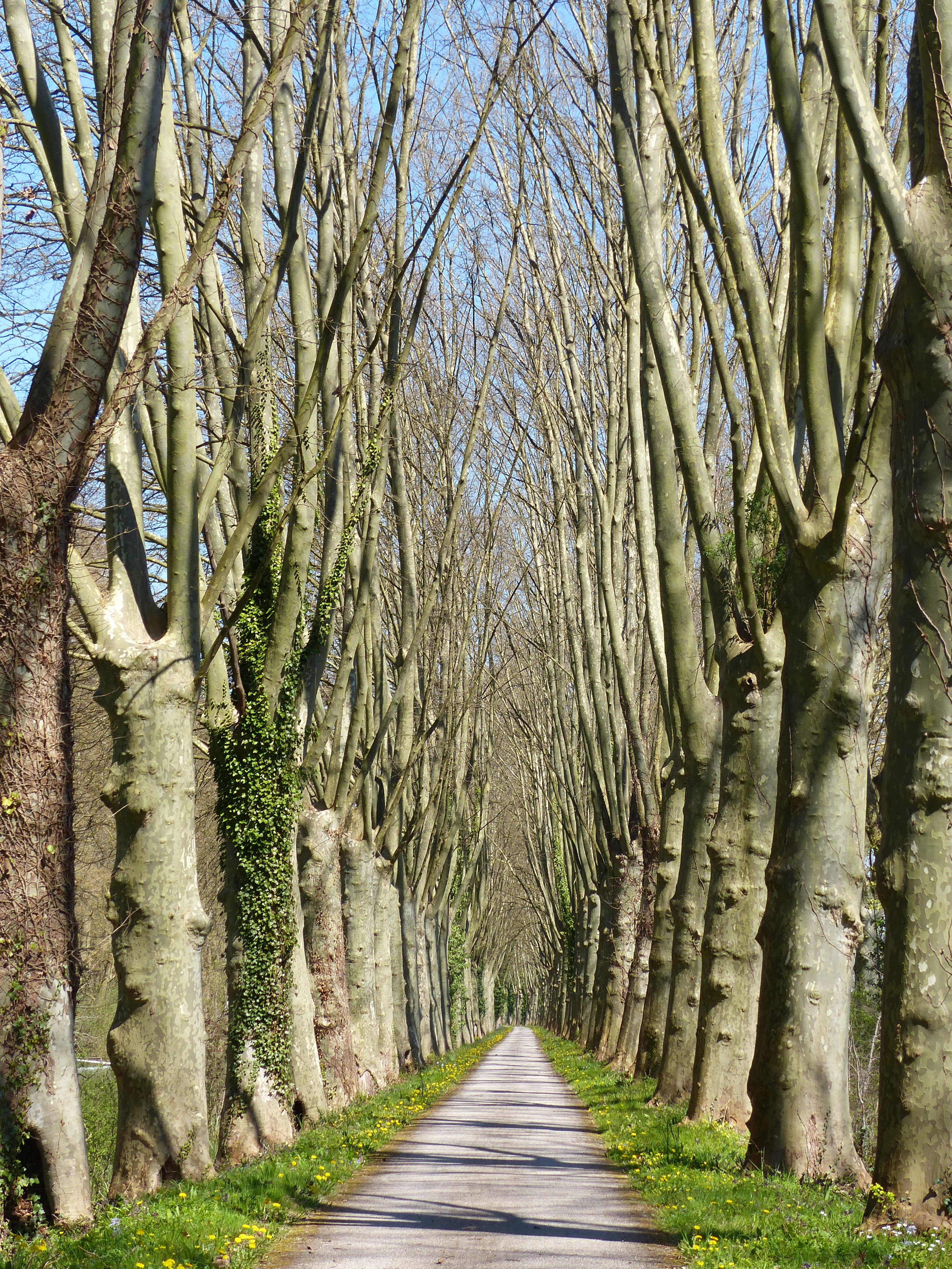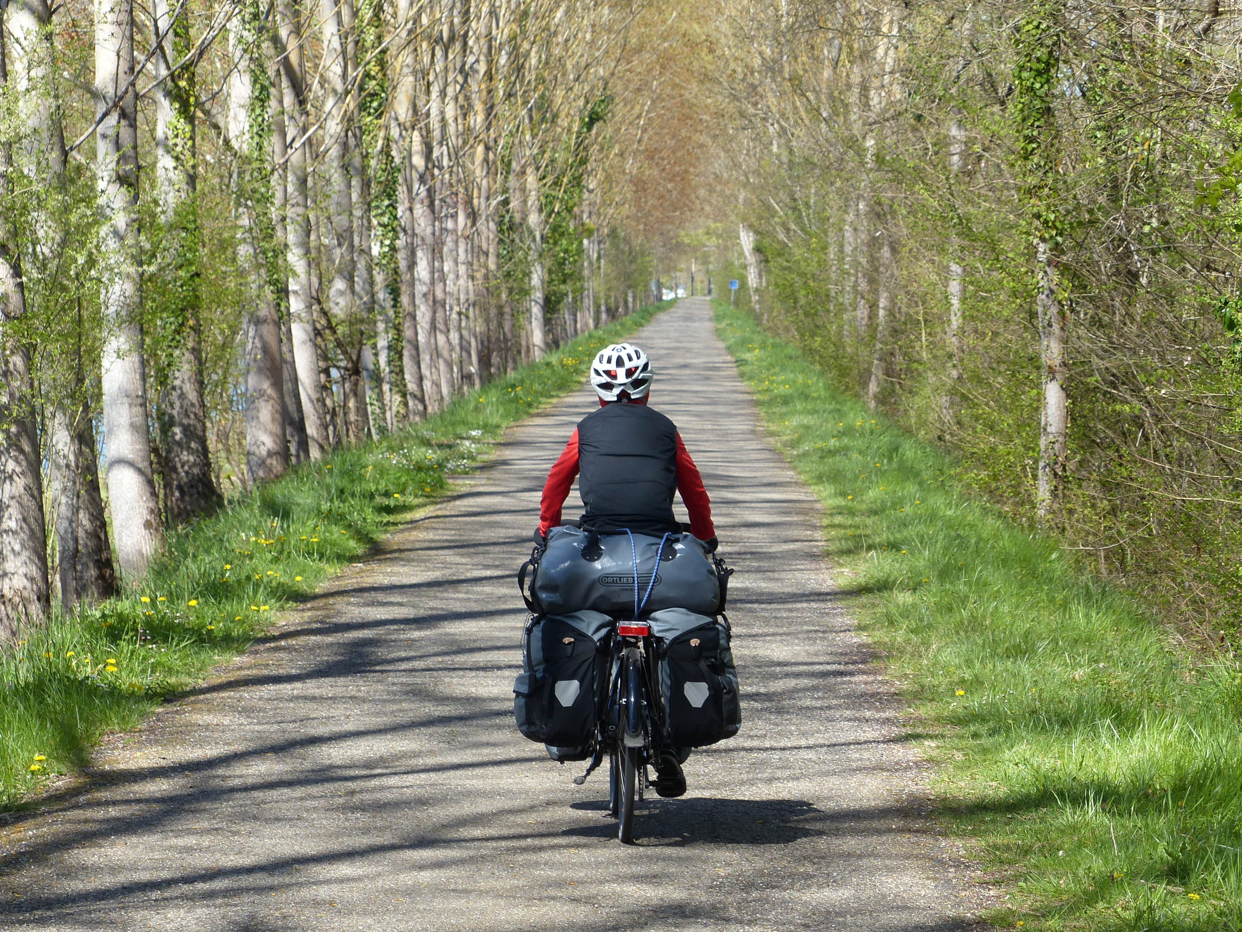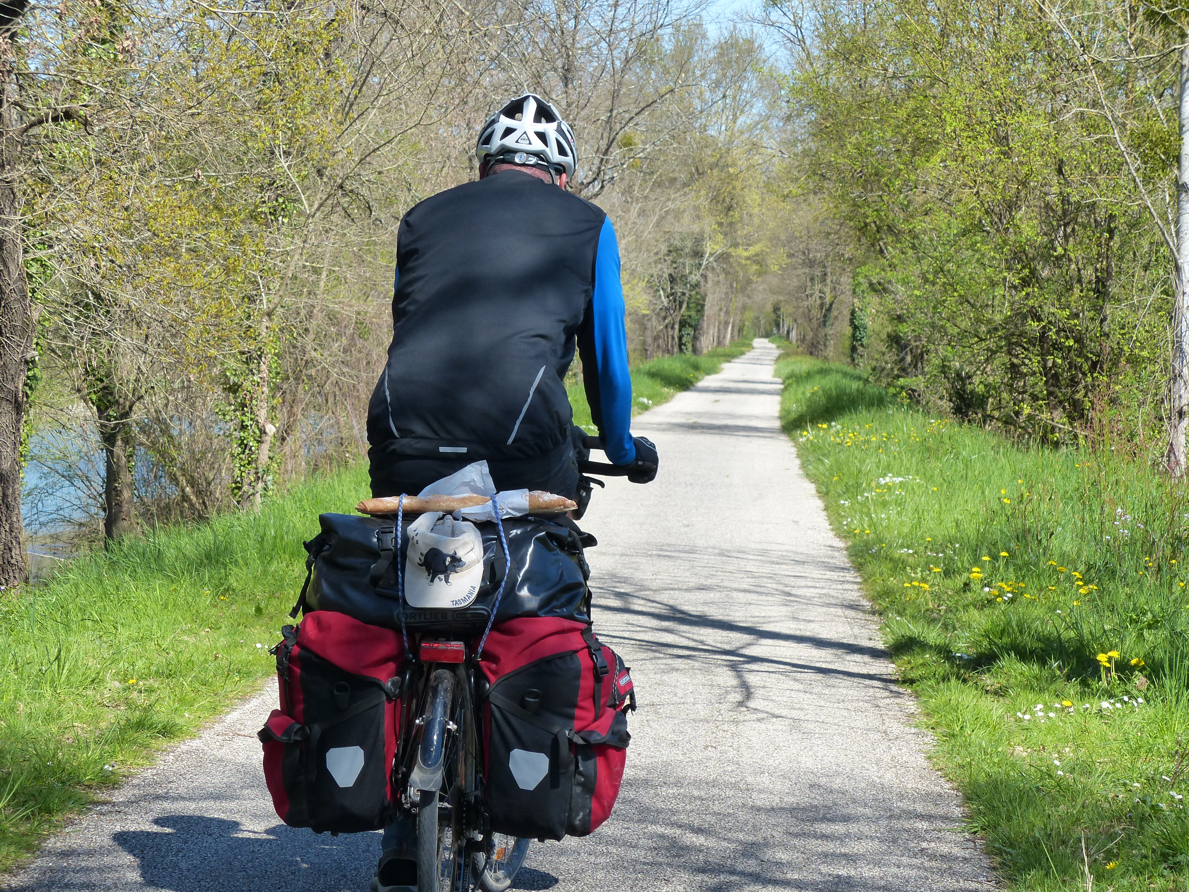 We continued to ride along the path, through those beautiful avenues of trees and then we had a slight hiccup. We had to ride slightly off the path to get around a walkers’ barrier, which involved some bumpy track. I rode around it and continued on with Steve behind me, but then I heard him honking the horn to get my attention. I stopped and turned. “I’ve got another puncture,” he said. So we stopped for repairs on puncture number two. This one turned out to be more than just a puncture though and the tyre was damaged as well, so a new one would be needed. Luckily this time the weather was delightful, so Steve worked on the bike, while I researched accommodation at our next destination. Then we had lunch in the sunshine before continuing on. So it was just a little hiccup.