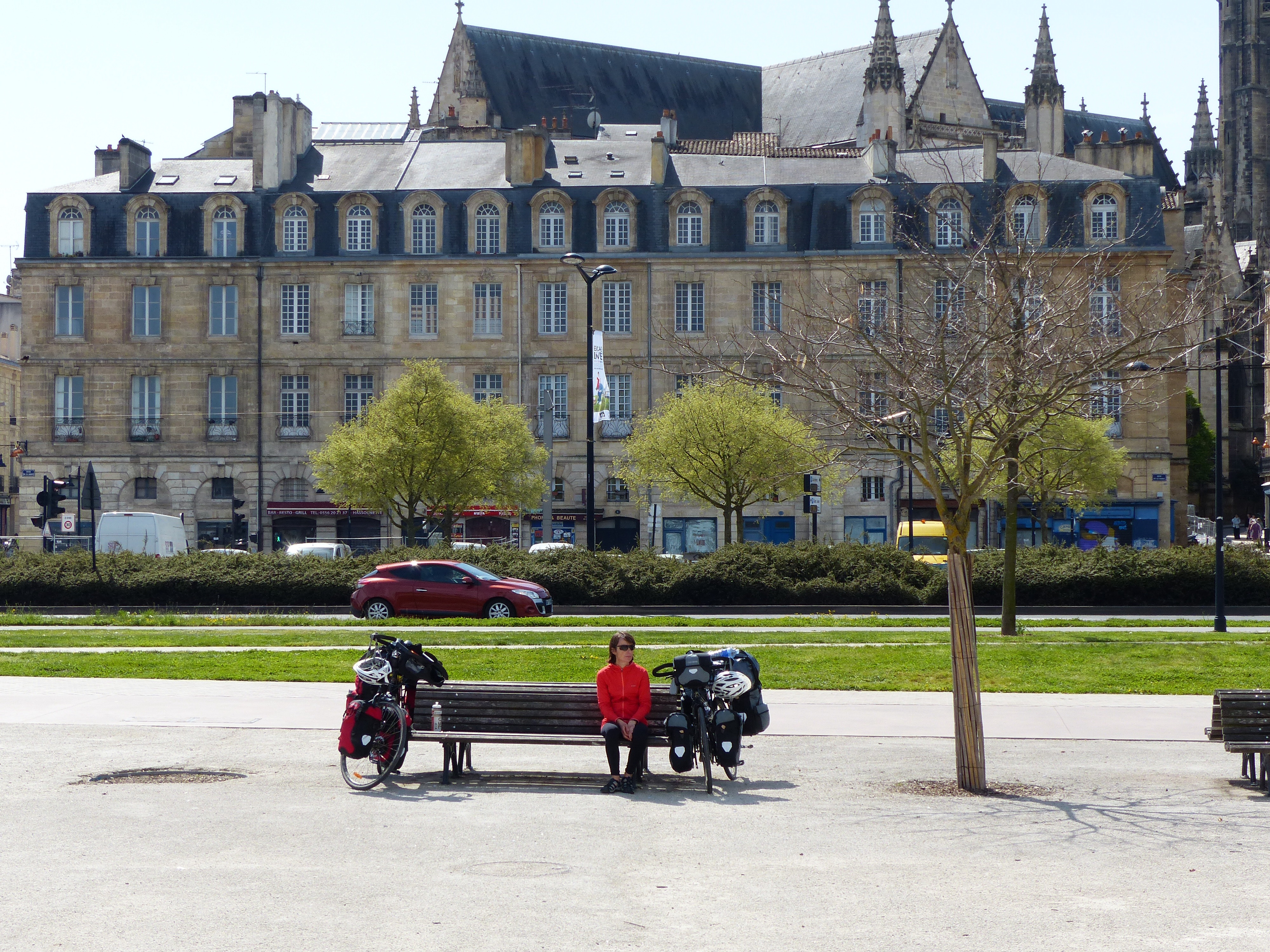 We rode into Lagnon and found the train station, where we were lucky enough to make it just before the next train to Bordeaux pulled up, so we headed straight to the platform and straight onto the train and we were away! Perfect timing. It was a short trip and we soon disembarked in Bordeaux, where thankfully the train station was equipped with escalators and we didn’t have to haul the bikes up any flights of stairs. We sat in the sun near the station while we got our bearings and found a route to our campsite and then we were off again.