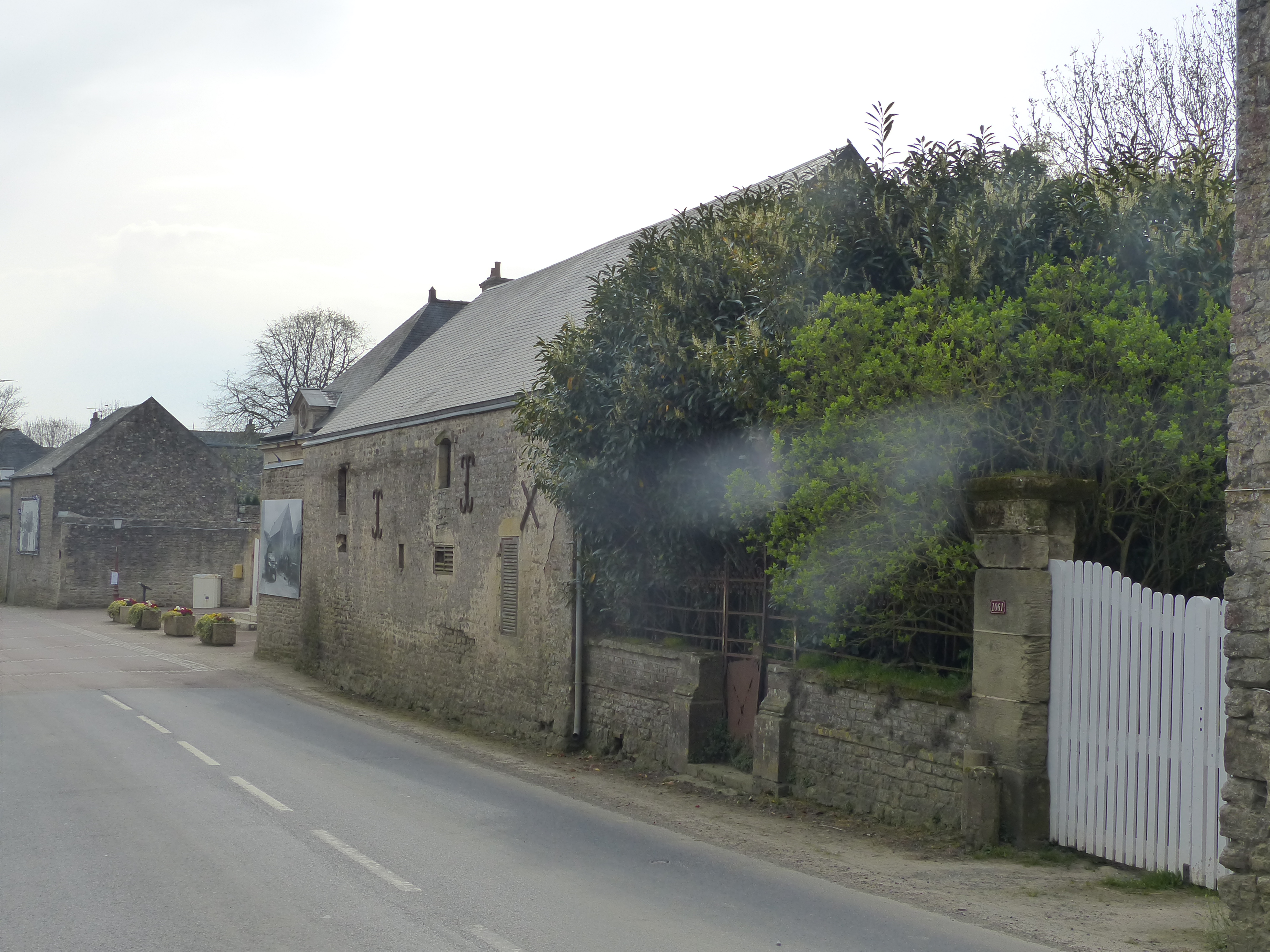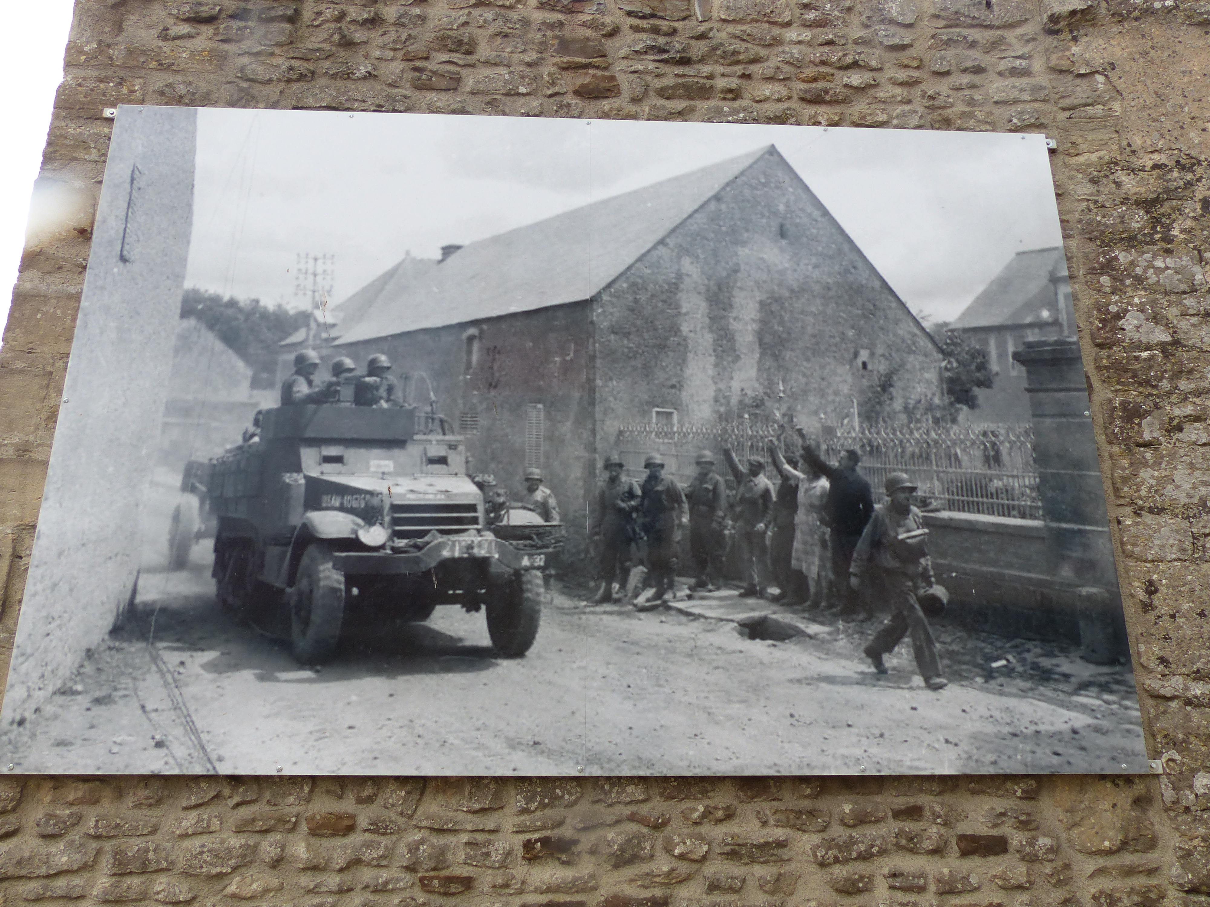 On we went and entered the town of Colleville-sur-Mer, which was liberated by the troops who landed at Omaha Beach on D-Day. As we rode along the streets, we saw big photographs on the stone walls, showing images of the liberating troops entering the town. Look at this photo. See the building and the iron fence behind the line of people and the stone gatepost on the right?