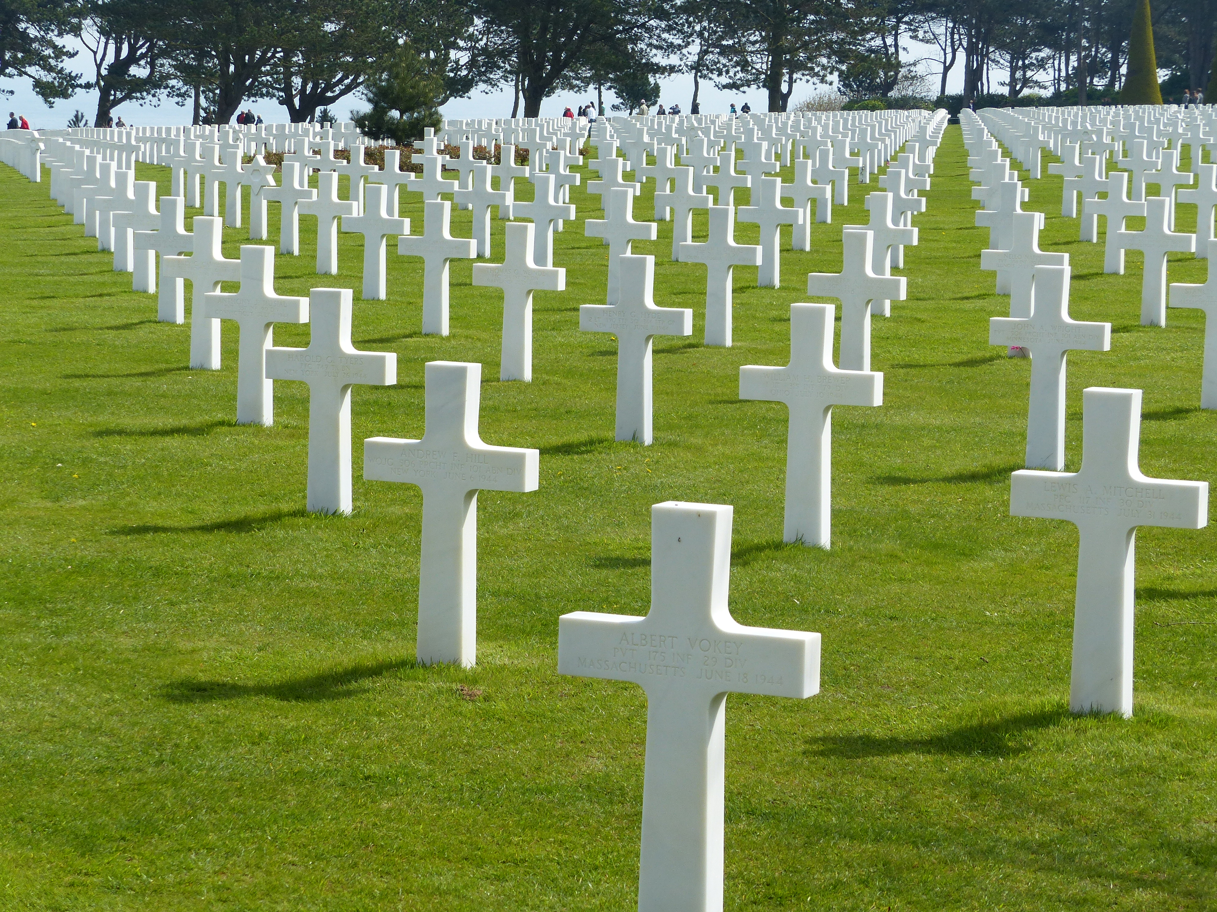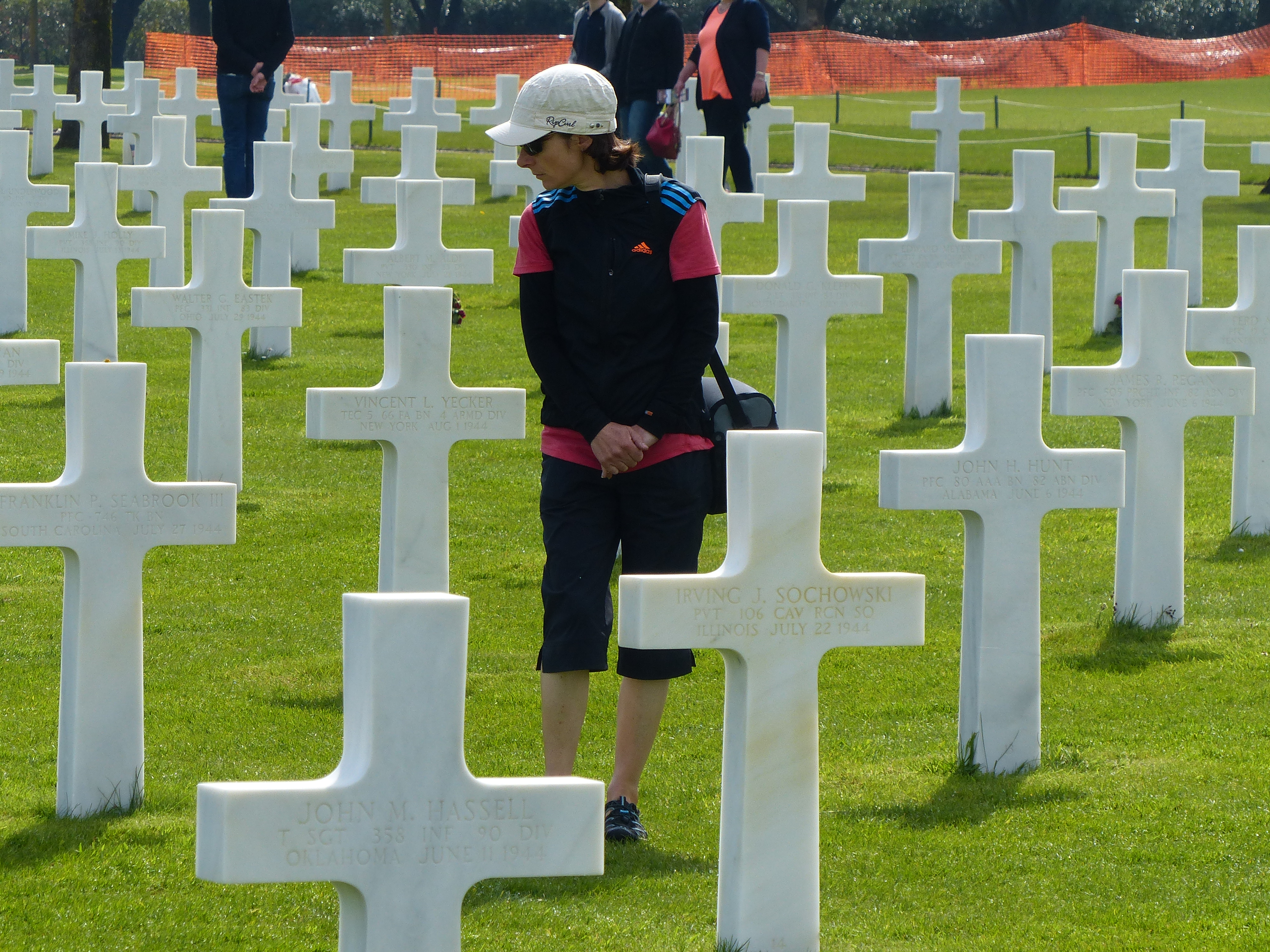 Past the memorial was the cemetery itself. Oh my. My stomach actually knotted as I walked along the lines of headstones, I think because it hit me that this wasn’t another monument or memorial like those we had visited so far, this was people. This cemetery is so famous and we had seen images of it in films (it’s in the opening scenes of Saving Private Ryan) and documentaries, but to be there, standing among those rows and rows of white headstones, it was extremely moving. The stark simplicity of the white granite crosses and Stars of David, in rows on a cliff overlooking the beach, was a very moving sight. The site was so peaceful too, there wasn’t a sound except for the birds and the sound of the waves crashing on the beach below. We walked along and I read many of the headstones, some of which gave the date of June 6, so these were soldiers who had died on D-Day itself , possibly during the landings and there were some that were unnamed too, which was sad to think they had died on the field of battle but were unidentified and unknown. They had their place in the cemetery though. It was a very touching experience, being there, seeing the cemetery and reading the headstones.