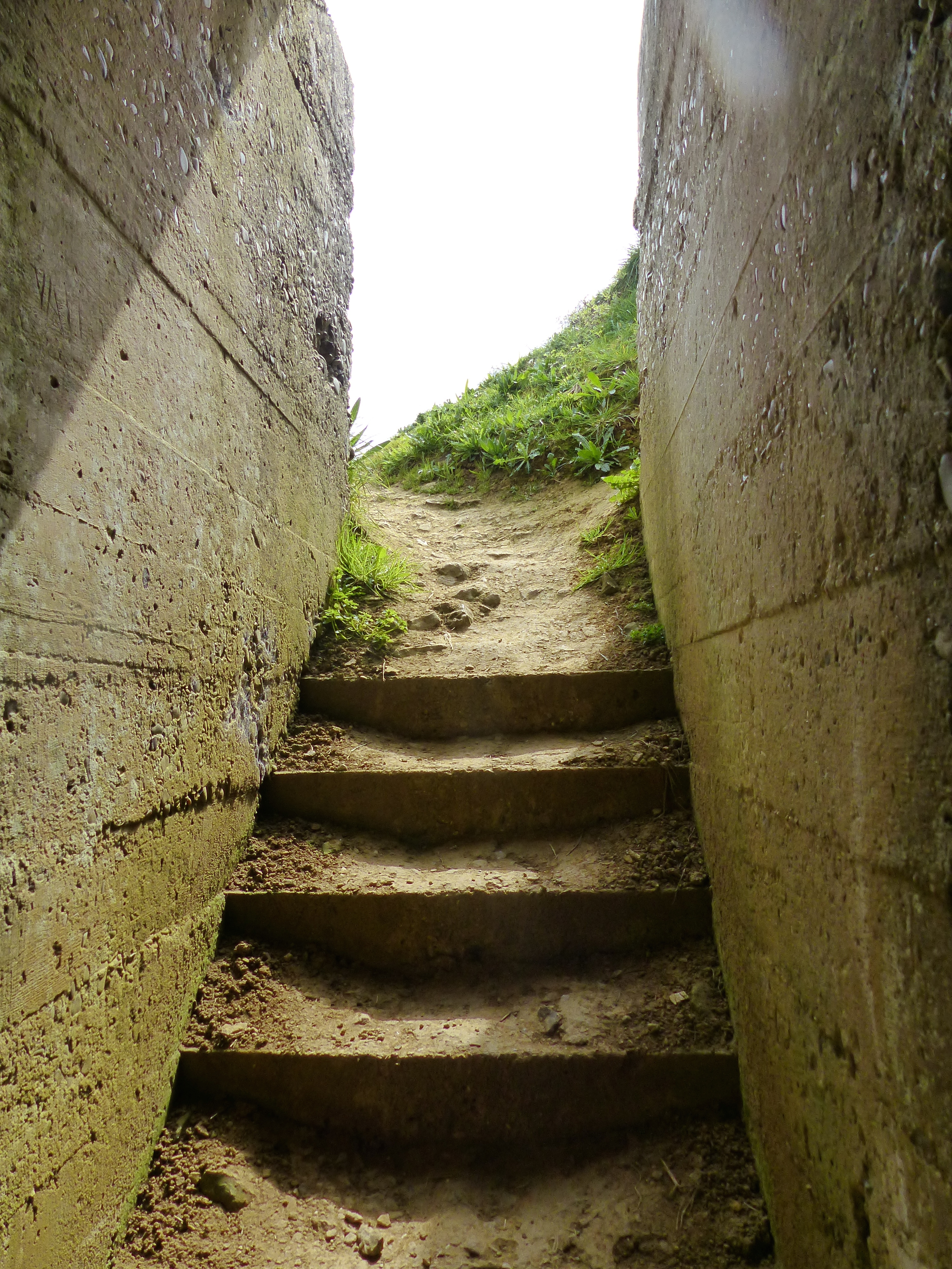 When we left the cemetery we rode around for a while to find Steve some lunch, then pedalled up another hill to sit beside a monument atop a cliff, looking down over Omaha Beach. We ate our lunch, reading the names on the monument and the information plaque nearby and just chatting about what we’d seen and the events that took place there. We were also sitting right beside another German artillery bunker, sitting in such a prime location on top of that cliff, overlooking all that would have been taking place on the beach below.