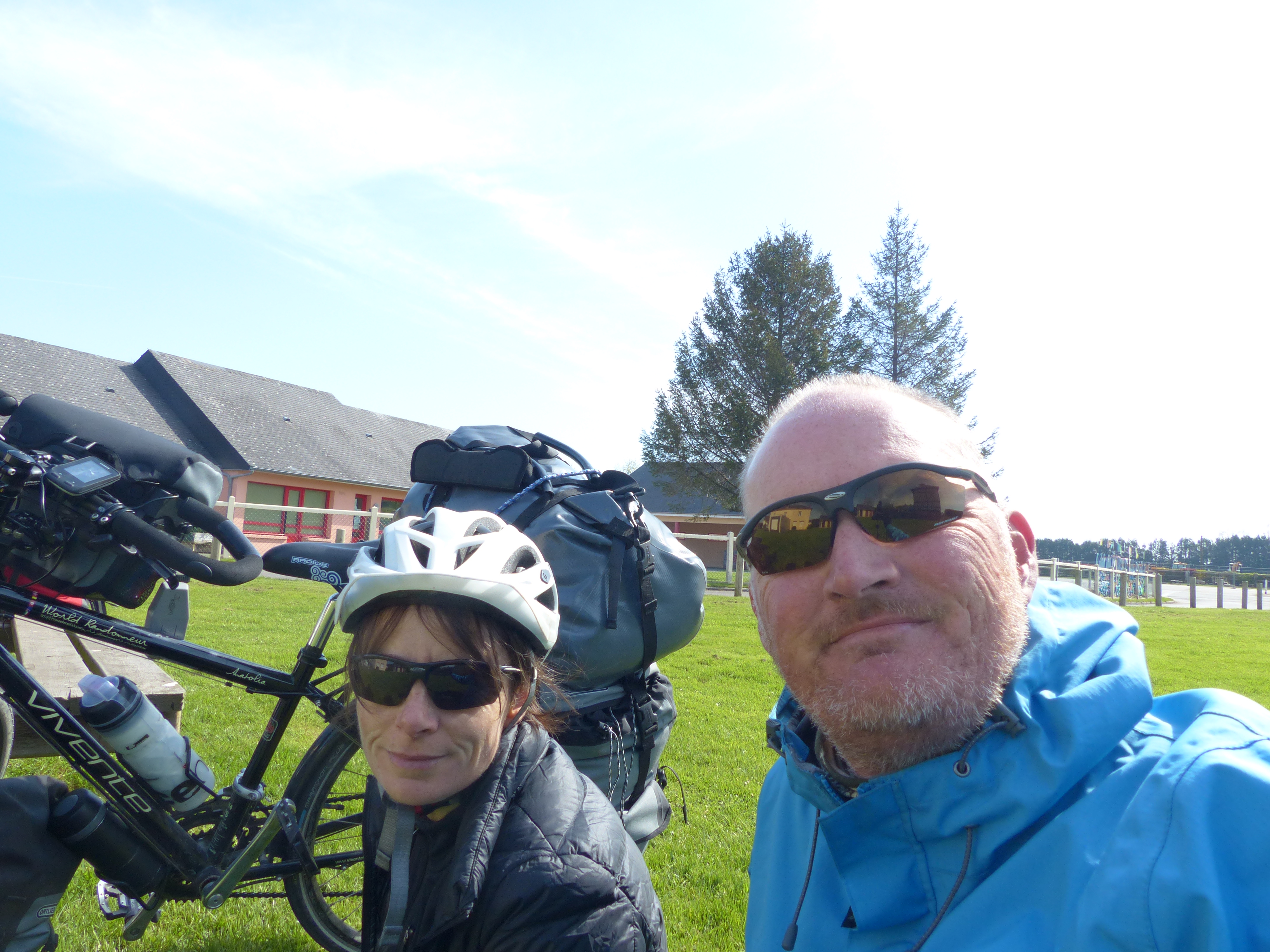 As we were sitting on the side of the road, a driver stopped with a concerned look, obviously wanting to know if everything was OK. We smiled and gave a wave and a “Merci” and tried to assure him that all was well. It was nice of him to stop and check. I’m just really glad there wasn’t a car behind me when I fell, because I don’t know if it would have avoided me, since I did end up all over the lane of the road and then lying there like a prize piece of useless, unable to get out of the way. We picked up the bikes and stopped up the road in a driveway to tape up my torn handlebars and fix up the panniers that were hanging off. So now I have a few more scrapes and bruises to replace the last lot I acquired during my last battle with the wind. The wind is not my friend!