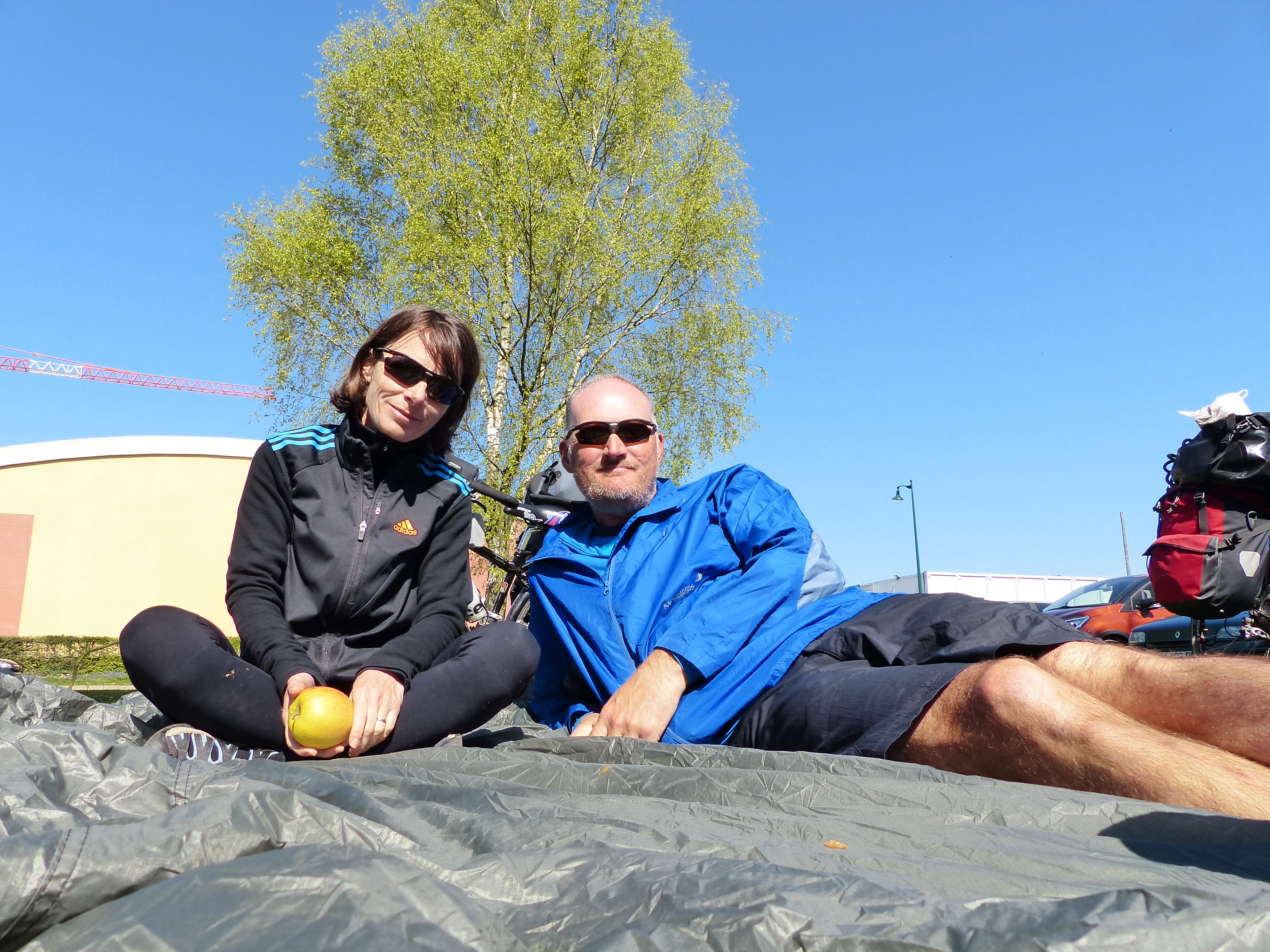 Nonetheless, we rode on into our pitstop of Forges-les-Eaux and found our campsite. Hmmm, it did not look open at all. A sign on the window of reception said it was closed from 12:00-2:30 and since it was 1:00, we decided to sit on the grass, have lunch and wait for it to open. We spread out our little travelling tarp, sat behind a shrub to get some shelter from the wind and had lunch and soaked up some of the sun’s warmth. At 2:30 Steve went to check out what was happening at the campsite and I started packing up our things. He soon returned with the words I did not want to hear, “We need Plan B.” I knew it! I knew this was going to be too good to be true! The campsite still wasn’t open and Steve had done a walk around and said it didn’t look like it was in operation at all. I had visions of us riding on another 40km to the next campsite and I have to say, the thought did not thrill me. Steve was already on the smartphone, looking up Plan B alternatives and found a hotel in the town that was bike friendly. So we activated Plan B, given there were no other campsites for another 40km and we are now staying in a ground floor room at the town pub, right next to the room that stores the bikes, so it is all good in the end!