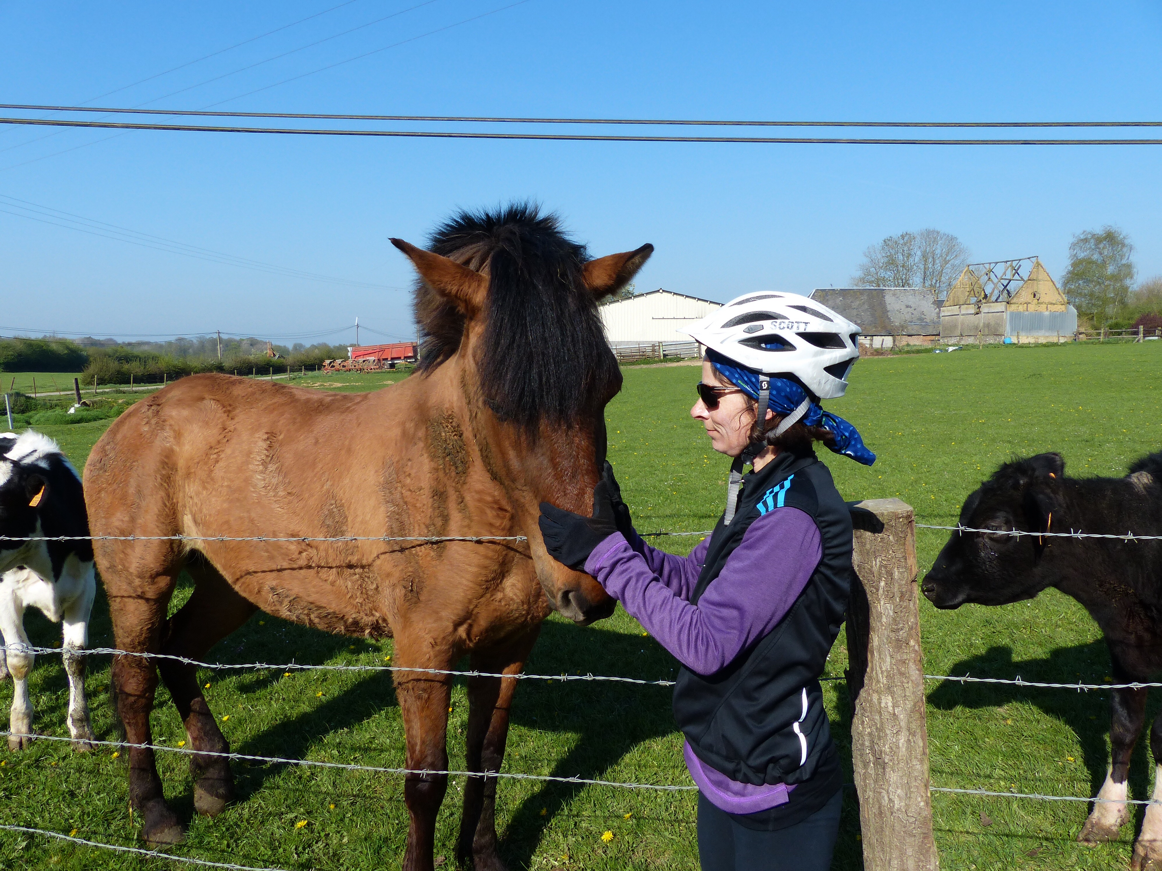 I was starting to feel the hills a bit and the darn wind was blowing hard again and starting to dim my mood somewhat. As we turned a corner, I saw a horse in a paddock and pulled over to say hello. Well, it was so friendly I stopped and gave it a pat and a nose rub, which it seemed to lean into and enjoy. Then the calves came up to see what was going on. I’ve discovered from chatting to the neighbours’ calves at home, that they seem to like it when you blow up their nose, maybe their mum does that, but they always seem to wander over blowing their noses, so I just blow back at them! They seem to like the greeting. Anyway, I said hello to the calves with mutual nose blowing and then the horse thought it would like a bit of the action too, so we all stood their blowing and snorting and having a lovely pleasant introduction! After that, I can’t tell you how much my mood lifted! My legs felt fresher and my head felt lighter and it just goes to show what animals can do for positivity and how much I’m missing animal contact!