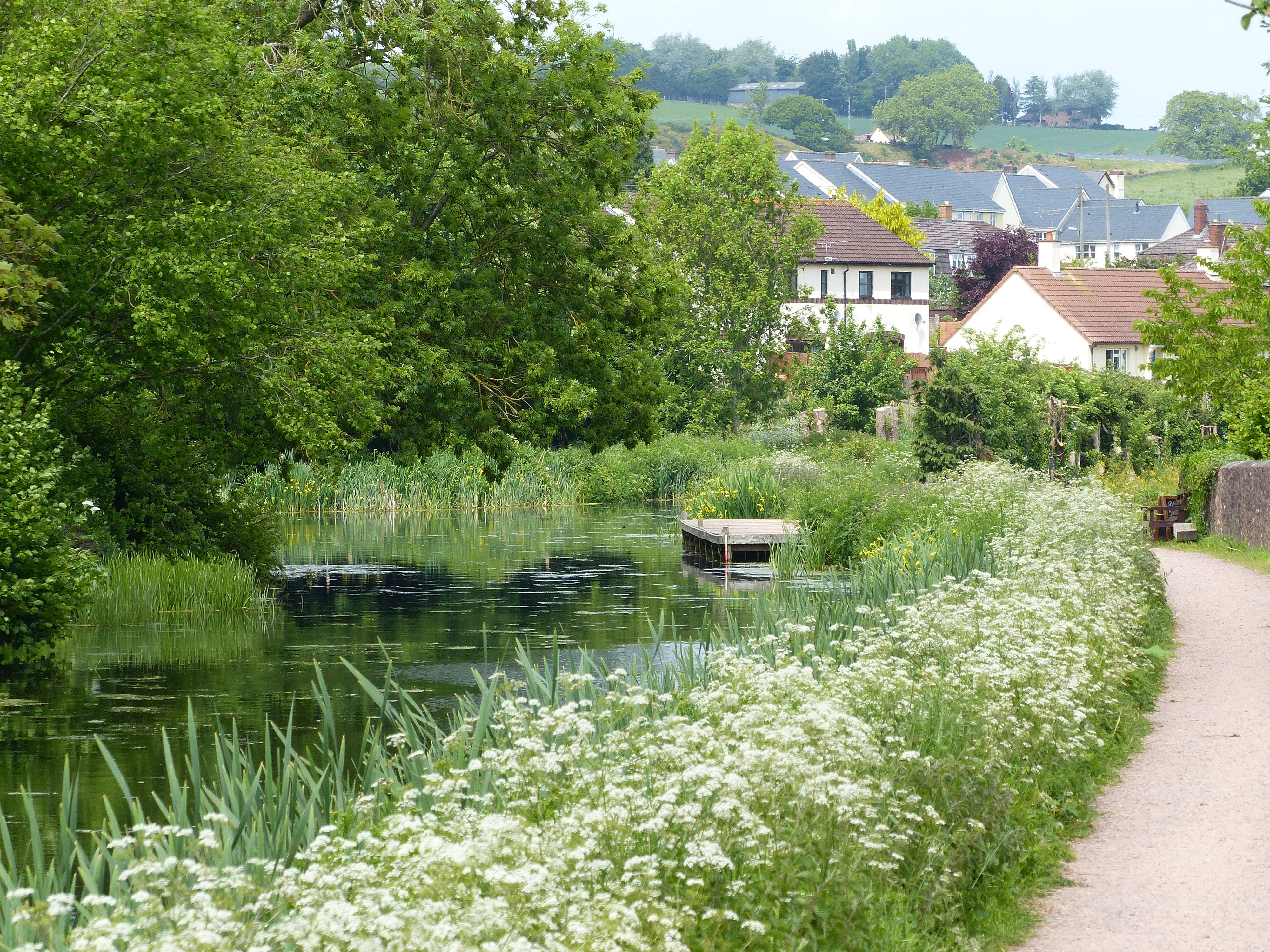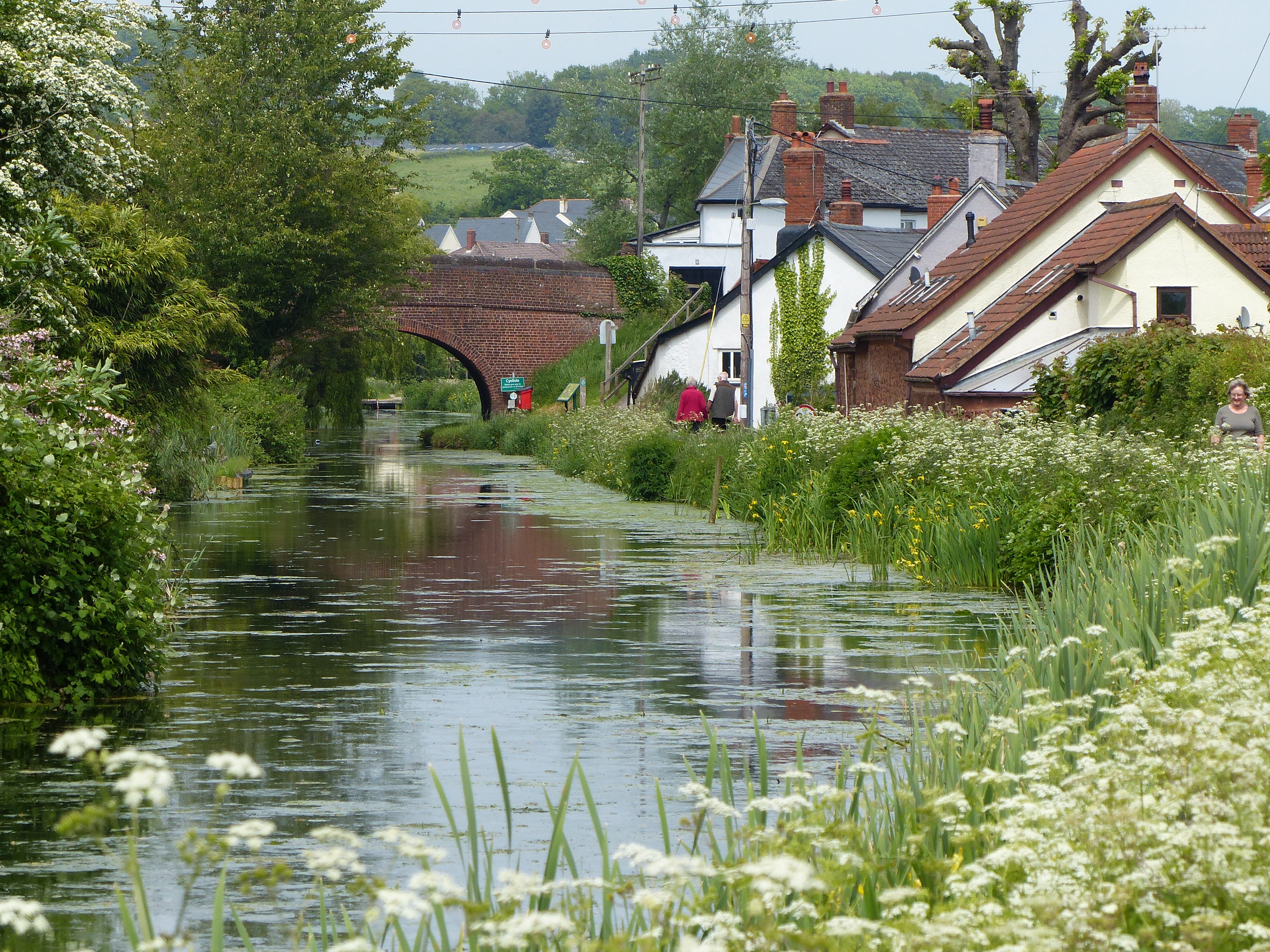We rode into the small town of Cullompton and stopped in a park for lunch while we researched possible campsites in the area. We found one that sounded nice, just another 9km away, so off we went. The route then took us back onto our favourite path…beside a canal! It was so pretty and we merrily pedalled along the tow path, saying hello to passers-by. “We’re back where we belong,” said Steve. We have certainly loved our rides along canal paths and this one was no exception, it was lovely, with the sun still shining and the trees and flowers beside the water’s edge. Perfect!