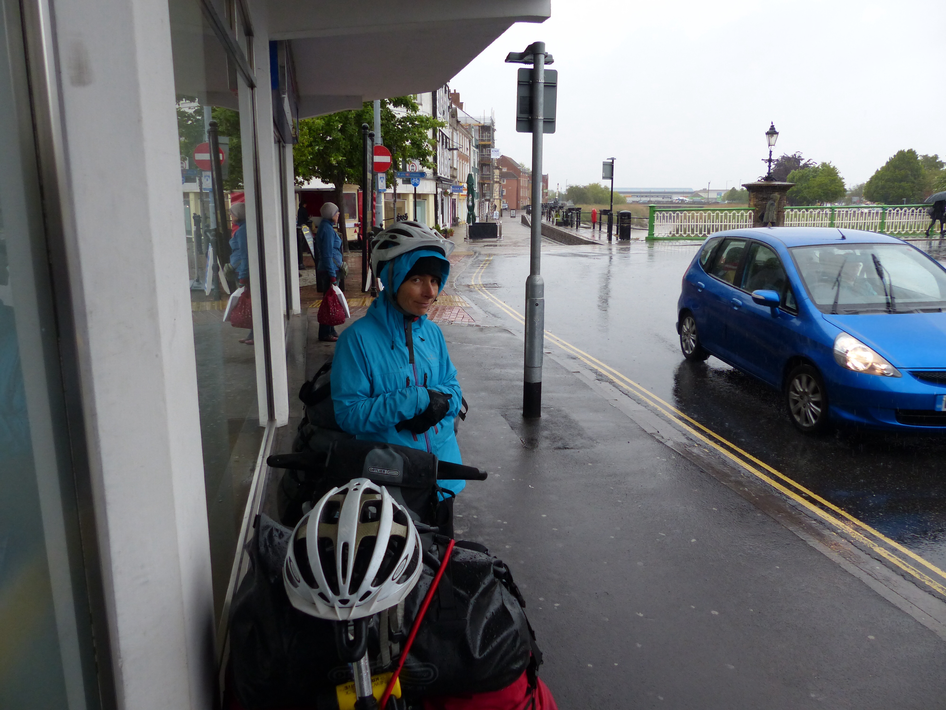 We headed off and as we were walking through the main street where a market was being set up, the rain started pelting. I mean absolutely PELTING! The wind was blowing the rain full on into us, so we headed for an overhang in front of a shop and joined the crowd of locals doing the same thing. We eventually went round the corner and found a cafe to sit it out. The cafe was definitely more “caff” than cafe, which was great because one of the things I’d said to Steve when we arrived in England was that I wanted to go to a fair dinkum “caff” and have a mug of tea. So this morning I got to do that. We sat by the window where we could watch the bikes and I had my mug of stewed tea, while we watched the rain pouring down. While we were there, a bit of drama occurred. The owner’s teenage son had a seizure and his dad was behind the counter on the phone to the ambulance service, describing what was happening, while the poor boy was on the floor behind the counter, seizing. The paramedics arrived and parked the ambulance outside the cafe and then calmly dealt with things, as the boy began to come around. We sat and watched the cars, on the very narrow street, edging their way past the ambulance, which was parked slightly on the road, and part way on the footpath. Then a man came in and, as the paramedics were still dealing with the boy, said that the door of the ambulance was blocking traffic and could they do something about it. I loved what the paramedic said…”I’m really not fussed to be honest. I’m dealing with a poorly child here and I really don’t care about the traffic.” Good answer! I held the door open for the paramedics to wheel the young boy out and then turned to the owner and asked if he’d like us to leave, thinking he may want to close, but he said we were fine and to stay, but we quickly finished our cuppa and set off into the rain which had, thankfully, eased somewhat. The poor boy looked quite dazed, so I hope he’s OK.