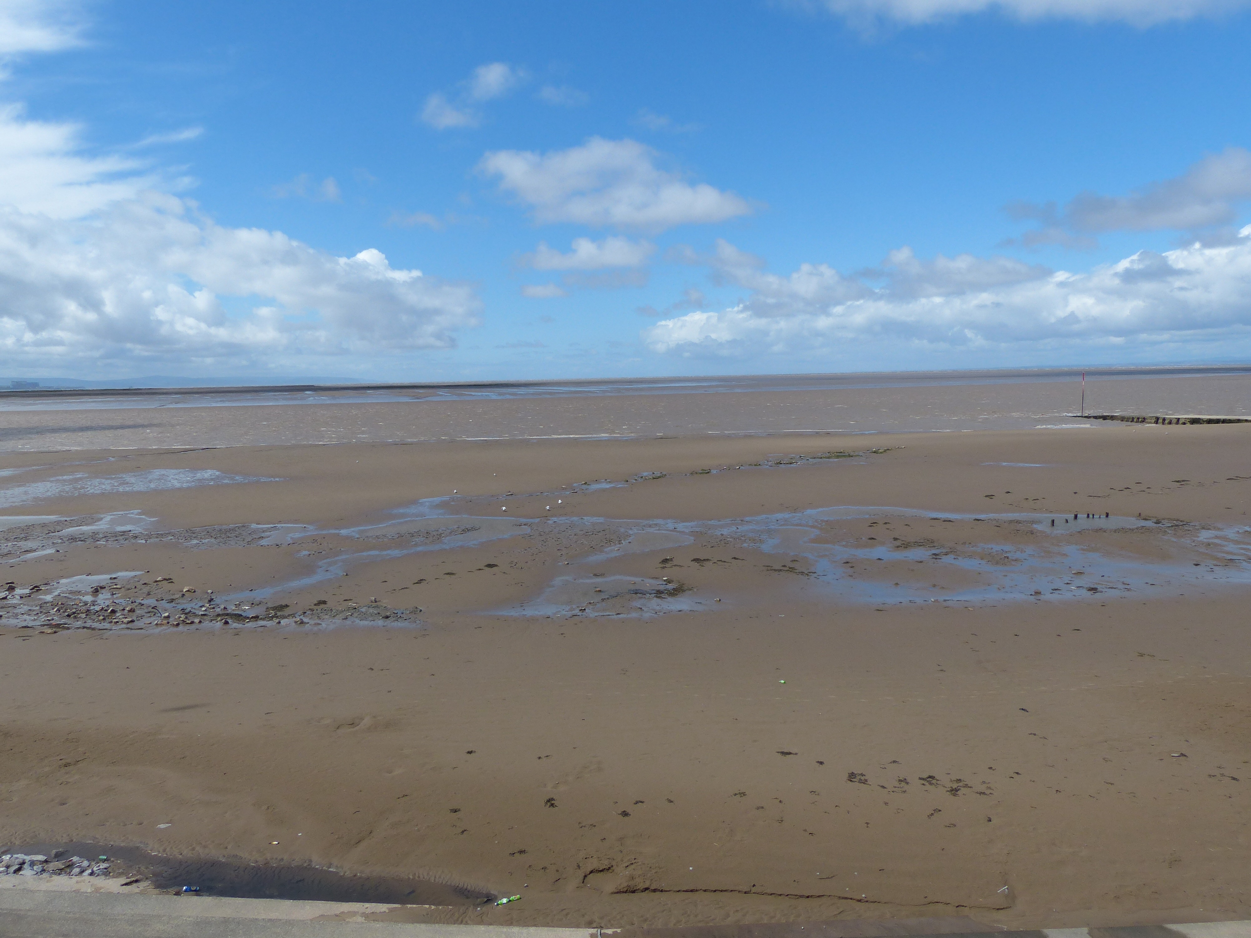 We rode out of Bridgwater along a bike lane, but it was beside an A road and the traffic was really busy, so it wasn’t quite the quiet and picturesque ride we’d been used to. We rode into the seaside town of Burnham on Sea and the rain had finally stopped but, unfortunately, had handed things over to the wind! Man-o-man, that wind must have been blowing in from France because it was fierce and was back to pushing and shoving me about. We blew along the promenade and stopped at a fish and chip shop, where Steve partook of a plate of chips, while I ate my imported peanut butter sandwich and we watched the locals and visitors and holiday makers coming and going. It was cold and that wind was phenomenal, but there they were, sitting in the park and having picnics, walking along the sea front and sitting outside cafes in shorts and t-shirts! People back home would not be out doing that in weather like that!