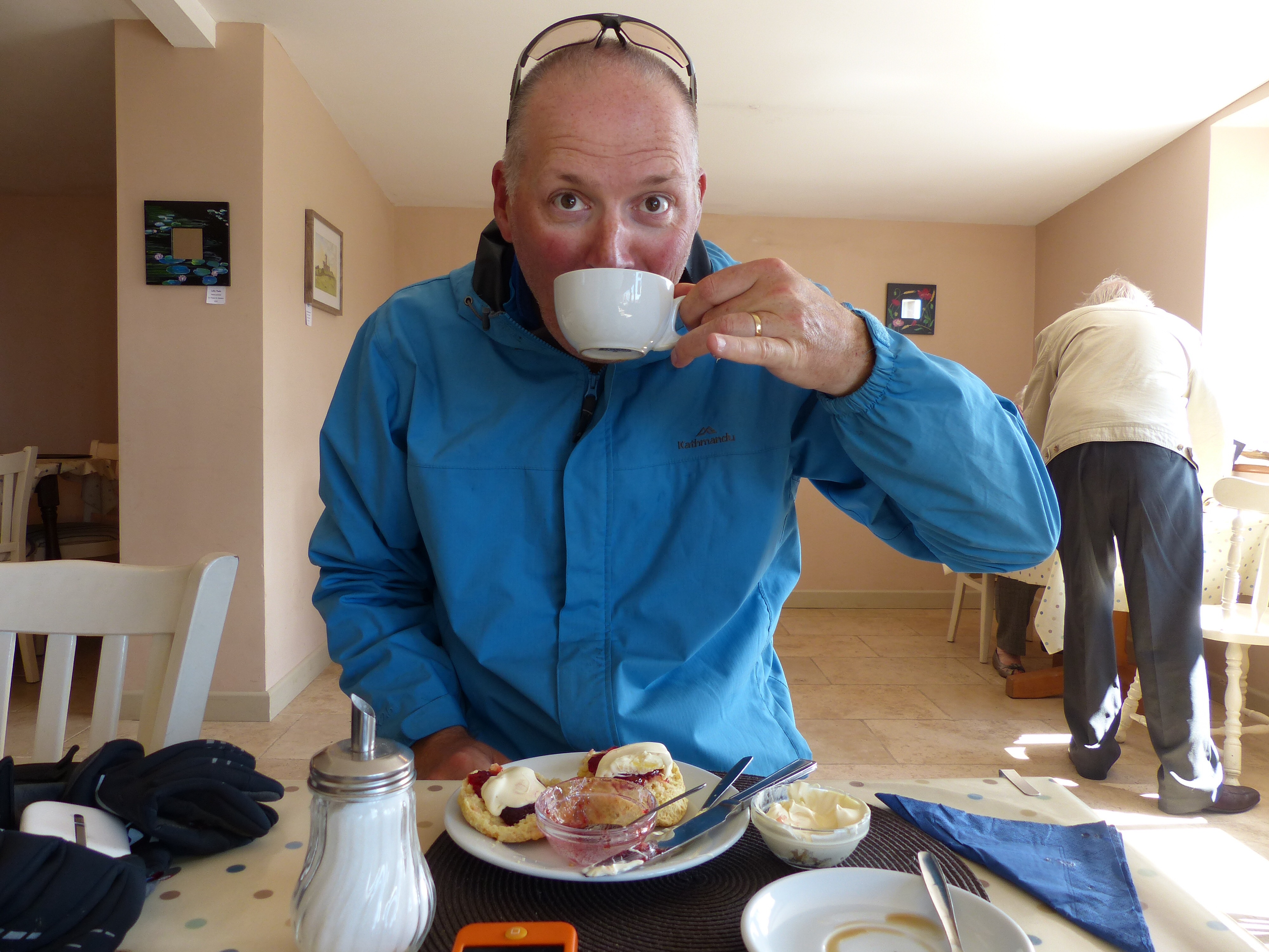 We stopped at a quiet little tea room so we could decide where we might stay and Steve tucked into a cream tea. He’d wanted to have a cream tea when we were in Devon, just so he could say he’d had a Devonshire tea in Devon, but he missed his chance because we ended up crossing county boundaries before he was able to have one. So he had one today, even though we are now in the county of Somerset.