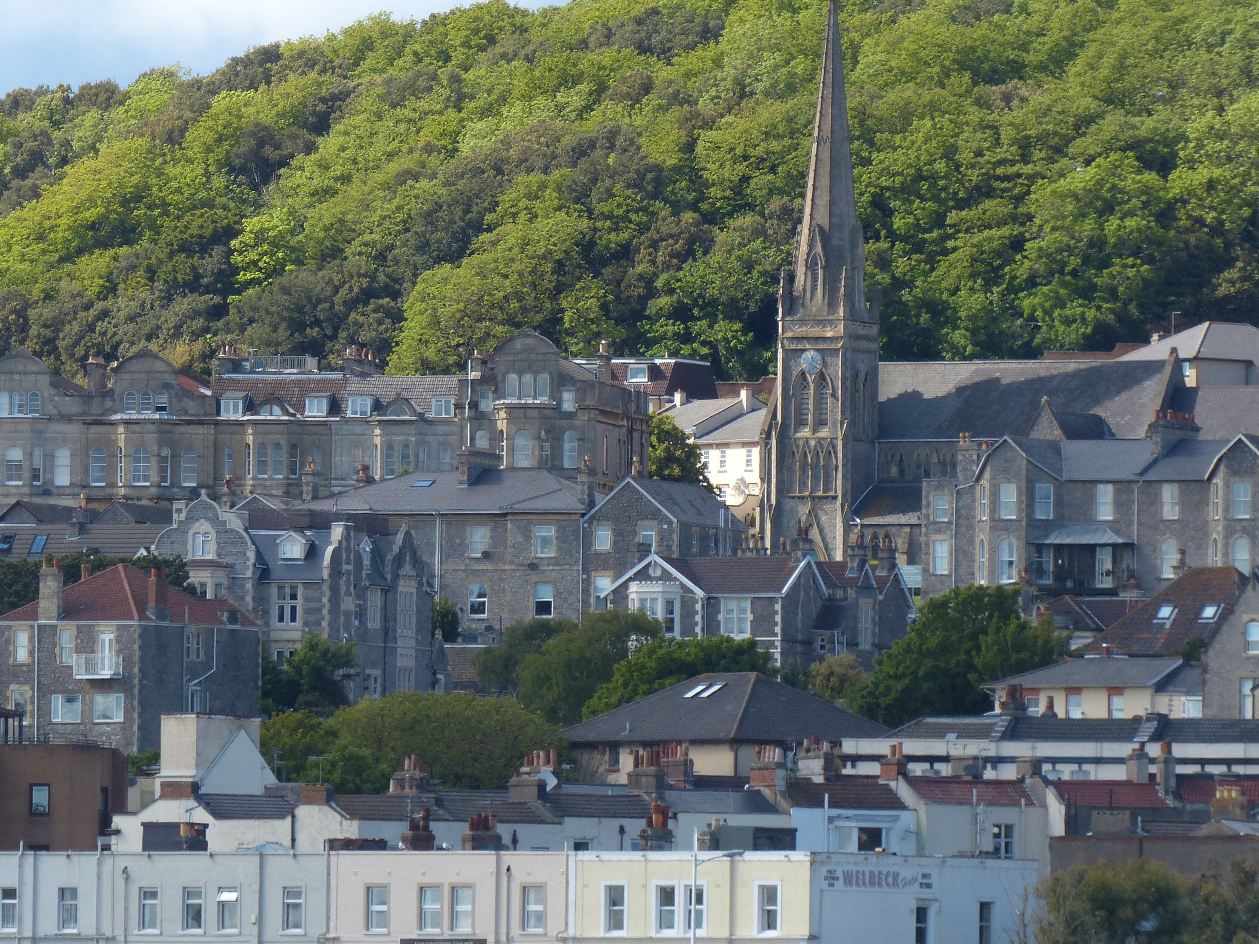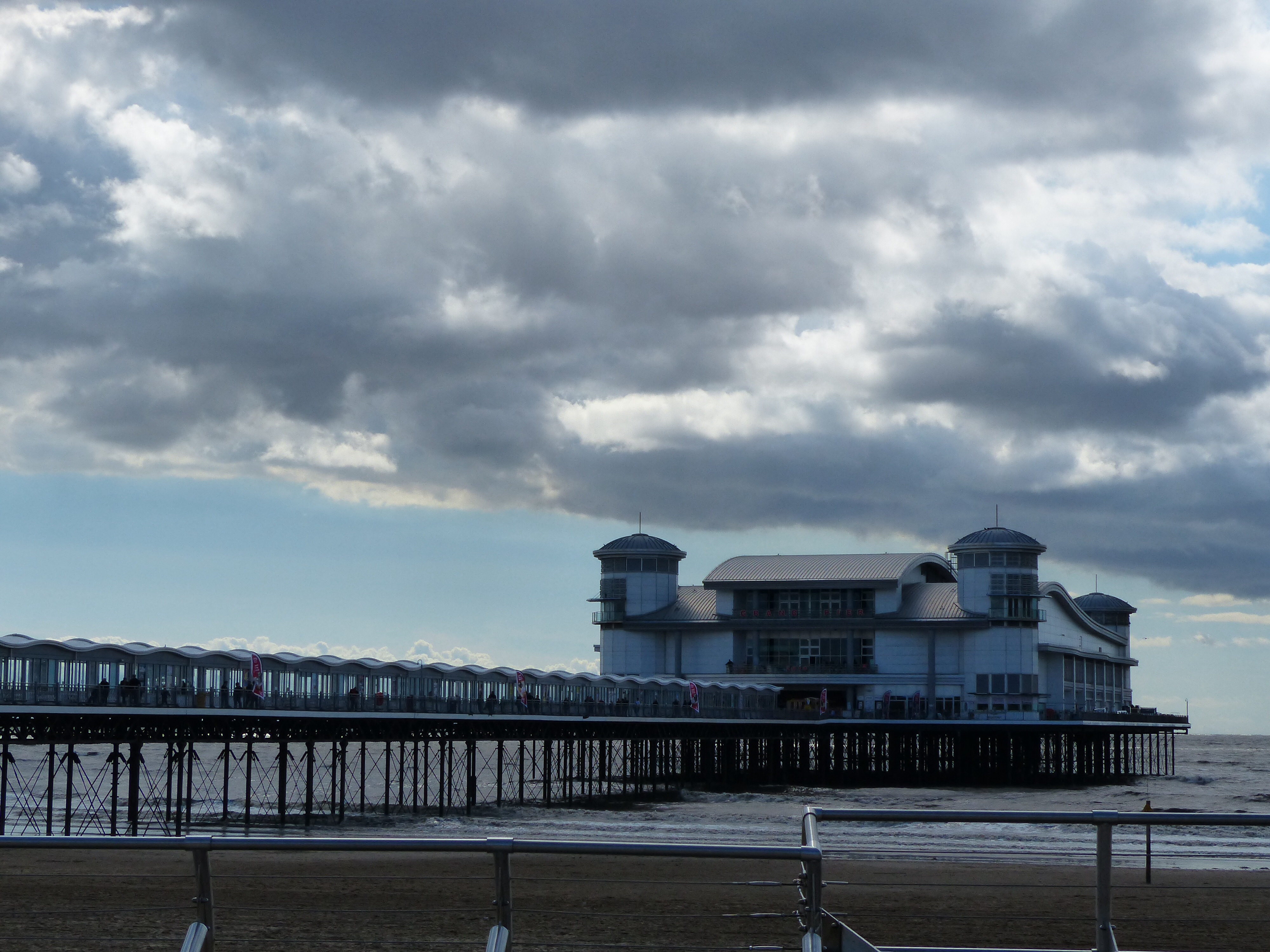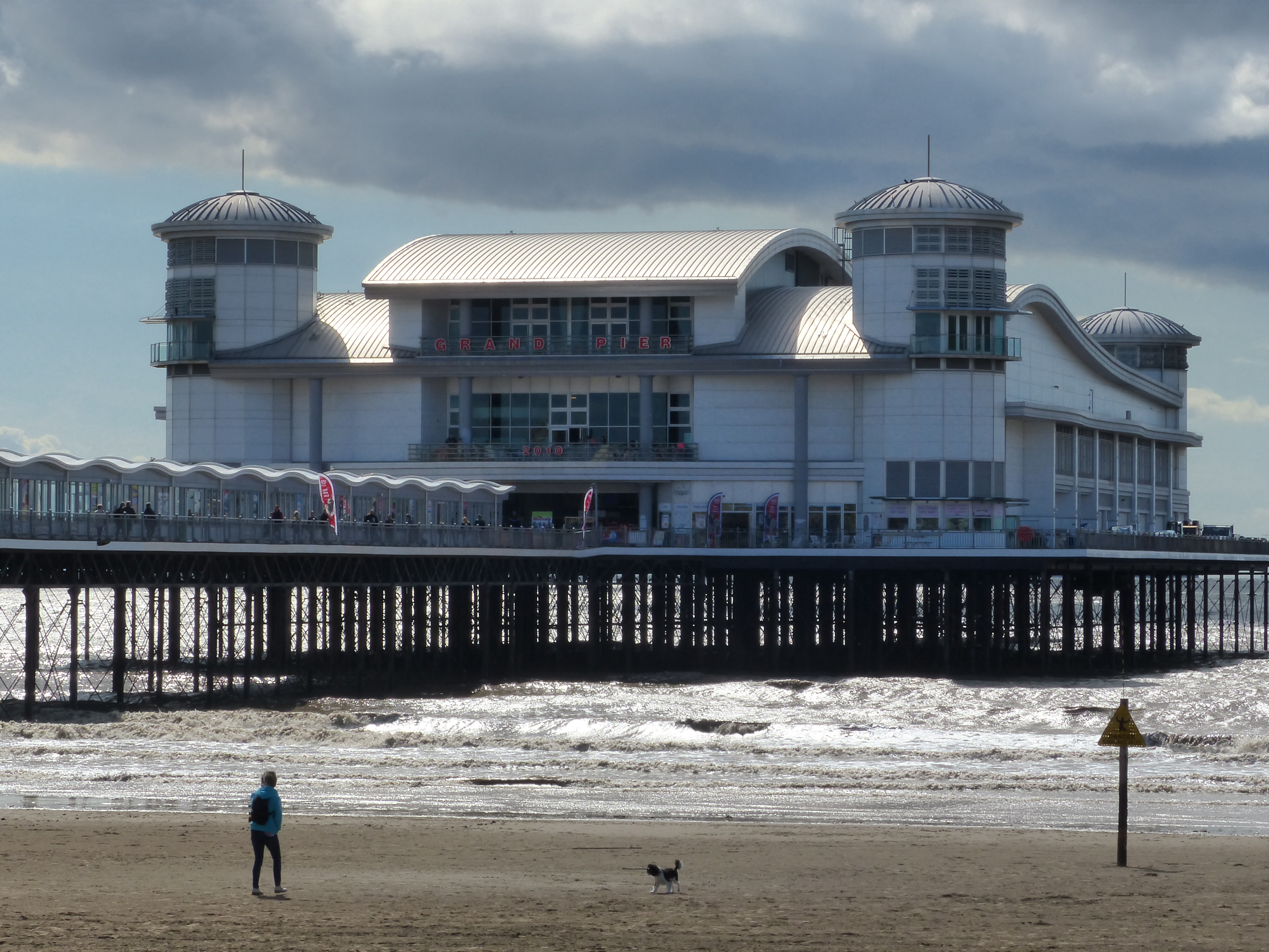With the wind howling as it was, we decided we’d need to be back in solid walls again and not force the little tent to stand up against the wind, especially after all the rain softening the ground so the tent pegs may not withstand the soft ground and the major shoving of the wind! We decided on a hotel and rode along the seafront of Weston-Super-Mare to find it. W-S-M is one of those classic English seaside holiday towns, with the tall, old hotels lining the seafront, the long pier, the big Ferris wheel and seemingly hundreds of ice-cream shops! We found the hotel and they were able to accommodate the bikes, so we wheeled them in. As I went through the door, I became a bit stuck, with the panniers caught on the side of the door. I heard a voice behind me say, “Hang on cock!” and a man came up behind the bike and gave it a lift and helped me through the door. Another nice person and some more of that classic British vernacular! Love it!