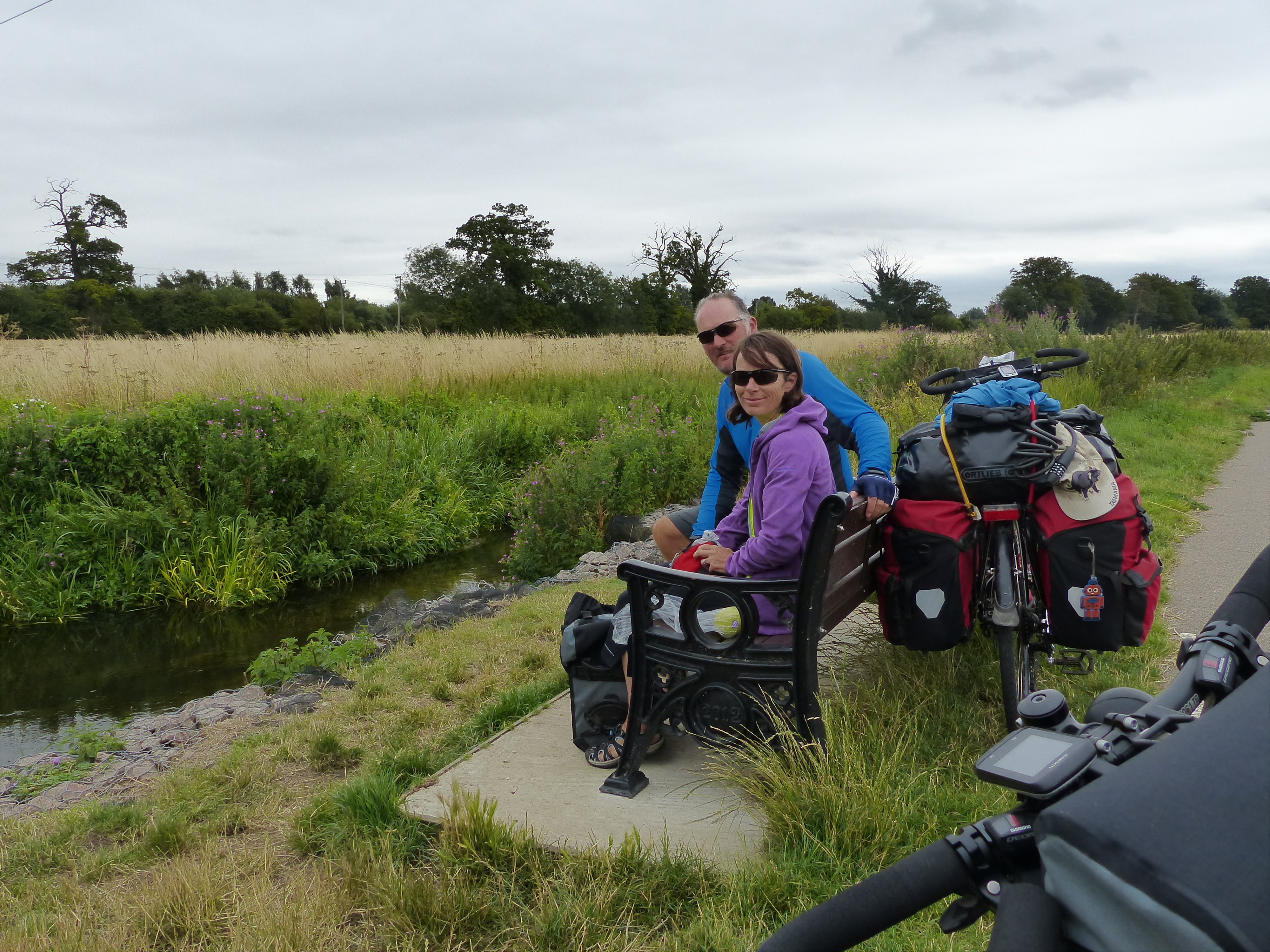 Our pedalling took us onto the National Cycle Network Route #11 and it in turn, it took us along a nice flat path, along the river and through some fields. We paused for elevenses in a nice spot on a bench by the river, had a snack and chatted about our experiences in Cambridge.