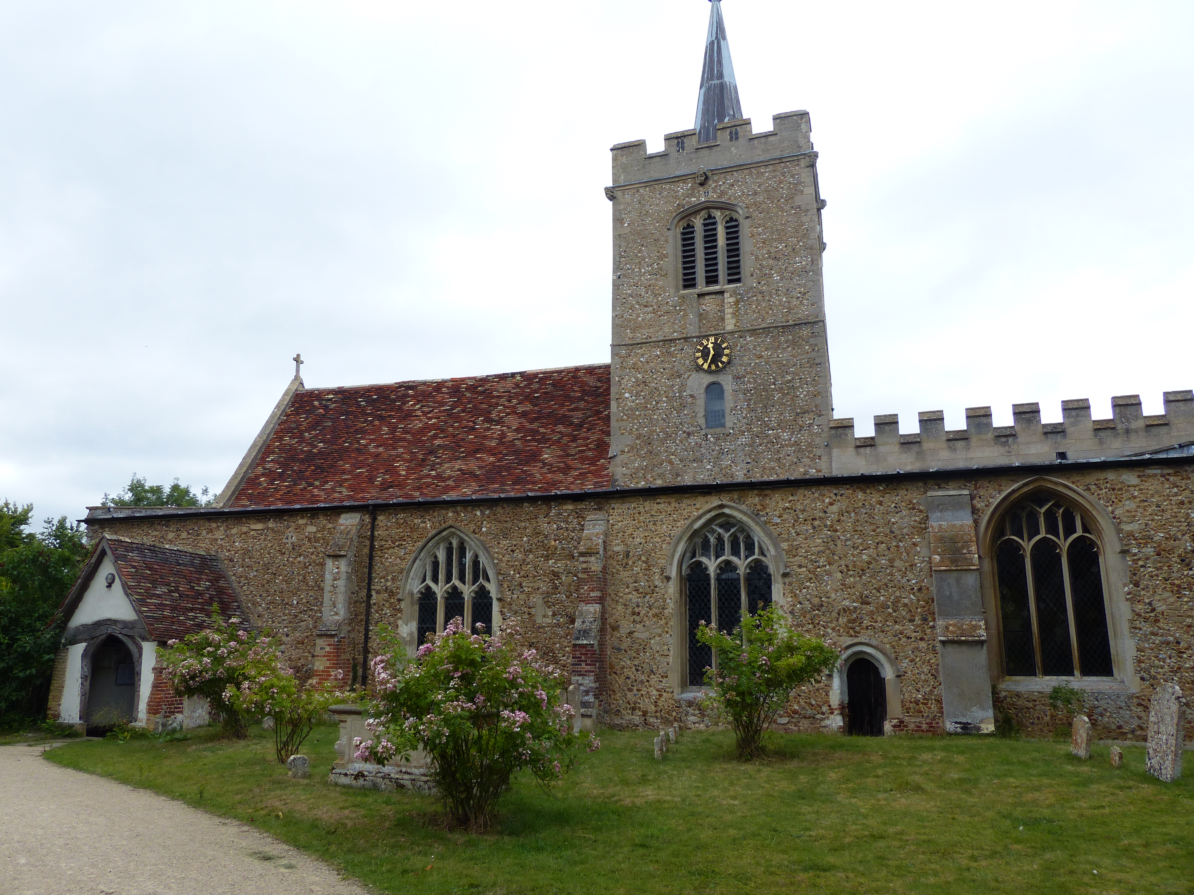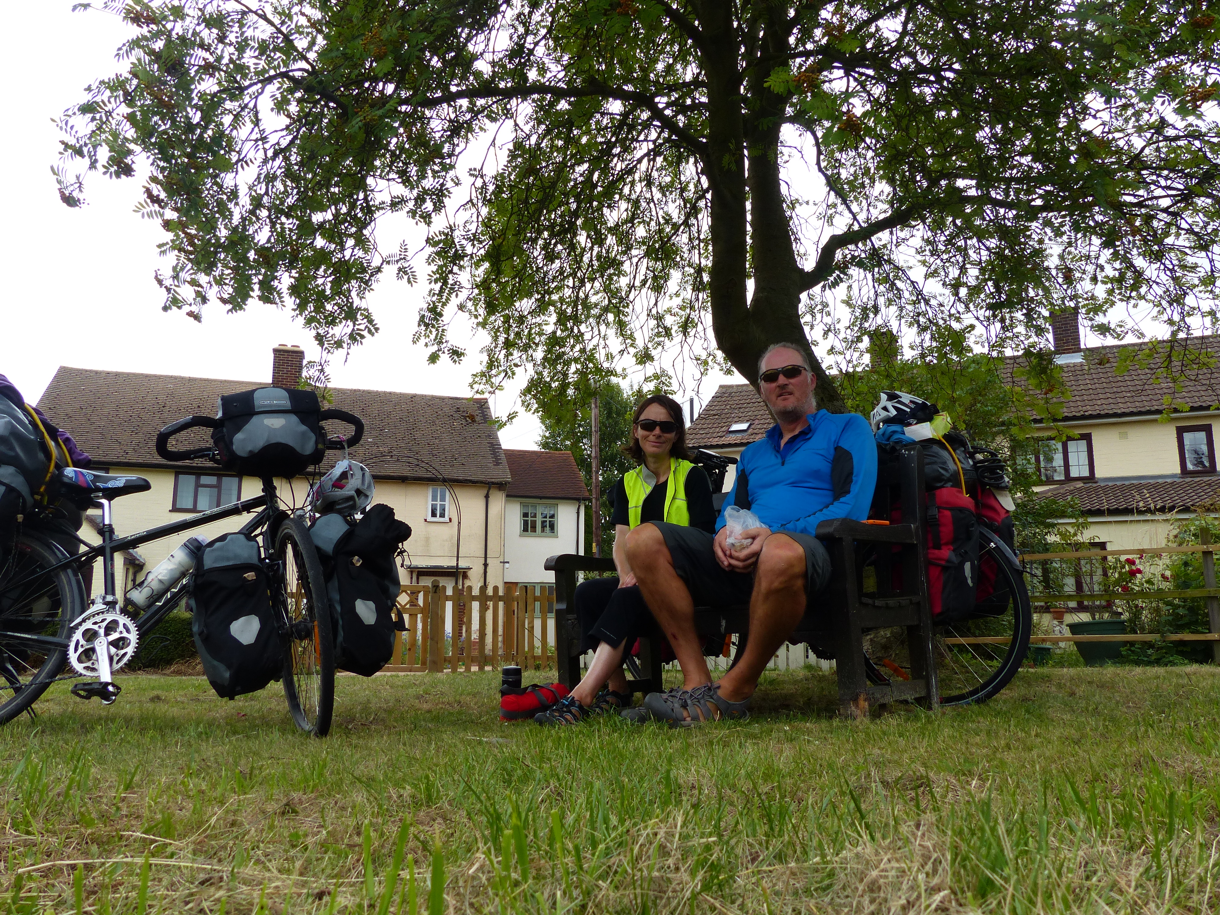 After leaving the surrounds of Cambridge, our nice flat path disappeared! Disappeared I tell you! We’ve had days of flat cycling and it all came to an end today. Darn! As we headed into the countryside, the hills found us once again. The legs had to get back into a hill climbing frame of mind and power up those inclines. The hills did bring with them some nice views though and we rode through some delightful little villages too. We stopped for lunch in a small park in front of a row of cottages and sat under a tree for a bite to eat. We were joined by swarms of little flying bugs, which of course seemed to prefer me to Steve, as all flying insects seem to! We’ve had these little critters with us for the last week and I don’t know what they are, but they arrive in droves and land on me until I am speckled black. They don’t bite, they just tickle as they land, and get a bit annoying when they fly into my face, but they seem to be everywhere. We don’t know what they are, but they joined us again for lunch today.