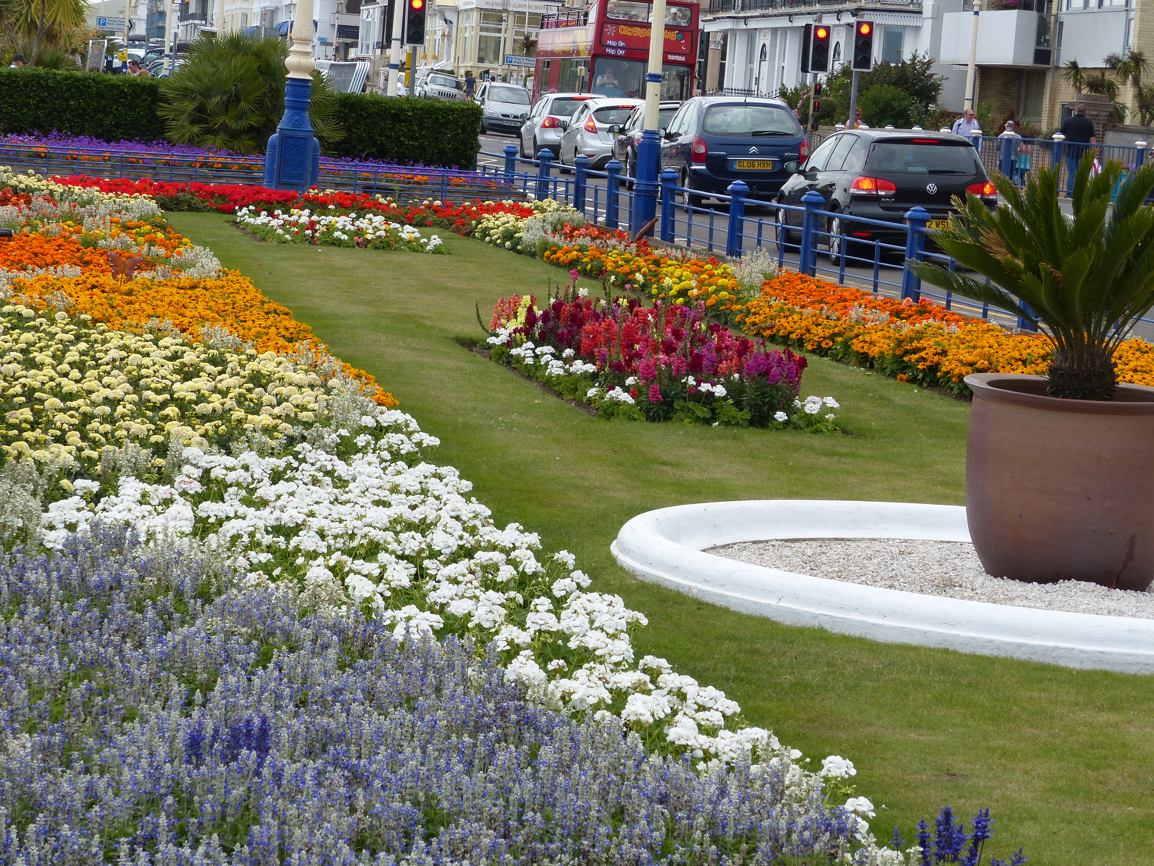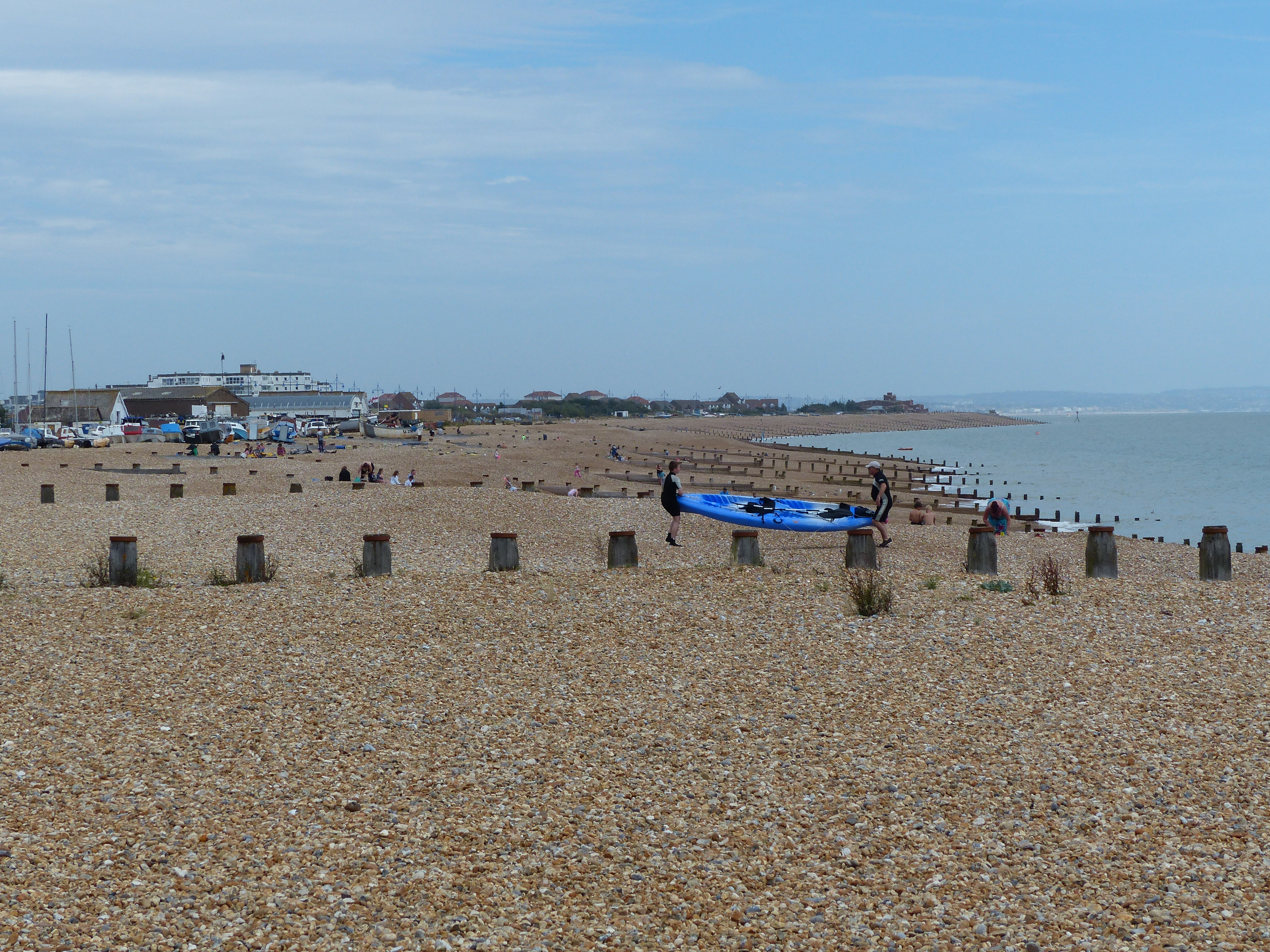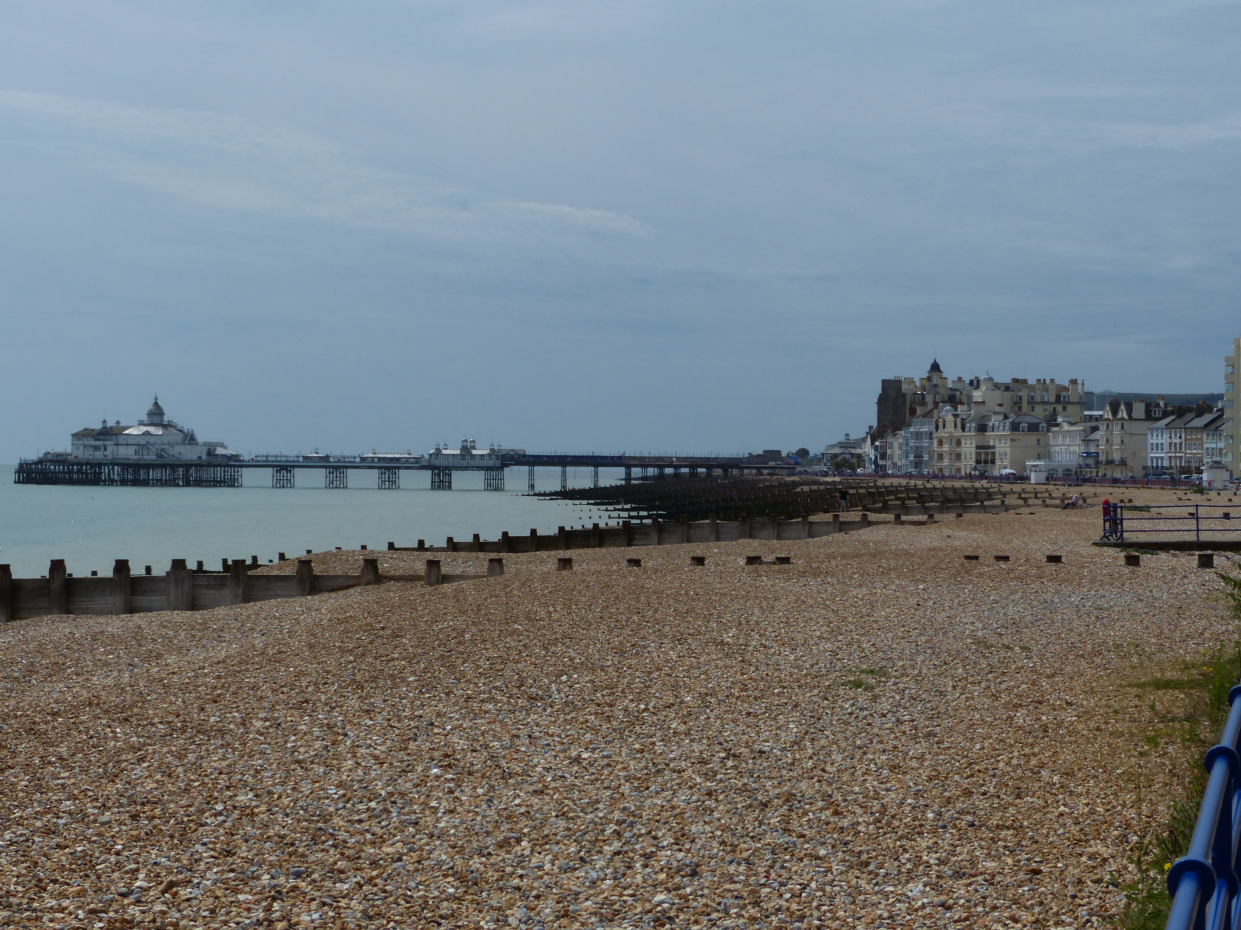 We walked the bikes along the promenade and then, as it was past lunch time, we decided to blend in with our surroundings and have fish and chips by the sea on the promenade. Our supplier of this fare had to be Harry Ramsden’s “world famous fish and chips”. Who could pass up something “world famous” in the heart of Eastbourne! 🙂 We didn’t opt for the fish, but we had chips and I had baked beans and mushy peas too – in for a penny, in for a pound! We sat with the locals, looking out to sea and at the people enjoying their day on the pebbly beach. We had some psycho seagulls to entertain us, who were becoming very pushy with anyone who looked like they may be a walking seagull buffet. I noticed children walk past and hide their ice-creams behind their backs until they’d passed by the seagull gang, so I think the bullyboy seagull behaviour was well known and evasive action was taken, lest an ice-cream become a victim to their squawking jaws!