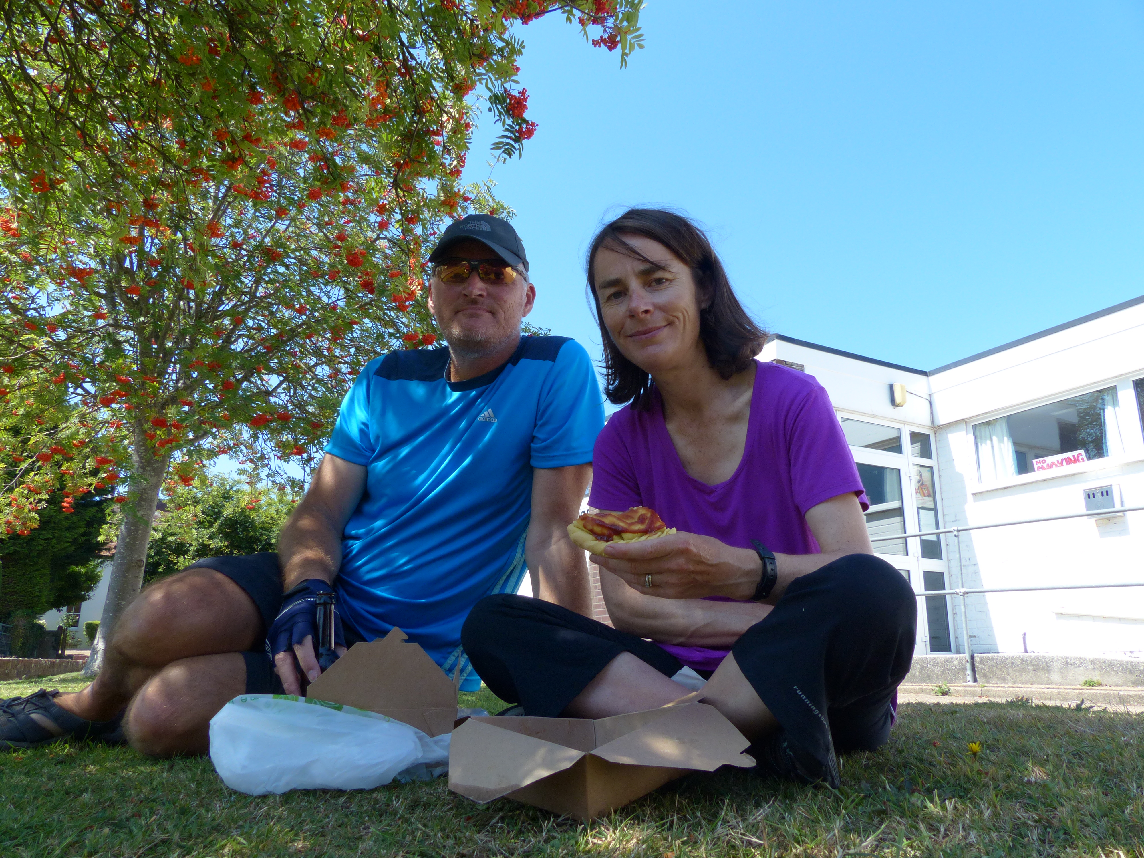 Our lunch yesterday had been so scrumptious, that before leaving Eastbourne we had called into Oh My Goodness again to pick up some lunch for the road. Riding into the town of Pevensey, we passed a bench beside a small park and stopped to tuck into our vegan feast. A Cornish pastie each, a piece of banana and caramel cake for me and a piece of chocolate mint cake and a bottle of ginger beer for Steve. It was a hearty and DEE-LISH-US lunch, and we ate it sitting in the sun and mottled shade of a tree. Perfect.