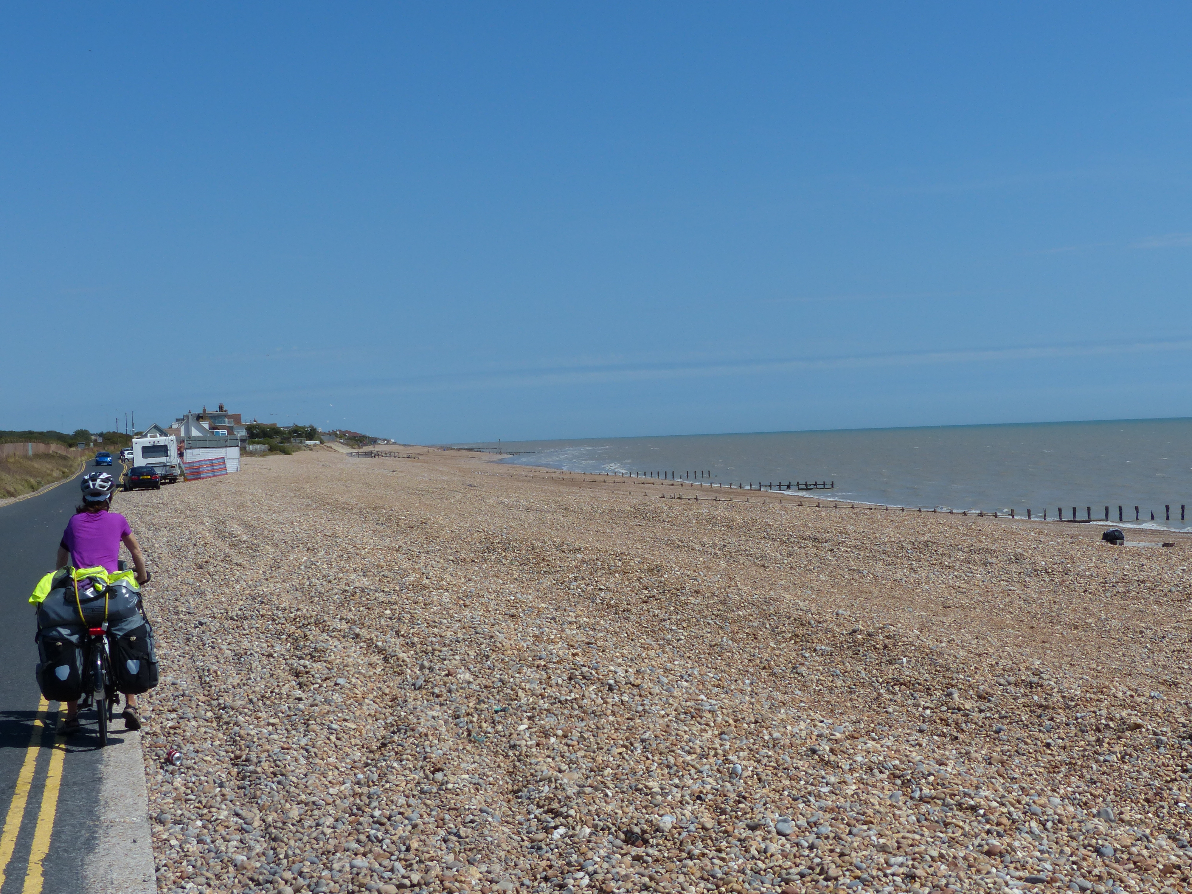 On we went, with some road riding along a narrow country road, with the ocean in the distance. We rode alongside pebble beaches, with motorhomes lining the edge and people sitting on deck chairs.