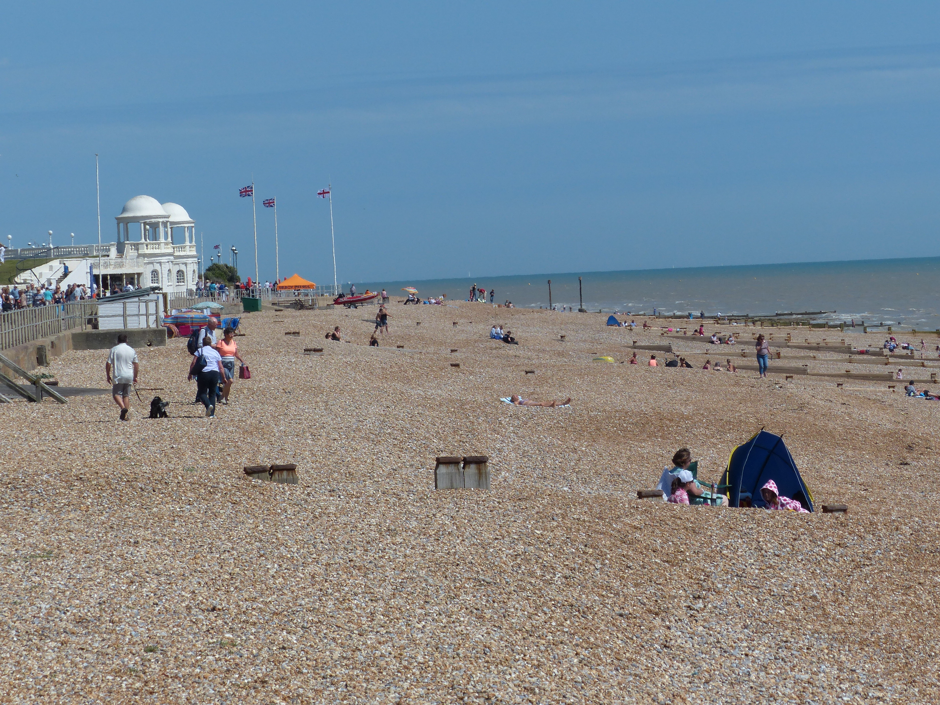 Then we entered Bexhill-on-Sea, which looked a bit like the Costa del Sussex! There were people everywhere, of all shapes, ages and sizes, showing varying expanses of white wobbly flesh, pink tinged by the sun or reddened like a lobster fresh from the pot. Everyone was happily grilling themselves on the beach or benches, with chests, faces and stomaches spread heavenward to the glorious solar miracle that had appeared before them today. Skimpy clothing was the fashion of choice for the young, confidently doing the “cellulite strut” down the boardwalk. The older folks chose to stick to their sensible but seasonally appropriate gaberdine shorts and bucket hats. No matter the age, shape or size of the people though, everyone was tucking into ice creams and the vendors were doing a roaring trade. Tongues were flicking this way and that in a hurried and vain attempt to beat the inevitable melt down the wrist of their vanilla swirl. The sun invariably won and no amount of licking and twisting of those cones was going to stop that glorious heat from turning their precious mountain of dairy, into a flowing stream over fingers and wrists. Everyone was having a marvellous time!