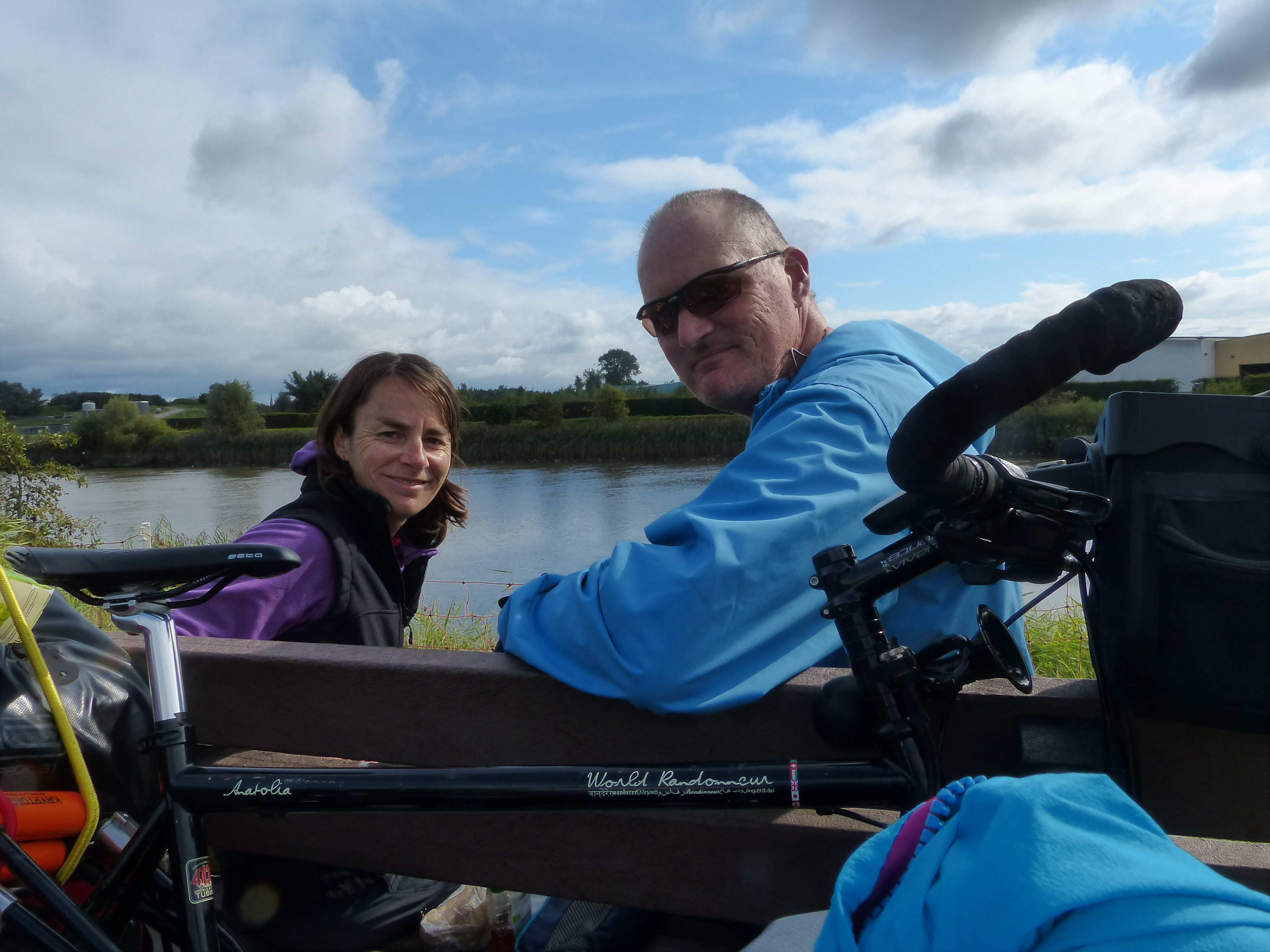We hit the town of Dendermond and the path changed to one beside the river and that was great. We powered along and it was a really nice ride, with the river beside us and the barges chugging along. We did have company though…a huge black cloud was looming in the distance. We stopped for elevenses on a bench by the river and watched the river traffic chug past.