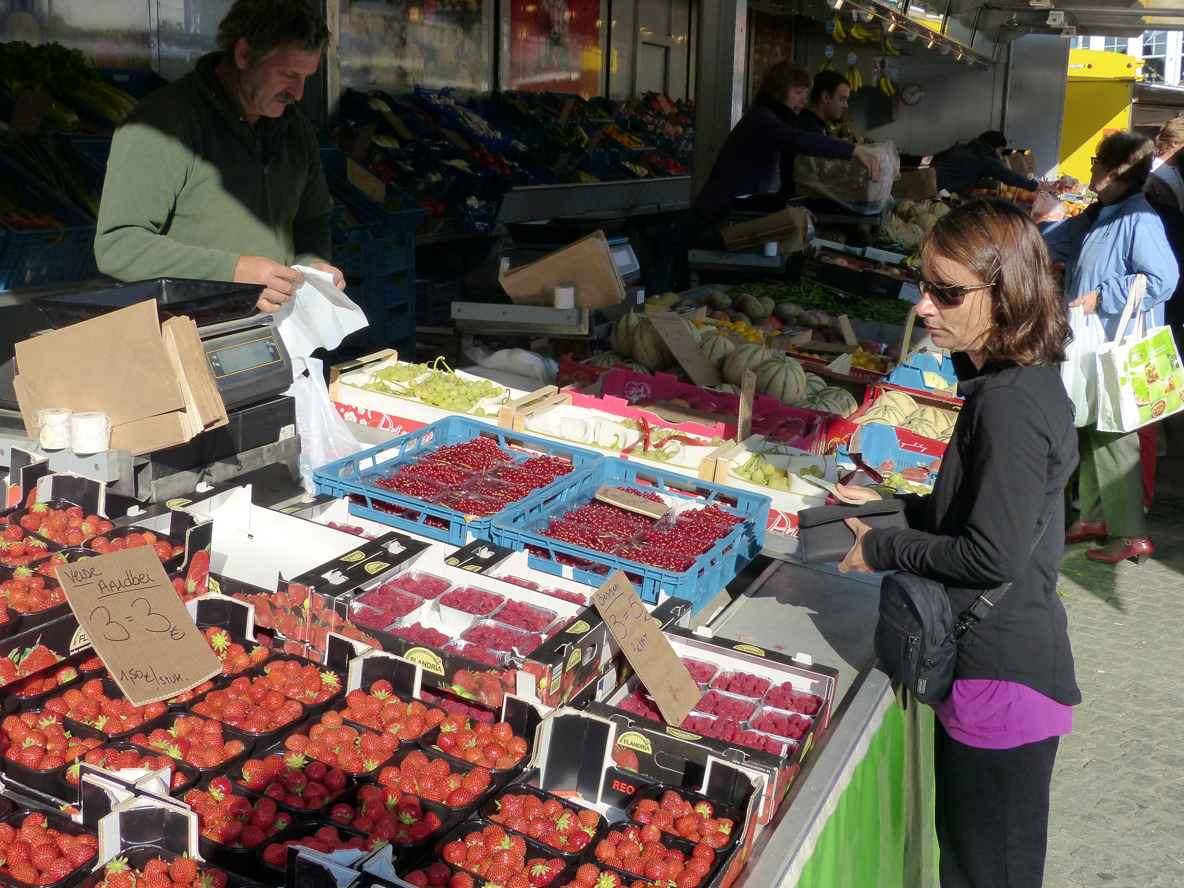 I was standing and waiting to be served, when an elderly man stood beside me. I moved aside to give him some room, but he said, “ something, something, something, something, No, no Madame,” and gestured with his hand for me to stand ahead of him, because I’d been waiting. When I heard him call me “Madame” I didn’t know whether to try and reply in French or Dutch, so I did a bit of both and smiled with a “Merci, dankjewel” which no doubt just made me sound like a linguistically confused and thoroughly incompetent communicator. He then began speaking to me in such a friendly and jovial way, laughing and smiling. I laughed and smiled along with him, having not a single clue as to what he was saying, but trying to join in nonetheless. He tried to get the stallholder’s attention to tell him I was waiting, but he was busy serving someone else. My friendly gentleman, then began speaking rapidly to me again, with some chuckles and some gestures at the stallholder as if to say something about us not being served yet and not having the stallholder’s attention. I laughed and tried to use a smile, a gesture and facial expressions to communicate something along the lines of “No worries, it doesn’t matter, I don’t mind waiting,” and that nice gentleman had superb skills at interpreting the odd noises, gestures and apparent tics being exhibited by the strange, non-speaking short lady that he’d had the misfortune to stand next to. The stallholder eventually finished gathering the many bags of grapes, mushrooms and peaches requested by his customer and turned his attention in our direction. He looked to my friendly gentleman, as if to serve him, only to be given quite emphatic instructions to serve me instead, because I’d been waiting a while. The whole exchange and task only took a few minutes, but what fun! I couldn’t understand anything anyone was saying, but I’d just had one of the friendliest and chattiest encounters, without actually having to say anything! I just joined in with the joviality and after paying for my blueberries, I walked away with a huge grin on my face. I love that part of travelling! I bumble along, knocking on the communication barrier and sometimes breaking through, but mostly just bouncing off again. Still, I love getting in there, being with the locals and just doing the ordinary, everyday things they do, like market shopping. It also means I get to meet more friendly, delightful people, even if we can’t understand each other!