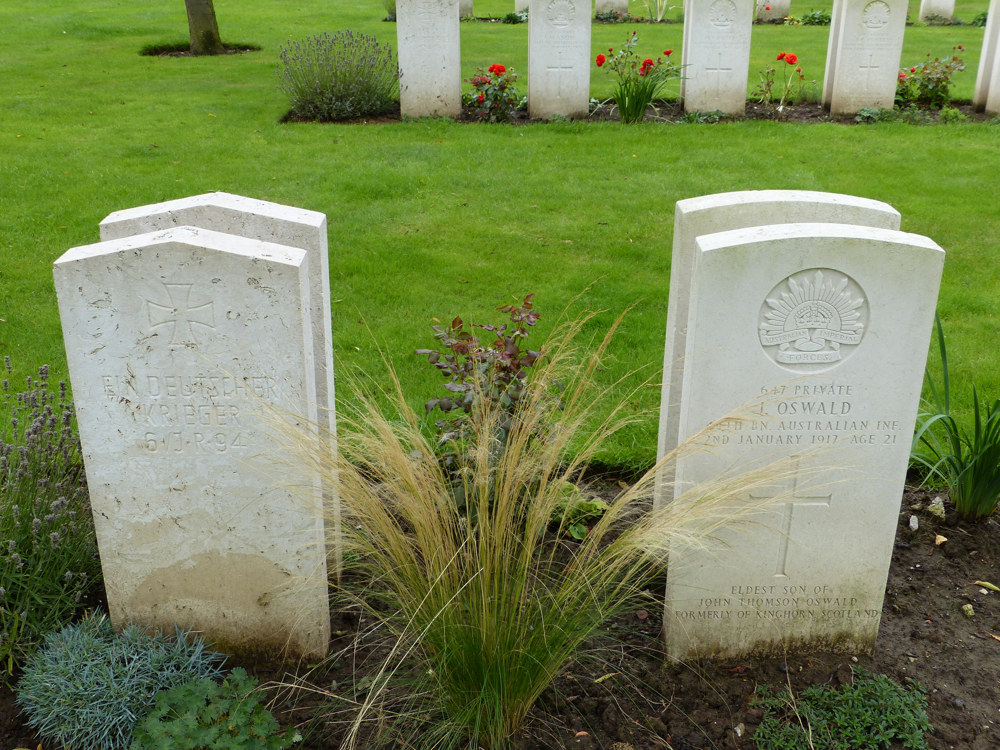 One of the things I found really interesting about this particular War Cemetery, was it’s the first one we’ve been to that had German graves too. They weren’t in a dedicated section, there were German headstones standing side by side those of men from the allied countries. There were names from Britain, Australia and New Zealand and then, the recognisable German cross on the headstones around them. It’s the first time I’d seen that. Those who had once been enemies on the battlefield, were now resting side by side for eternity and in peace. All of them someone’s brother or father or son, none of them wanting to have experienced the fear and horrors of the battlefield and certainly none of them wanting to end up in this place of final rest, so soon and so young. Enemies at one time perhaps, differences to fight over perhaps, but not so different in many ways and here they were together.