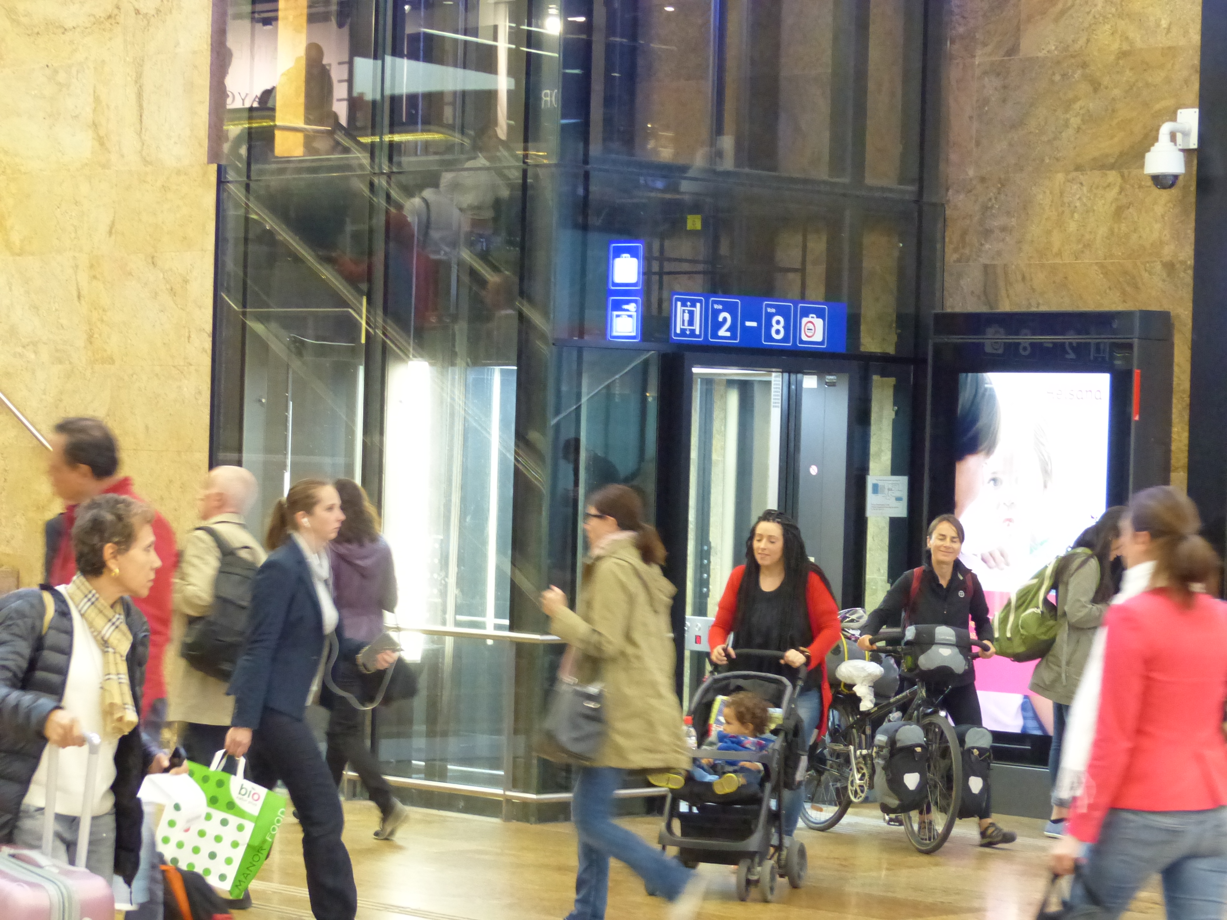 On arriving at the station, the first thing I noticed was the location of the departure hall…down. Oh no, is this going to mean stairs or escalators and trying to hold all the weight of the bike again, while gravity tries to win the tug of war? No, look! An elevator! You little beauty! My bike fitted, no problem, so down I went. Steve had to do his usual trick of balancing his bike on its back wheel like a rearing horse, to fit it in, but eventually we both made it down.
