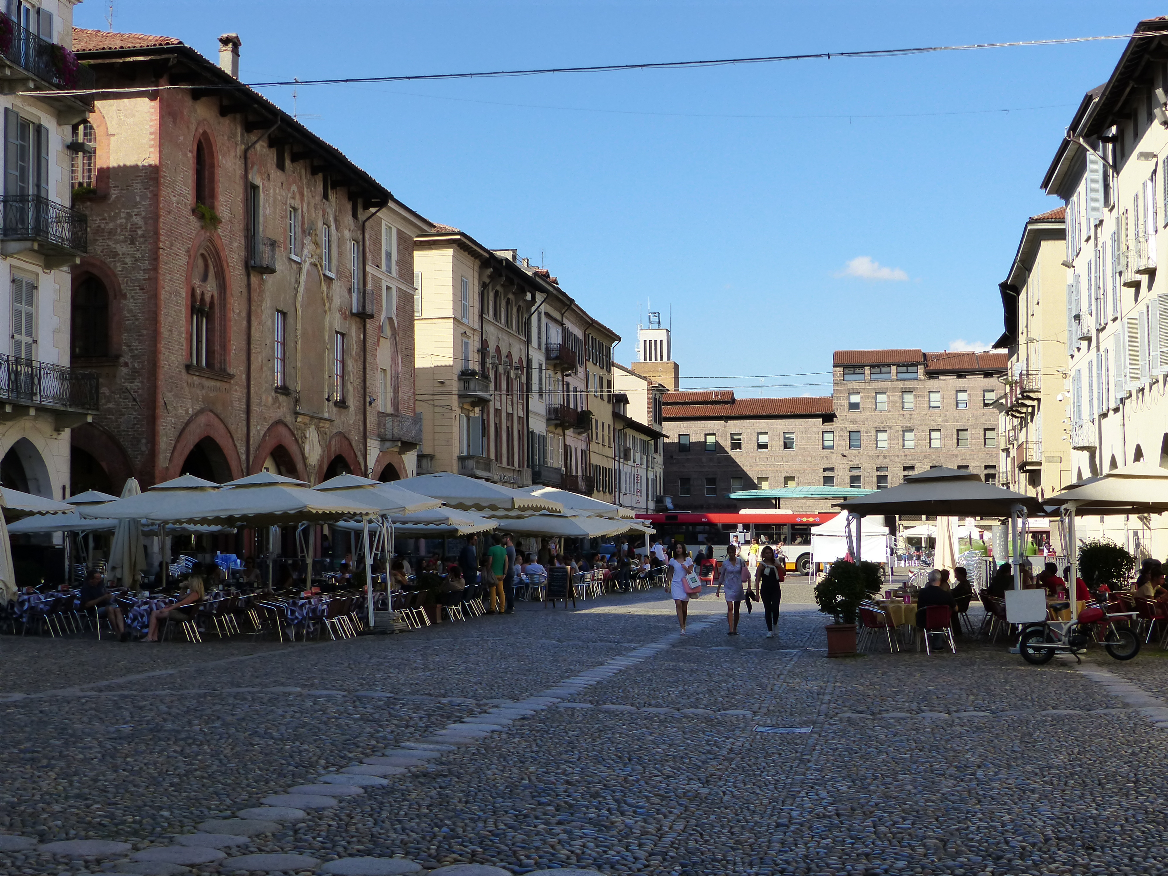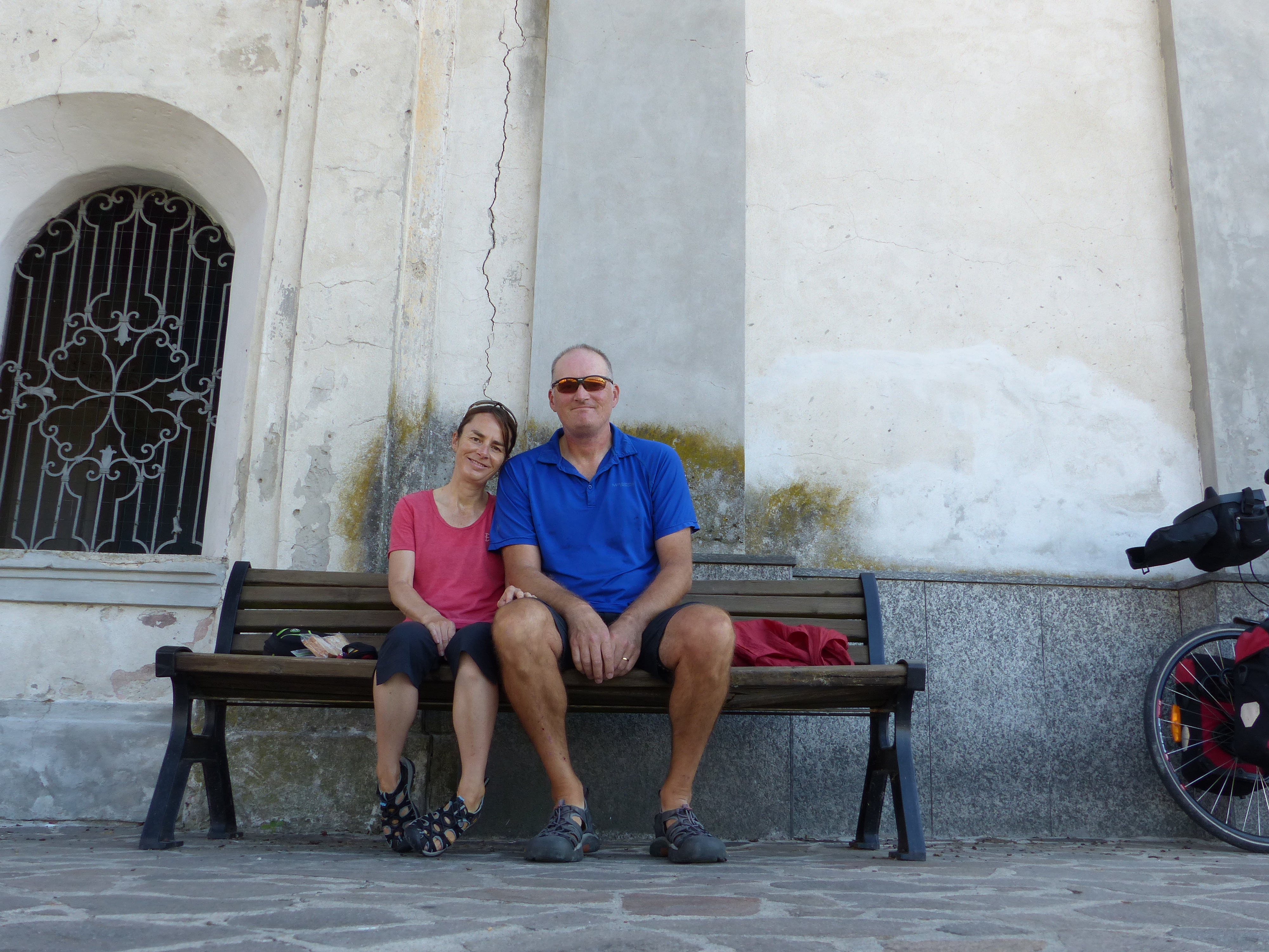 We rode into Piacenza where we had booked another budget room. Unfortunately there are zip, zero, no campsites in this area, so our longed for stay in the tent was short lived. We pedalled into the centre of town and stopped to look at a building in the small piazza. Two men on fold up bikes stopped beside us and asked where we were from.