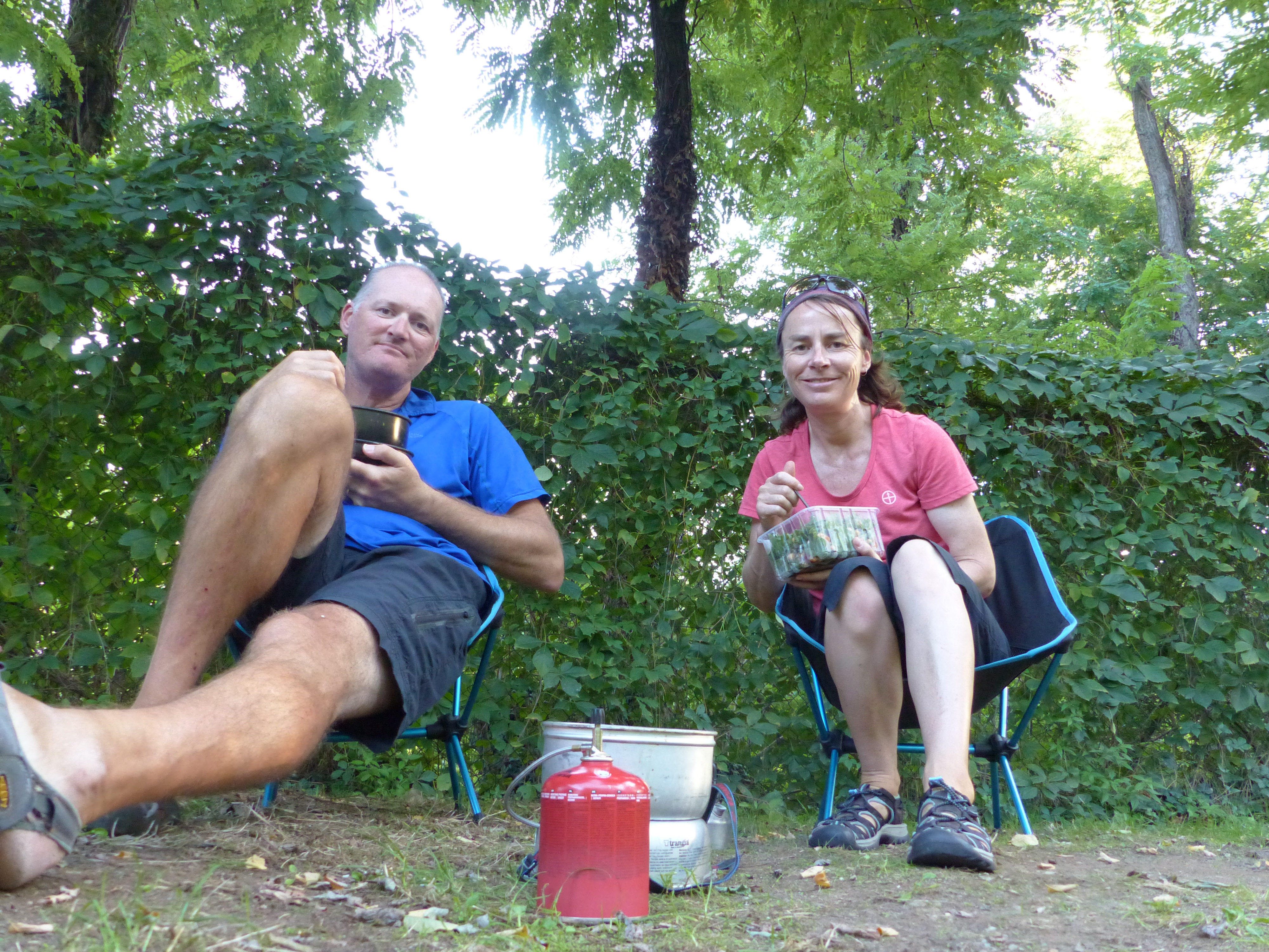 We found the campsite and the nice, friendly man welcomed us and checked us in. We pitched the tent under some trees and sat in the sunshine for a post-ride cuppa and some lunch, while Steve tuned in to listen to his AFL team win their semi-final. (I tuned out at that stage!).