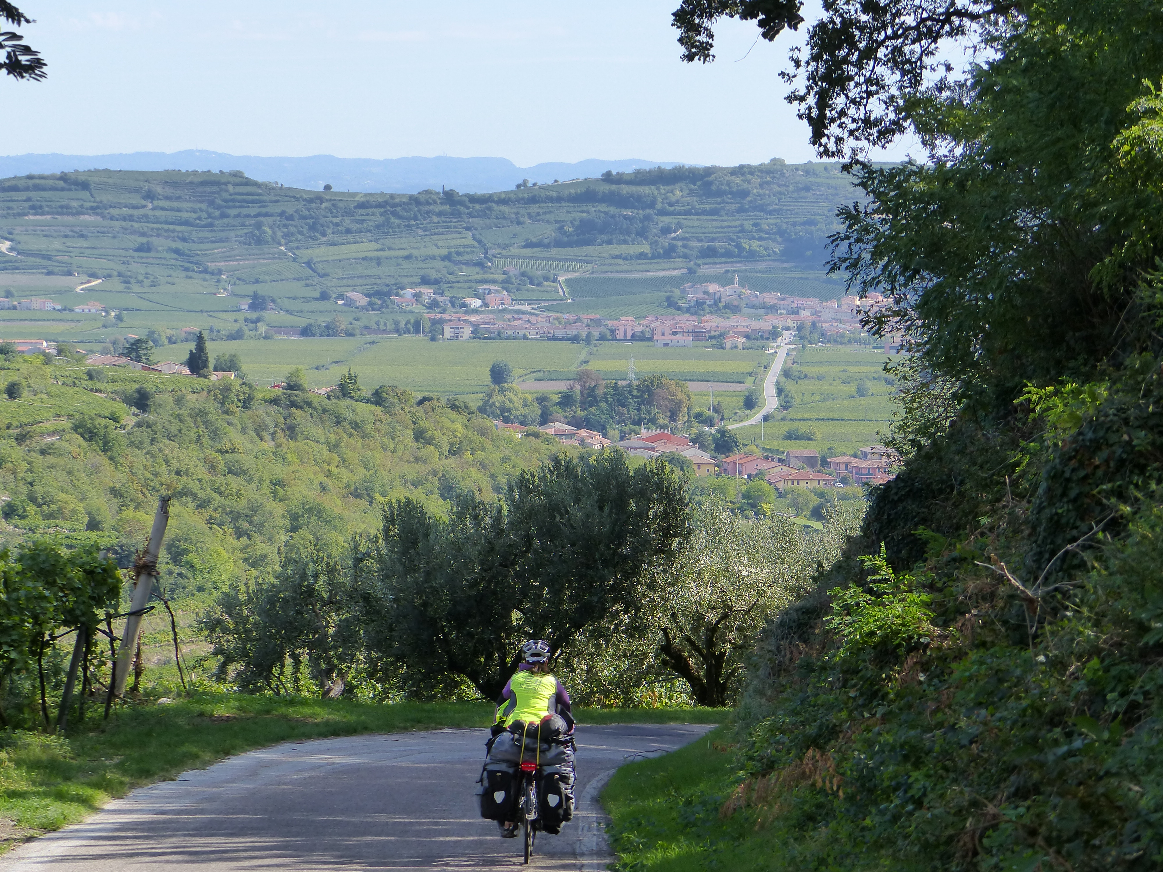 It was a tough day, but a fun day. We had wind and wrong turns and a mighty hill, but we also had some nice scenery, some lovely little towns, the company of some other touring cyclists and a very nice pit stop at the end of the day. We’ll rest up here and do our housekeeping, before the final push to Venice. We also flew the flag for the over 40’s in our own version of the Giro d’Italia, with some stiff competition from the teams in the peloton! We weren’t presented with a pink or yellow jersey, we didn’t take the King of the Mountain title, but we did get a very nice cuppa on arrival, thanks to the number one member of our support crew…the Trangia stove. So Team Tassie + Trangia, had a good day and crossed the finish line with a smile. For a couple of freewheeling, at times navigationally challenged, windblown and fashionably bereft cyclists from Tasmania, it was a splendid, first class day. Simply champion!