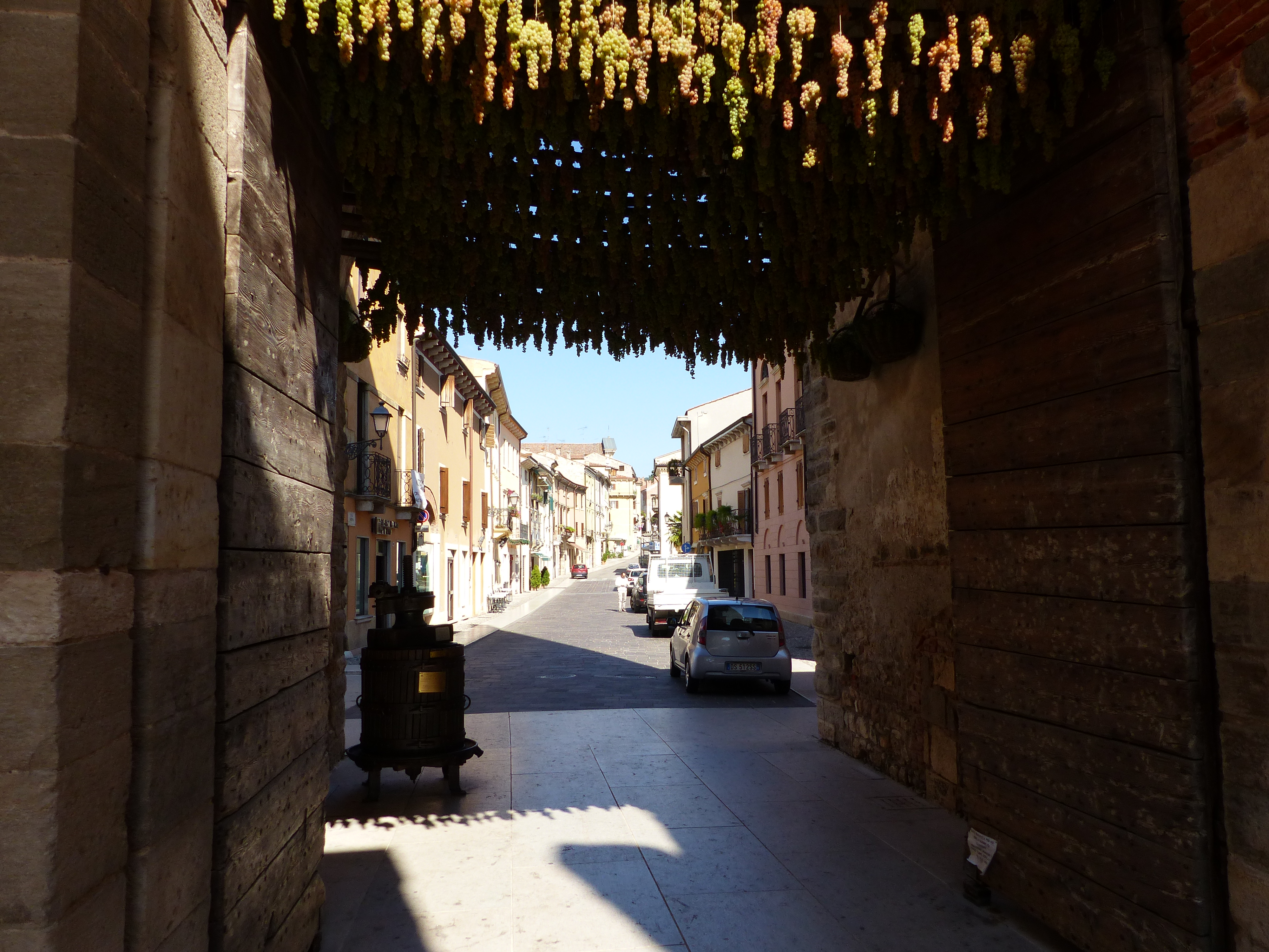 On we rode, through the gorgeous countryside, between and alongside acres of grape vines. We’d been hoping to discover some hidden gems, between the major towns and cities and we found one today. We came upon Soave, a small medieval town, known for its “golden grapes” and wine. We rode under the town archway, hanging with grapes and pedalled up the cobbled street. It was a beautiful town, with the main street lined with small shops, cafes and bakeries, a church and tower at the far end of town and steep, cobbled streets and lane ways. It was so nice to be in a small, village like place, quiet and pretty and full of character.