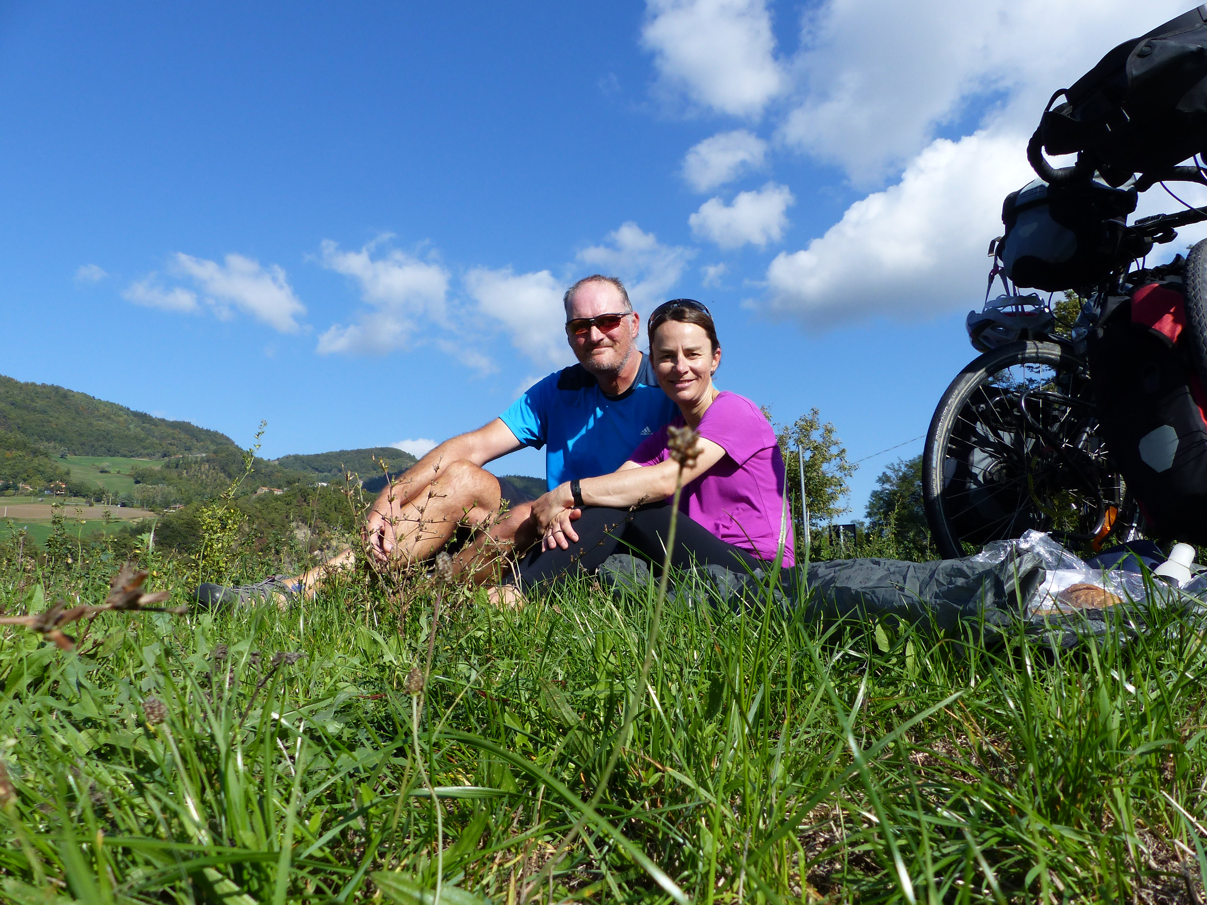 We stopped at the top of a hill and decided to park on a patch of ground and have elevenses while looking across at the hills and trees. While we sat there, we were joined by Simon. He was cycling his way down the hills that we were still to climb and he pulled over to introduce himself and have a chat. Simon was from Argentina and is also doing some cycle touring of Europe. He was a charming, enthusiastic and thoroughly engaging 23 year old, with a smile that was competition for the sun that had decided to shine today. “Isn’t this amazing!” he beamed, sweeping his hand across the landscape and view before us. We chatted about our respective trips and how we travel, where we’ve been and where we stay.