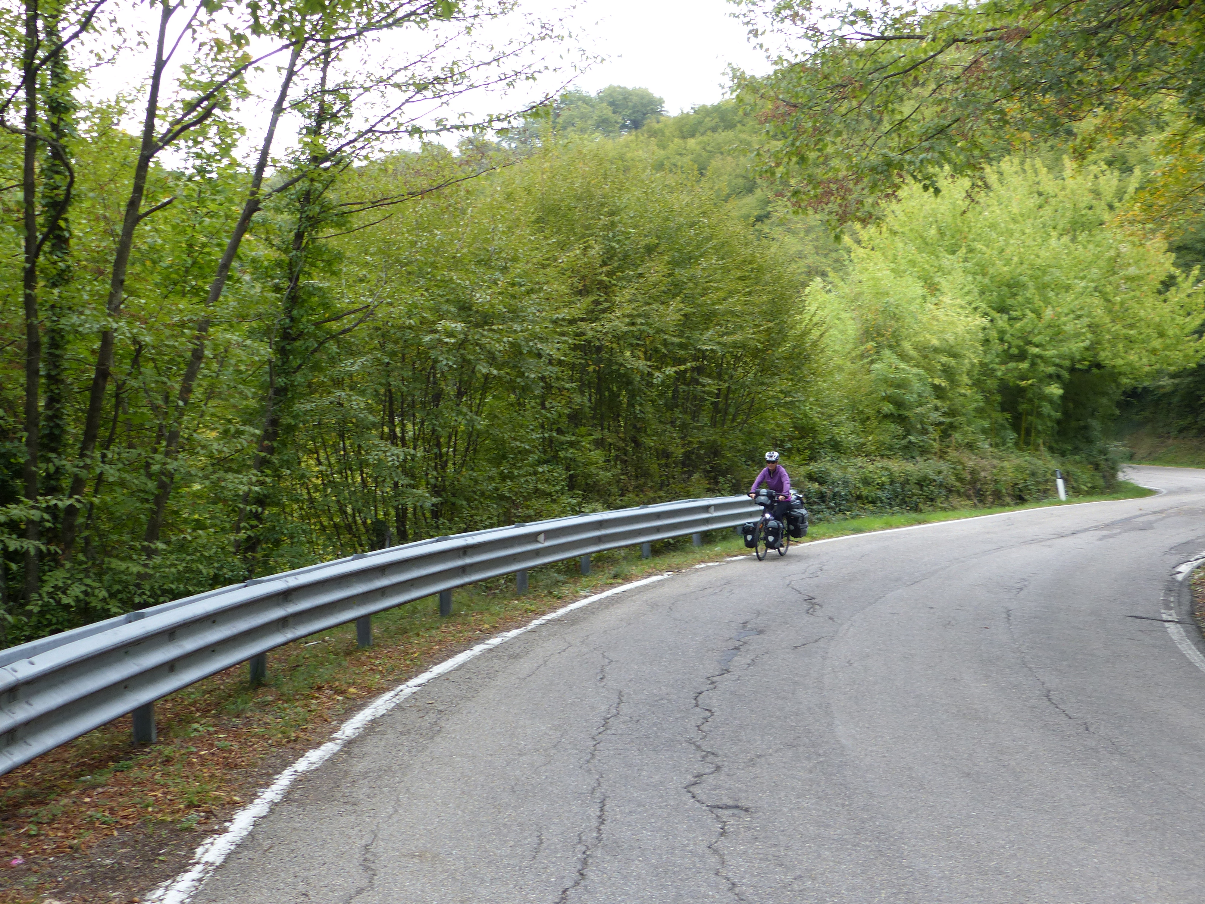 We hit the pedals early this morning, with a fairly long day ahead of us and some hilly terrain to tackle. We’re heading in the general direction of Florence, but we’d planned to head for a town just short of Firenze (Florence). Riding out of Bologna, we were right in the thick of Monday peak hour. It was busy and the traffic was fast and there were lots and lots and lots of the dreaded roundabouts. We pedalled and signalled and roundabouted this way and roundabouted that way, we took the first exit, the third exit, with the cars and trucks zipping beside us. I even gave one bloke a blast of my horn when he cut in front of me on a roundabout, forcing me to brake and swerve to avoid running into him. What is it with drivers at roundabouts!? Look around you!! We eventually made it out of the city mayhem, into more open country and the climbing began.