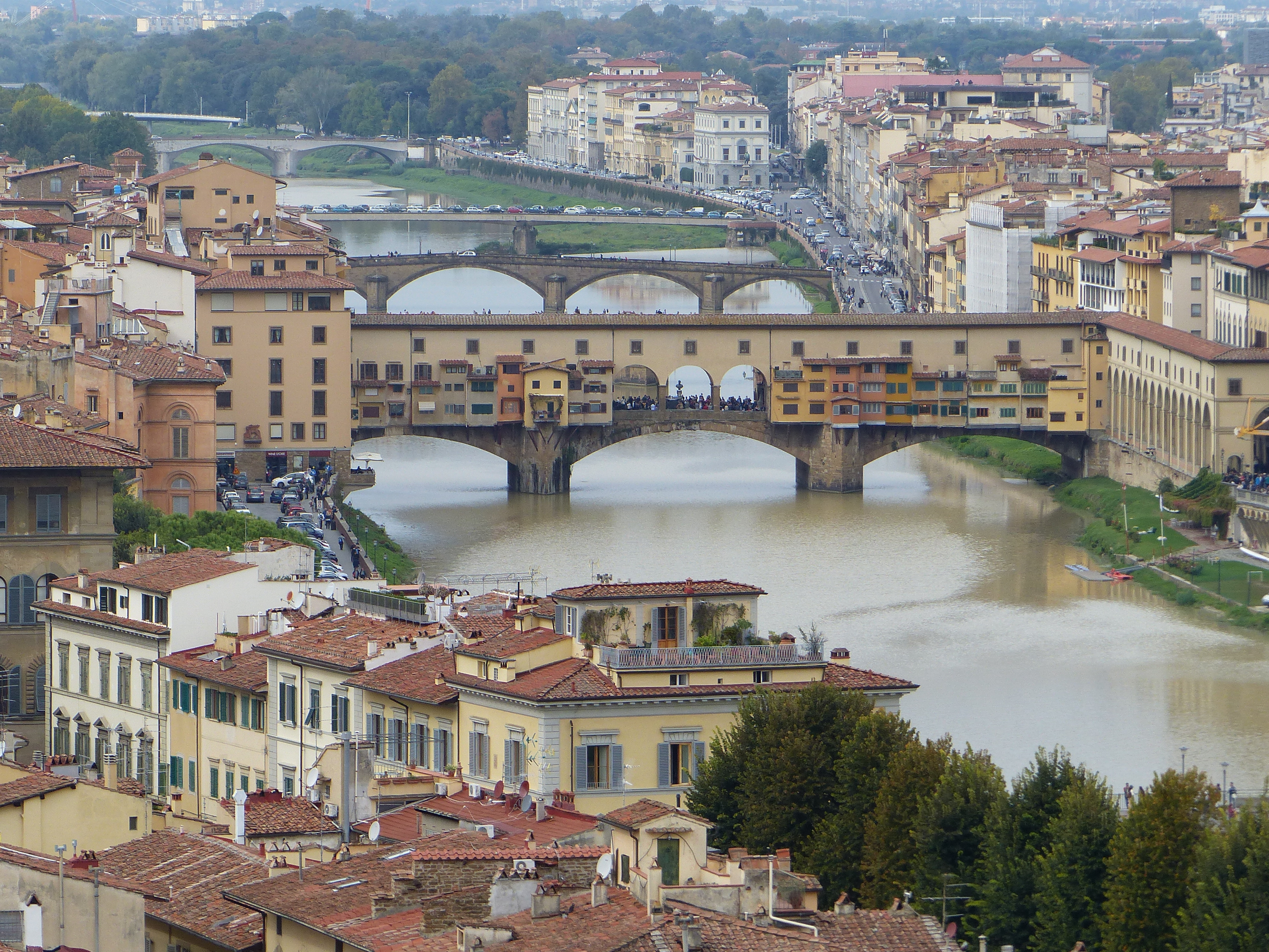 Today we went out for a massage and cellulite treatment, a.k.a. a bike ride around the cobbled streets of Firenze! As we bumped along, the rear end got a fine ol’ pummelling, the arms and legs got a good shuddering and I think we may even have come close to losing a filling or two, from the teeth chattering corrugations of the cobbles! It was such fun though! Being Sunday, the traffic was practically non-existent, we only had the foot traffic to contend with and there was plenty of that. We dodged and weaved and practised our balance and technique for keeping the bike upright, while proceeding at a virtual standstill. We began along the rIver, which was lovely, through some trees and looking down the peaceful water, with the city stretched out along its banks.