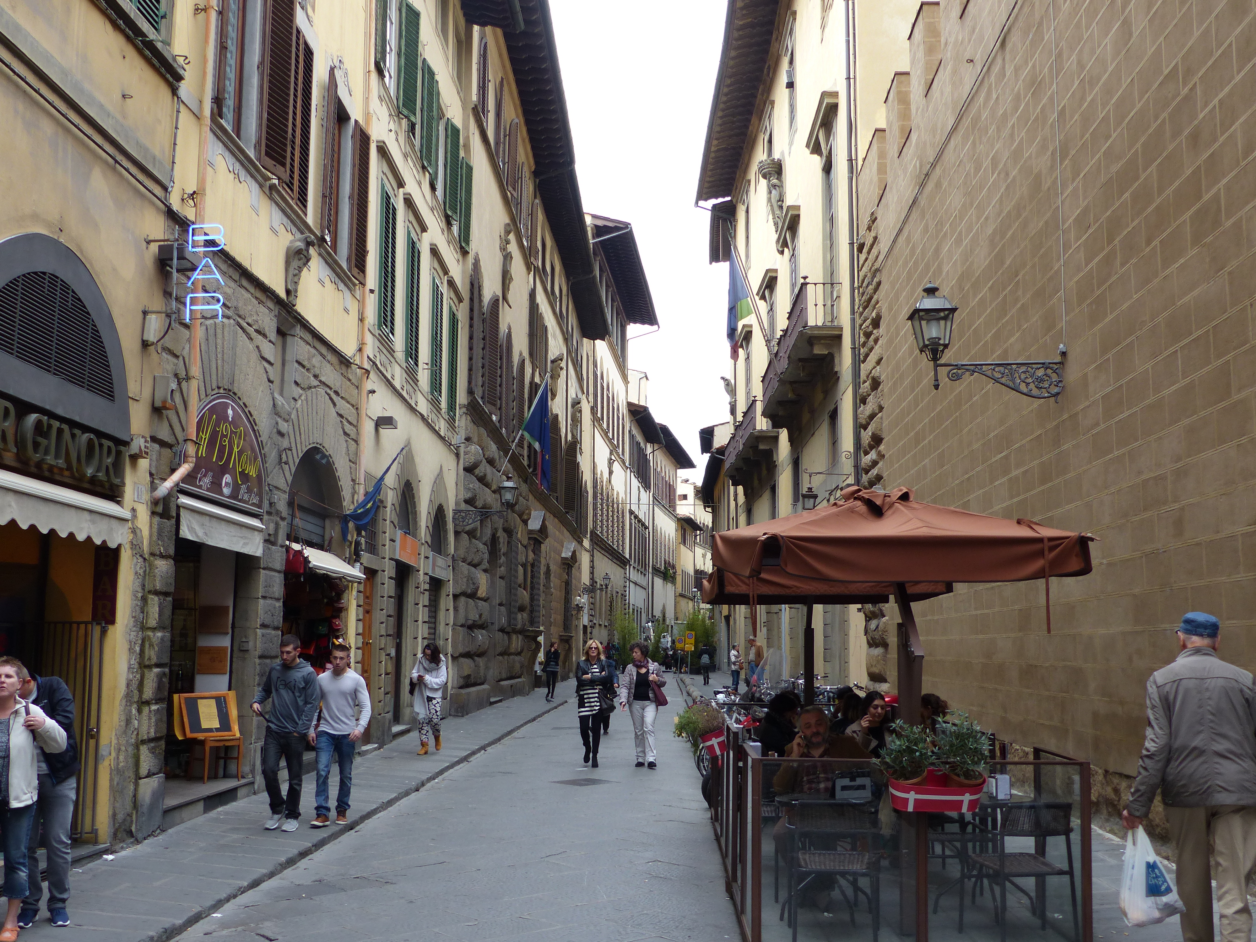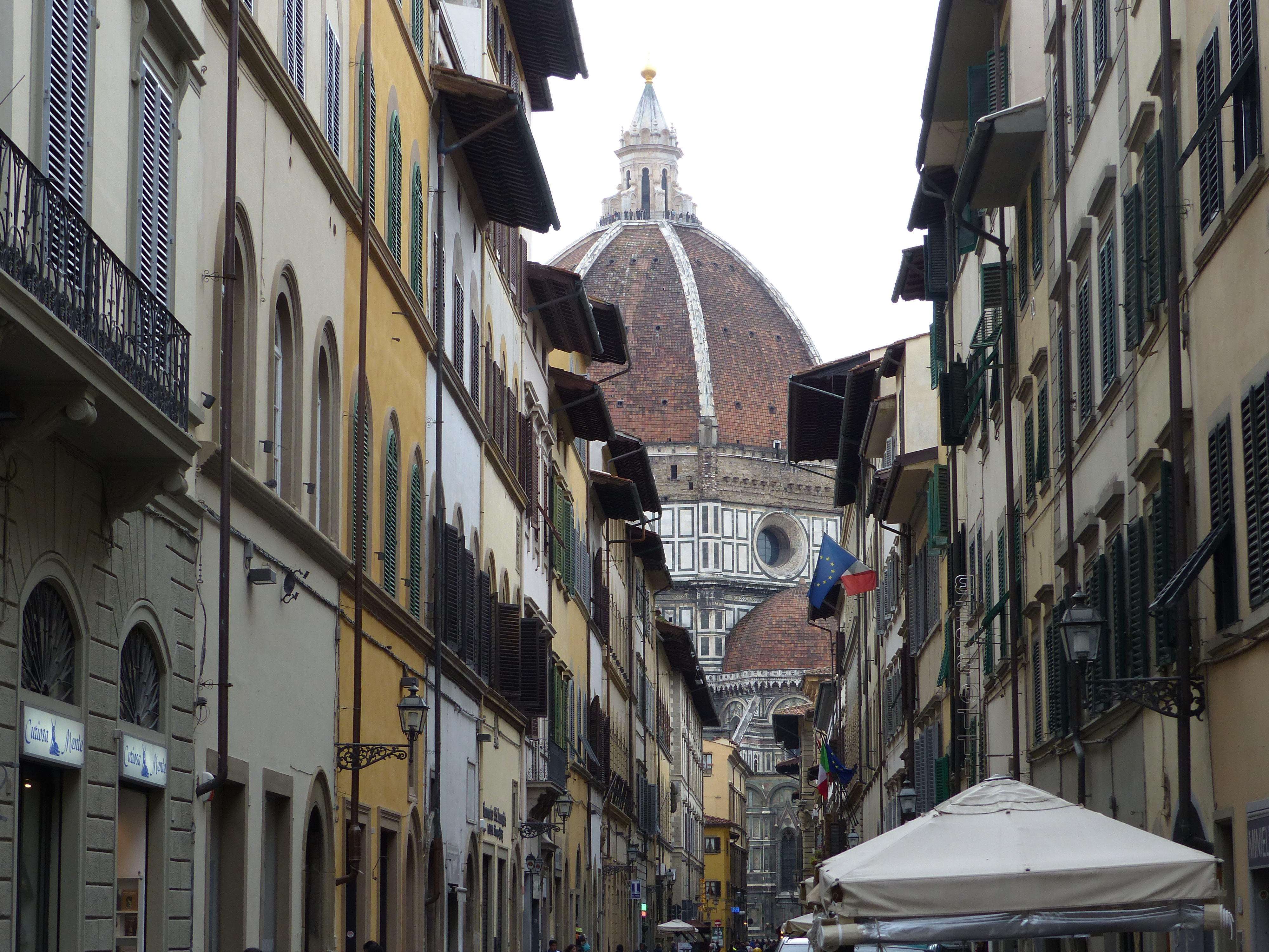 “This is so cool,” I said to Steve. It was just fun and a totally delightful experience, to ride through those historic streets, looking at the old houses and buildings so close beside us, with the ancient street lamps and worn and broken cobbles below our wheels. It was a memorable ride. I don’t know about all roads leading to Rome, but in Firenze all roads seem to lead to the Duomo, because we soon saw it, down the end of a street, in front of us. We were back in the centre of town, so we did some more pedalling around, just riding wherever we felt like it, down a street here, up a lane there, until it was time to start heading back to our little apartment.