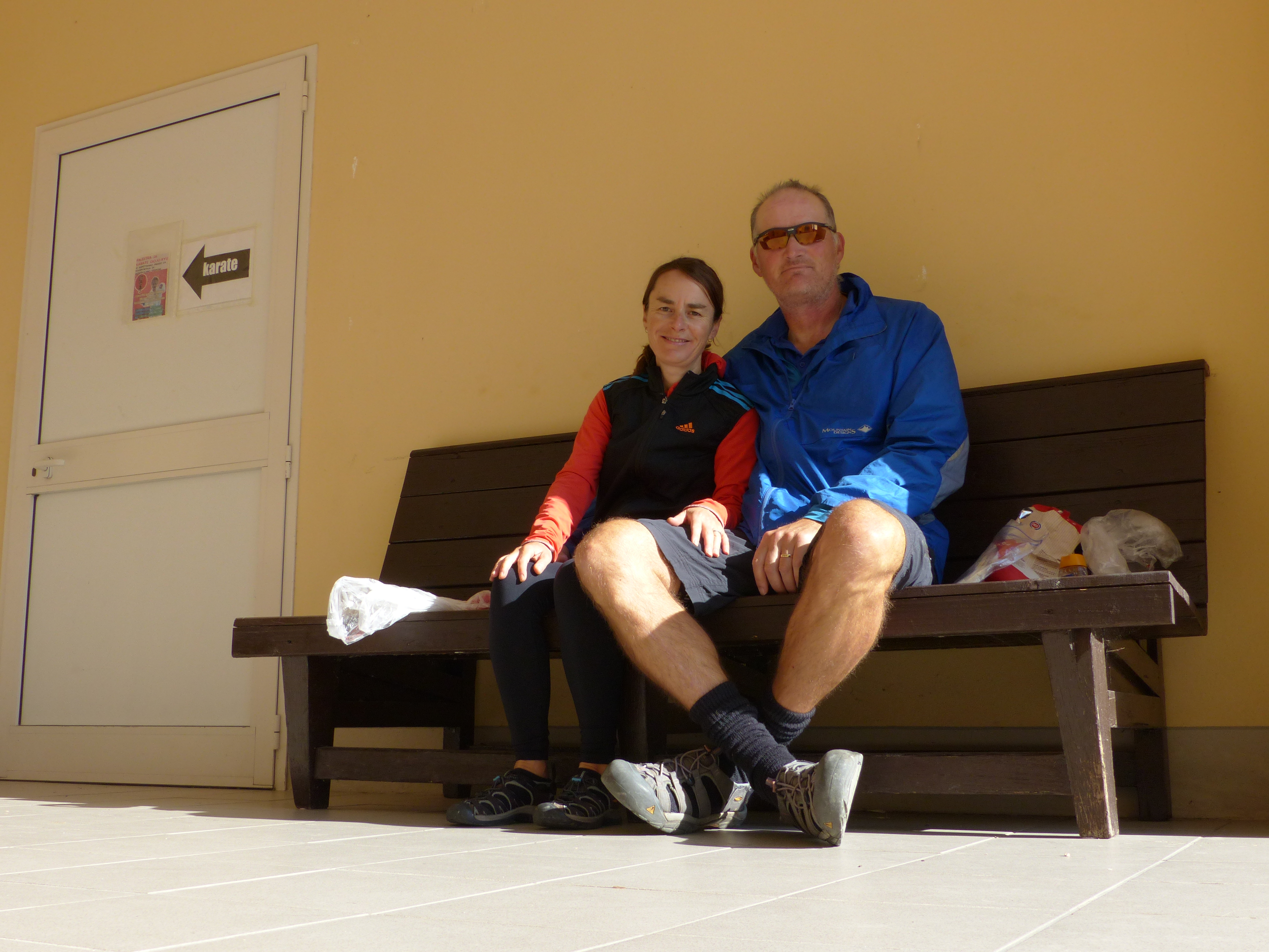 After some more shared travel with the cars and trucks, we pulled over when we saw a small park beside a building and sought out a place for elevenses. The building was some sort of sports facility and a big banner hung from the entrance with the picture and name of Daniele Bennati, whose home town we seemed to be in. I didn’t know who he was, but Steve said he’s a sprinter who rides in international tours and has ridden the Tour de France, so it appeared we were in cycling celebrity territory. We found a seat in the entrance, out of the wind and had our daily elevenses.