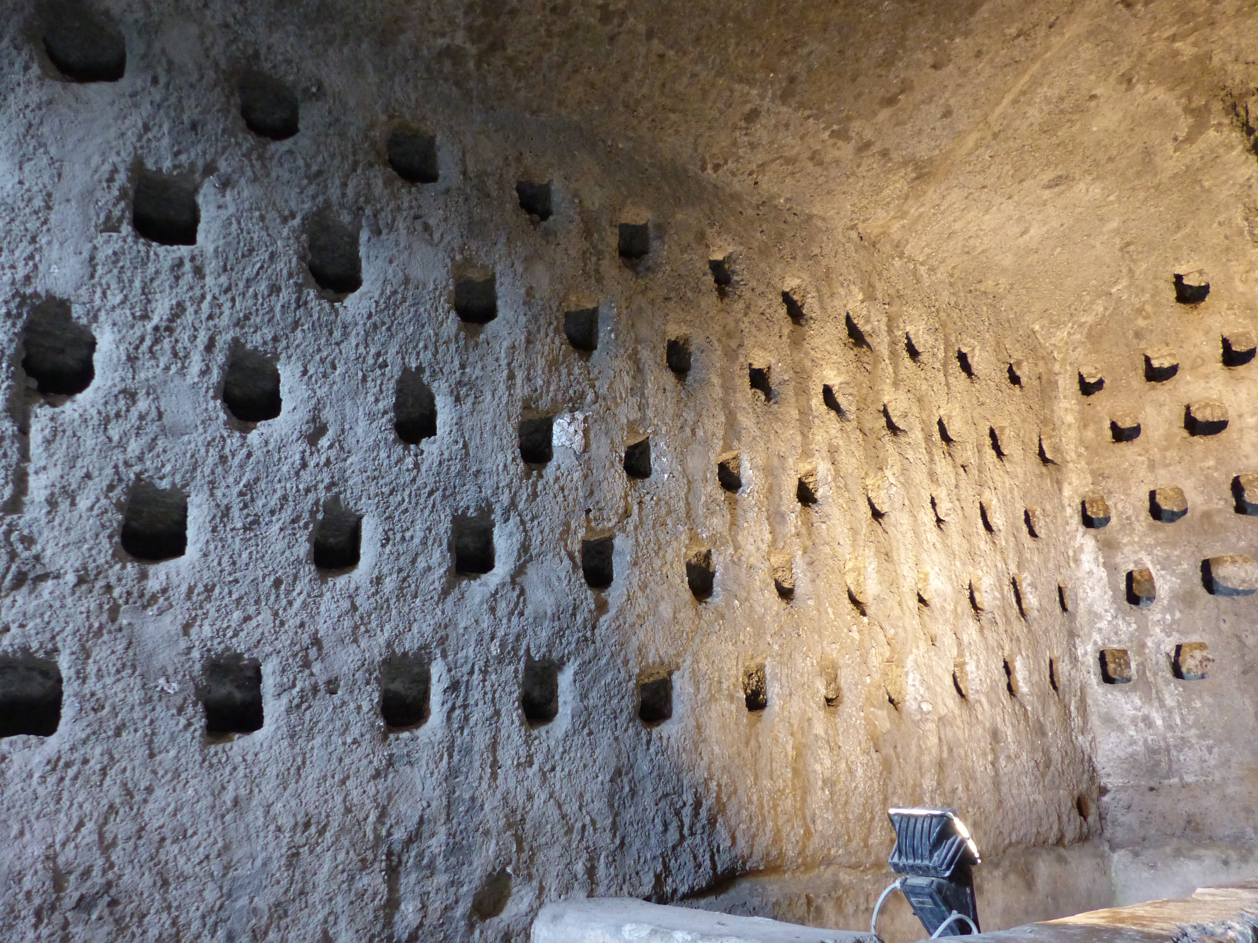 Water was obviously an essential resource, so they dug wells to collect rain water. We saw one of these wells, which was 43 metres deep. When it was originally used, it was 80m deep, but the Etruscans filled some of it in, because it wasn’t sustainable to keep it that deep, when it came to extracting the water. The wells were dug by a single person at a time, chipping away at the rock and holes were chipped into the side, as footholds. To get the water, a person would walk down the inside of the well, almost doing the splits, with a foot on each side of the well wall, using the holes as places to put their feet, as they edged their way down. What a job!