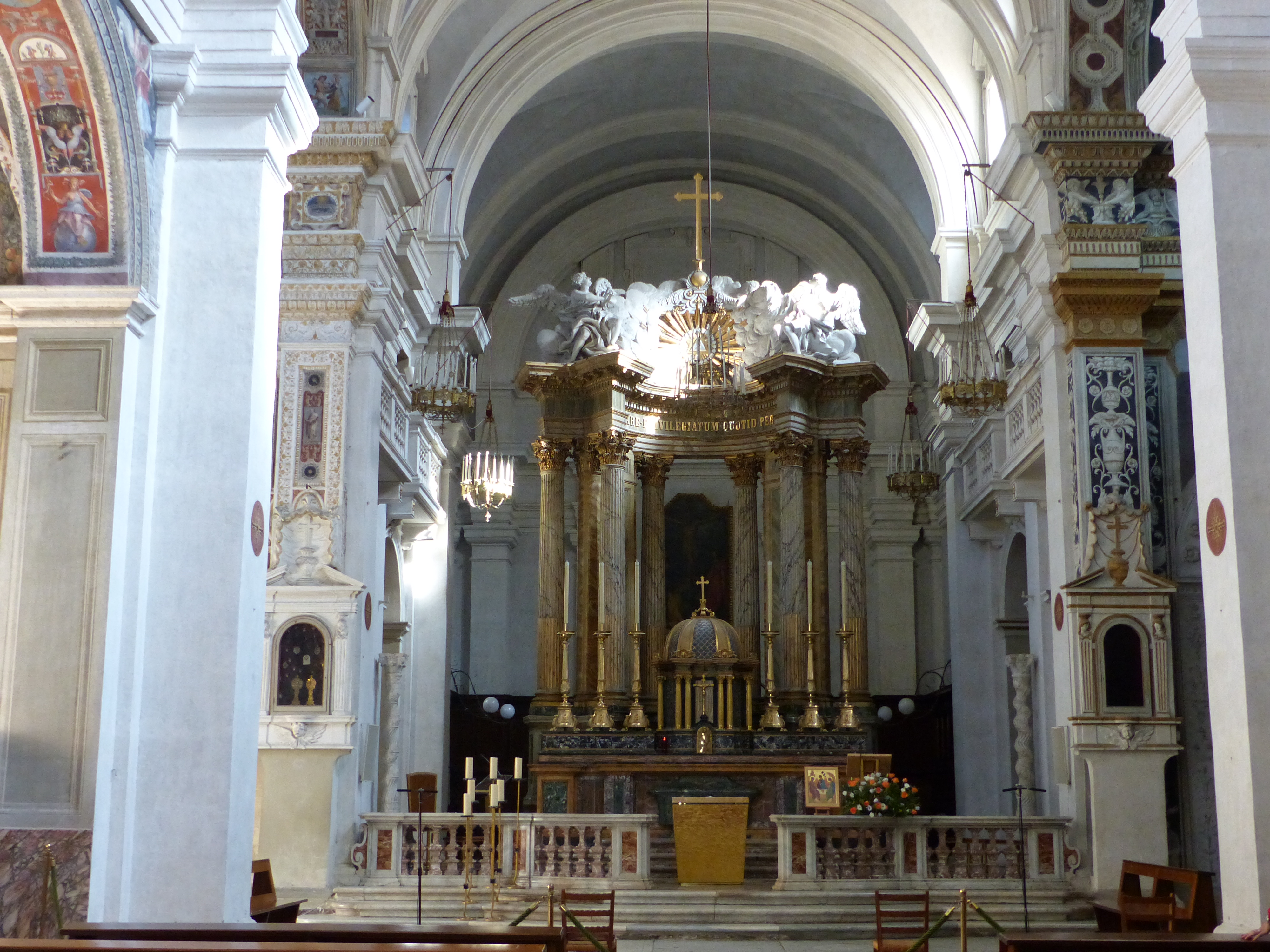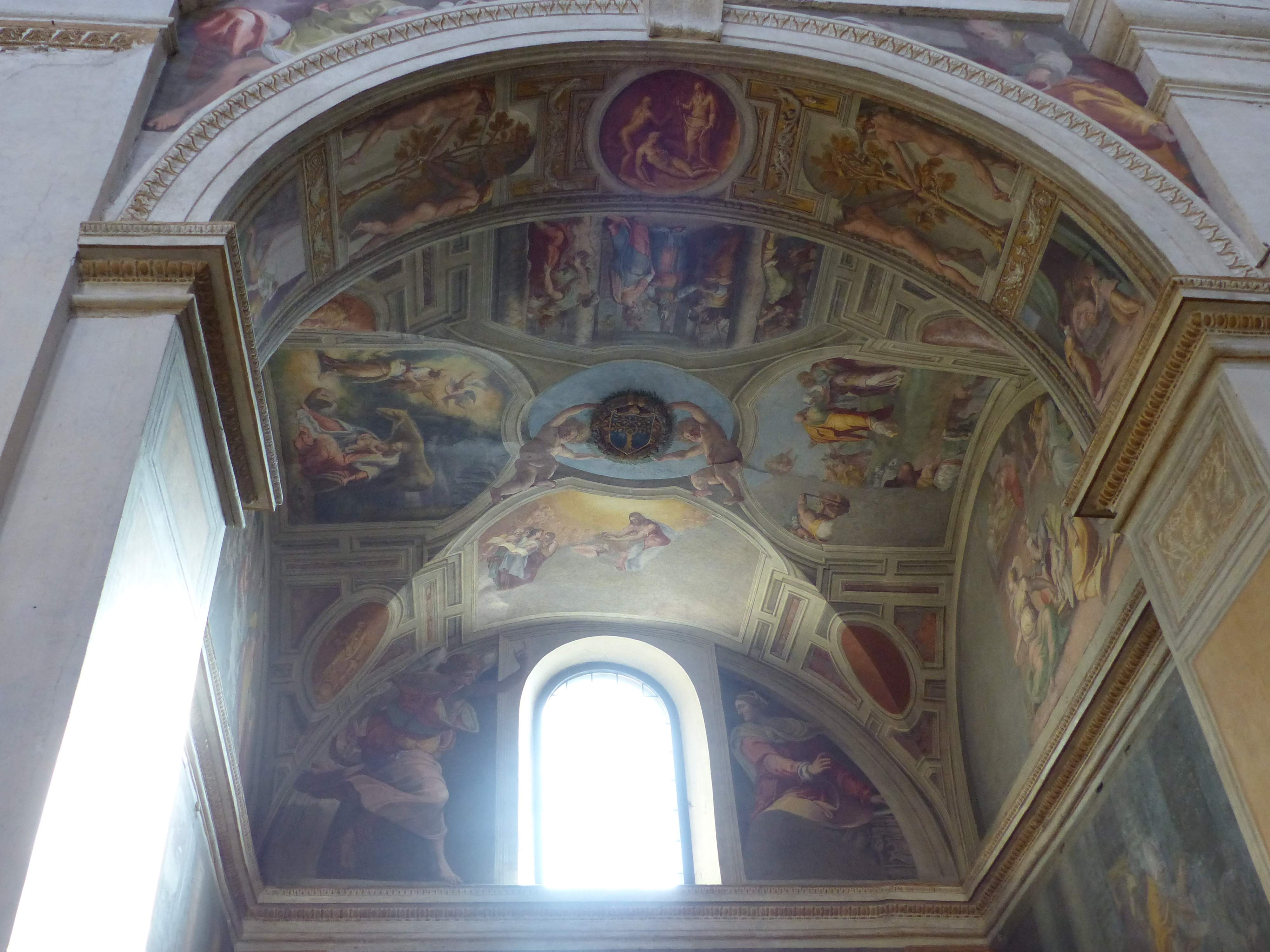 At the top of the steps, we crossed the street to another set of steps, that led to another lovely view and lovely church. We stood and gazed at the city vistas again, then quietly stepped into the hushed interior of the Trinita dei Monti. This wasn’t anywhere near as grand or ornate as others we’ve been in, but was still beautiful, particularly its frescos.