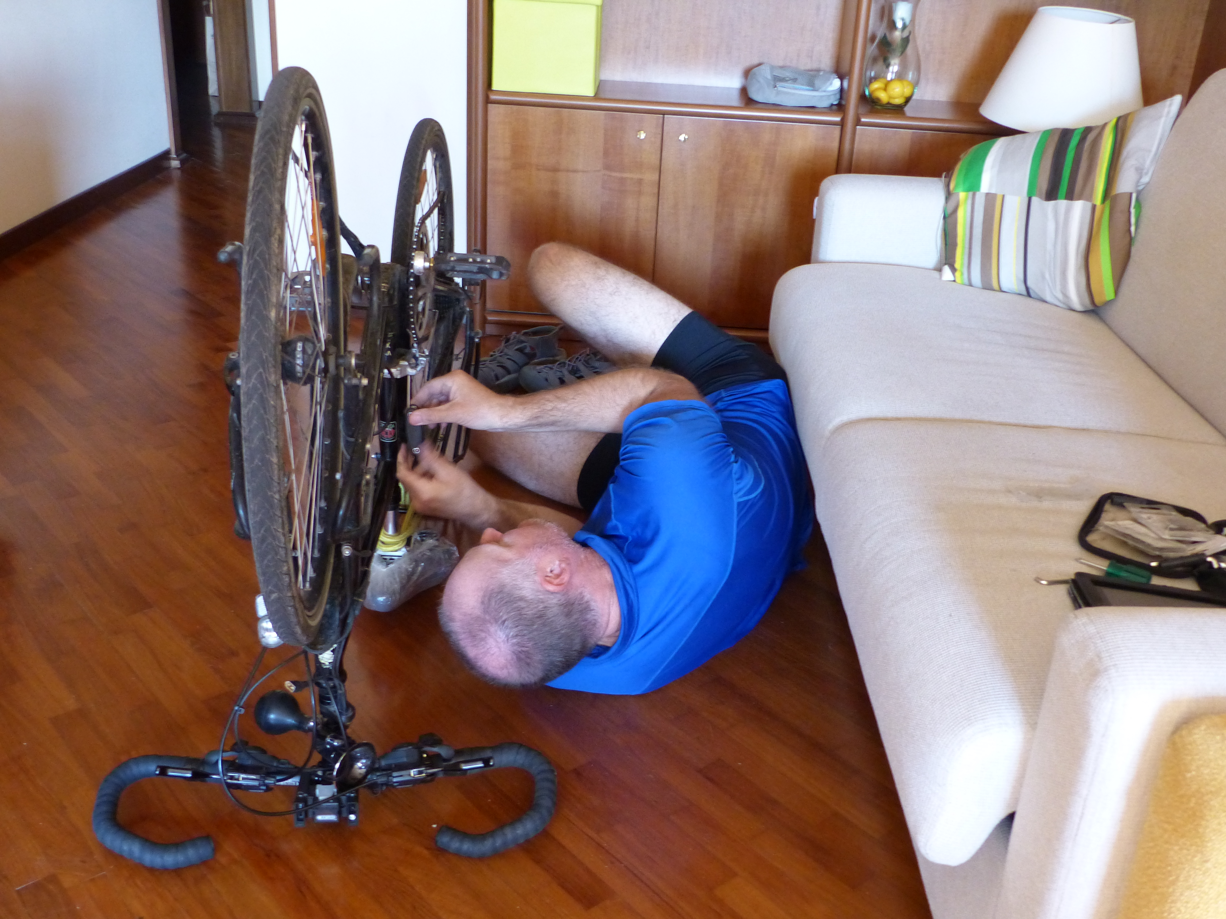 and so on! Despite the moments of frustration for the Big Fella, he clicked and cranked and twisted and turned and tightened and did all manner of things to the littlest two-wheeled team member and in the end, as much as could be fixed, was fixed. All I could do was hold the bike and click gears and turn the wheels, while he turned a screw here and tightened a cable there. He discovered that a particular part on the bike has worn out, which is really causing the problem and will require proper shop maintenance, but he got it working as best he could, to keep the little bike going until our return.