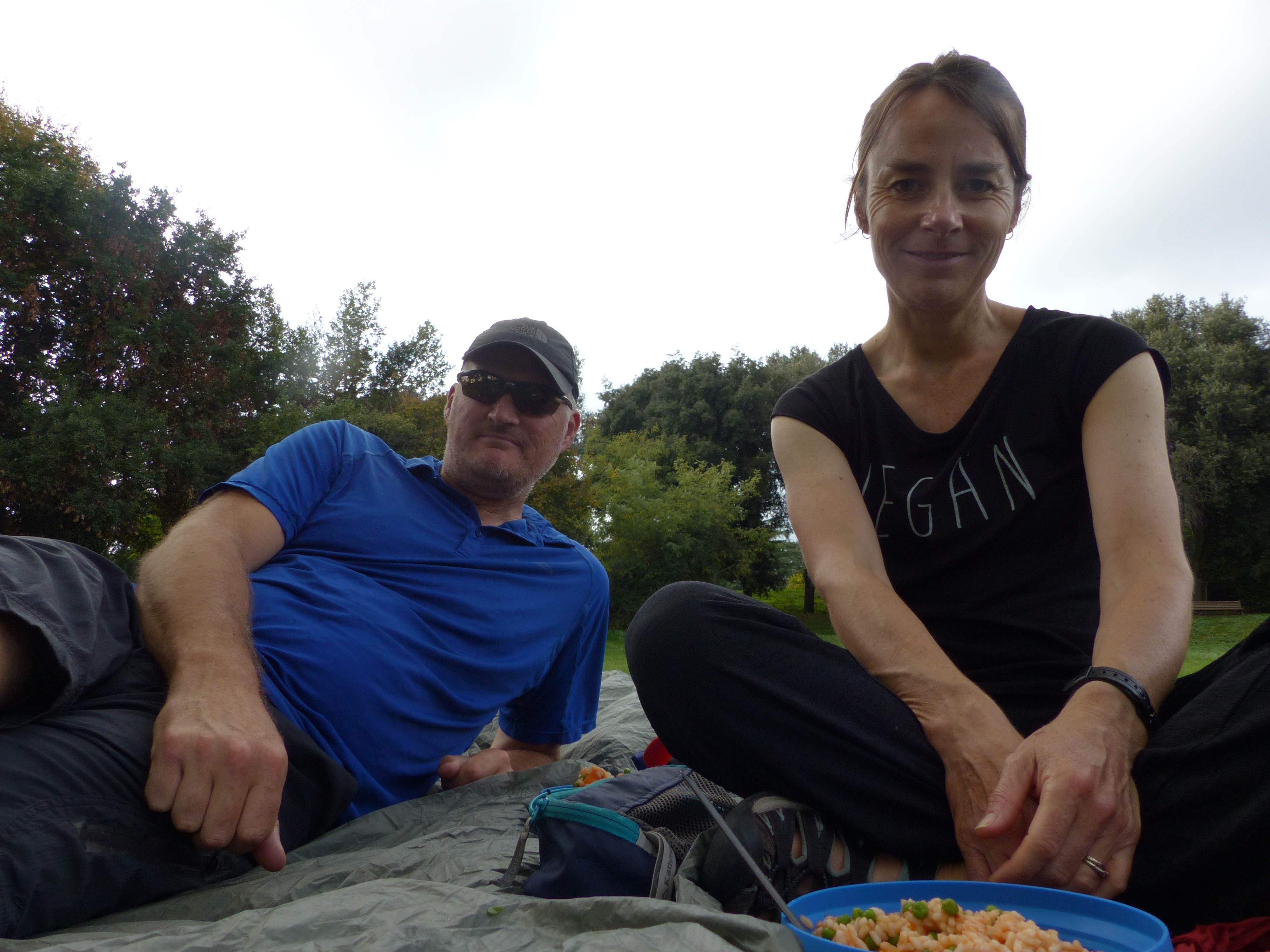 When we walked into the city a couple of days ago, and walked through that nice big park, I said to Steve that I would really like to have a picnic there, in the trees, in the sun. That was the other plan for today. After the morning of bike maintenance, we walked up the road and back into the park. It was lovely and hot and the sun was beating down and it was perfect for a picnic in the gardens. We found a lovely spot in a stand of trees, with their golden autumn leaves above us, the green of the park surrounding us and fountain to look down on. We lay out the tarp to sit on and just as we had put out our picnic fare and got ourselves seated…a big black cloud covered the park and rained on us! Then the thunder started. I kid you not. I do not jest. I am not joking. It’s actually beyond a joke now and is really quite disheartening, how the weather treats us. All around us, in the distance, was blue sky, but right over the park where we were, was a huge black cloud throwing rain and thunder at us. We packed up and left before we could get struck by lightning, because with the effect we seem to have on weather, this was a distinct possibility. I’d been so looking forward to the picnic; a nice lunch in the park, rather than a rushed bite to eat on the side of the road like it usually is. I made picnic food and everything, and then, the one thing, the very small thing, I wanted to do, just a simple little picnic, had to be spoiled by the weather. Not happy. Of course a couple of hours later, the sun came out again. The weather just had to spoil my longed for picnic, that’s all.