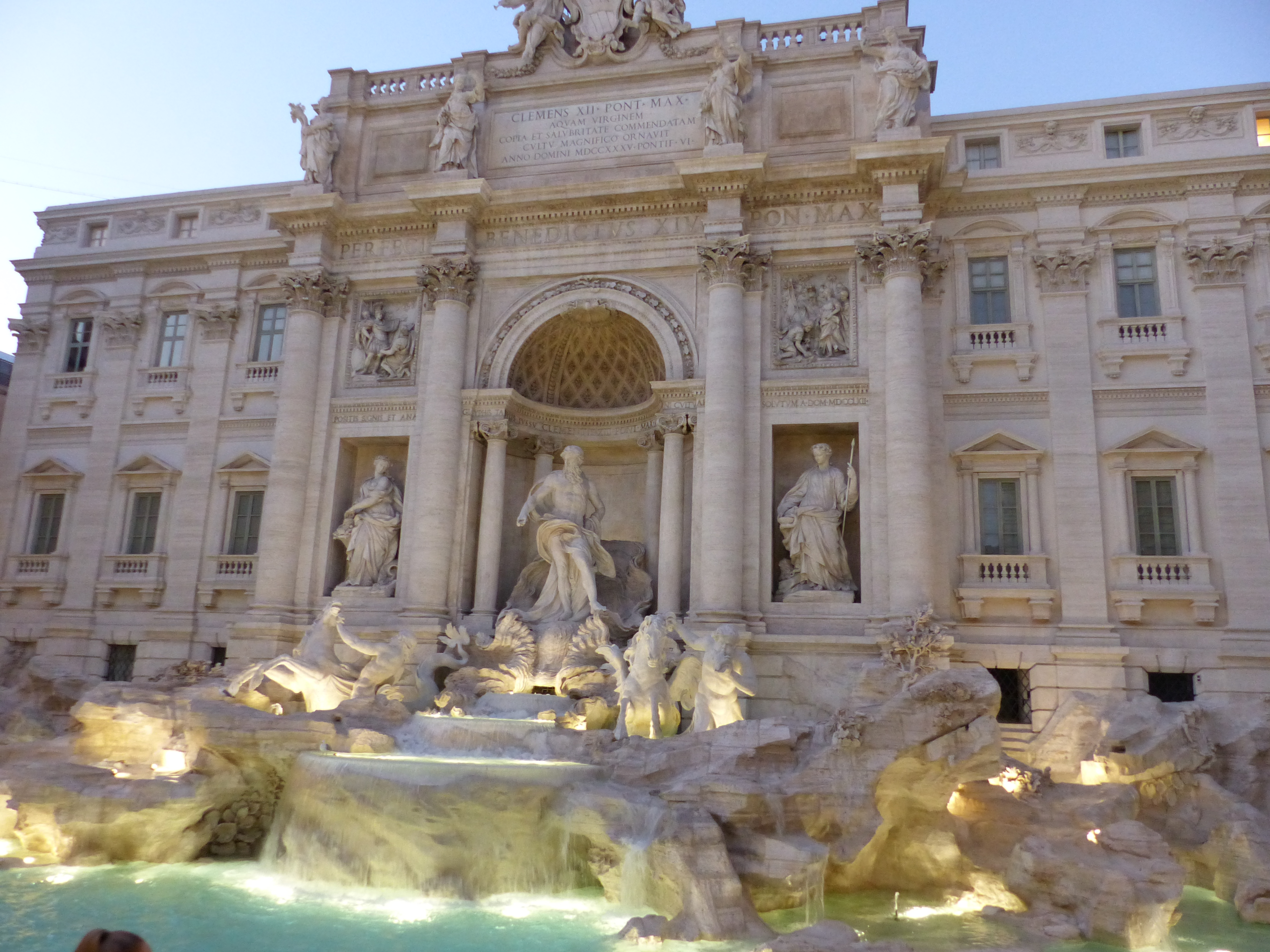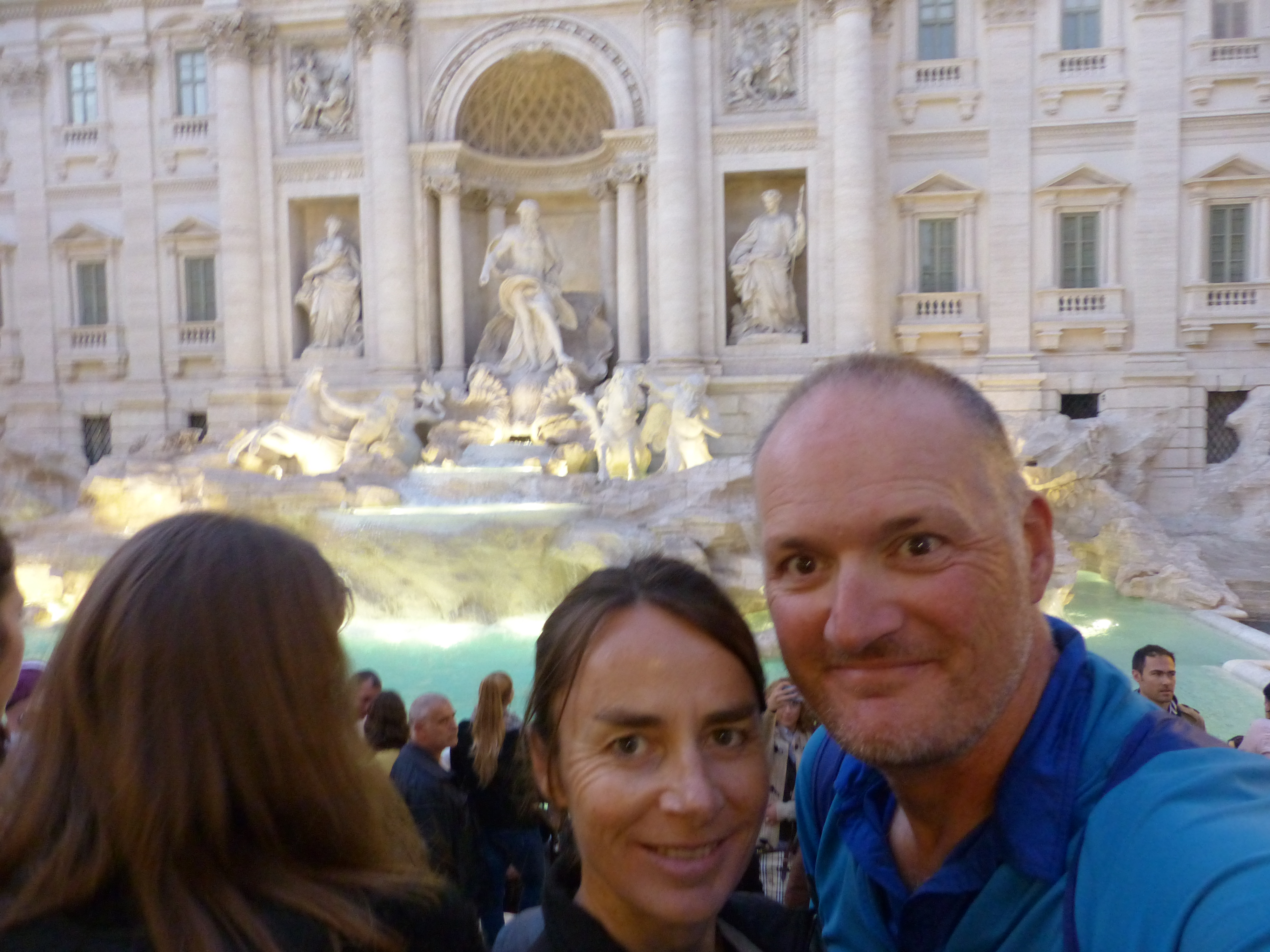 With one of today’s plans semi-thwarted, we set off in the afternoon to see if plan number two could be achieved, our roam of Rome by night. We took the Metro into the city and after receiving a tip off last night that the Trevi Fountain was back in action (thanks Gennie and Lou!), we put this first on our list of sites to revisit. Even though the crowds were about ten deep, we could still see this famous and fabulous fountain and it was indeed very pretty and spectacular with water in it and without its shroud of industrial fencing! Time for a selfie!