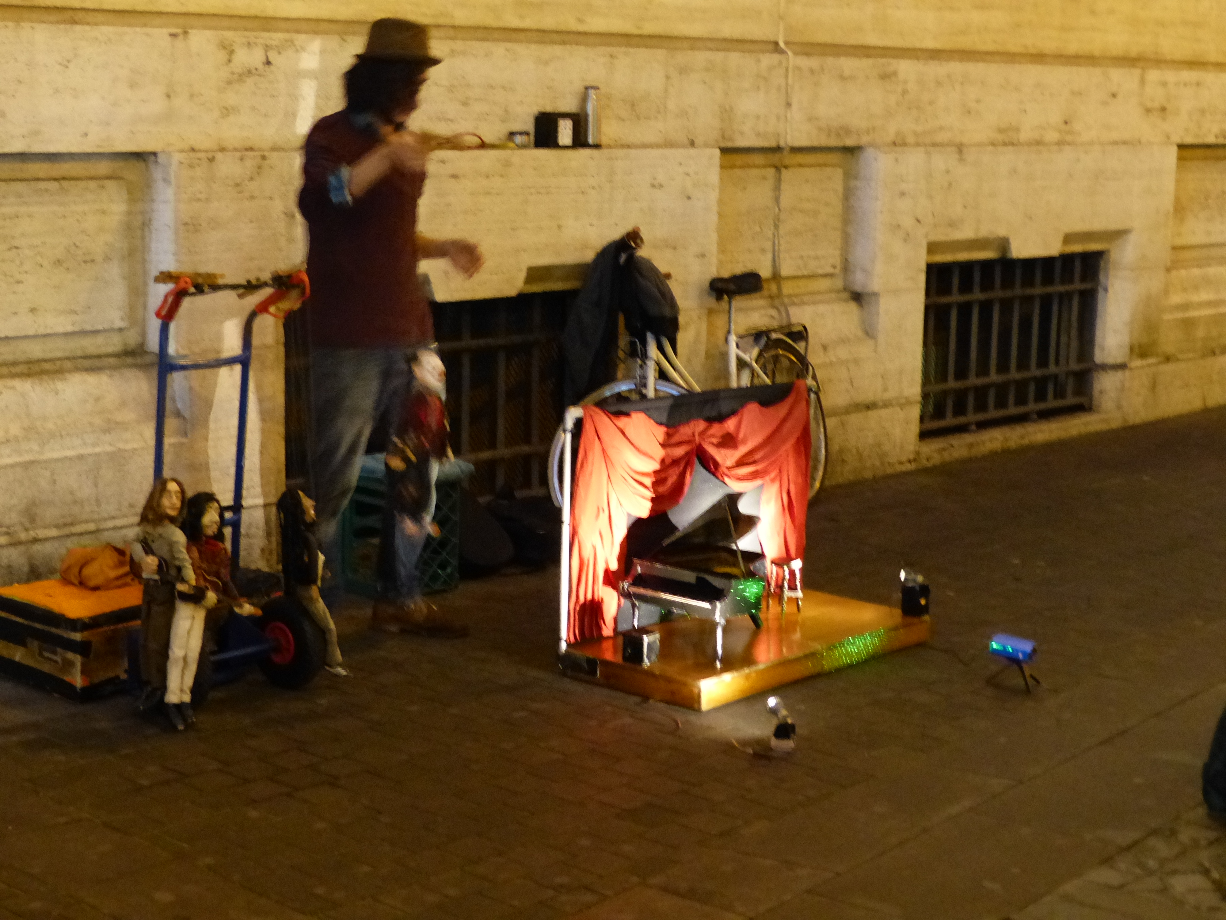 The city certainly had a whole different atmosphere after dark. We strolled the streets, which seemed to be even busier than in daylight, and took in the night time vibe. We’ve seen some terrific buskers with a whole range of talents in different places we’ve been and we saw another entertaining one tonight. A young man was performing with his puppets, which included John Lennon, Bob Marley, one I didn’t recognise and a piano playing clown. He was excellent and took the puppets into the audience too. He was a very talented man. We stood for quite a while being entertained by his musical friends on strings.