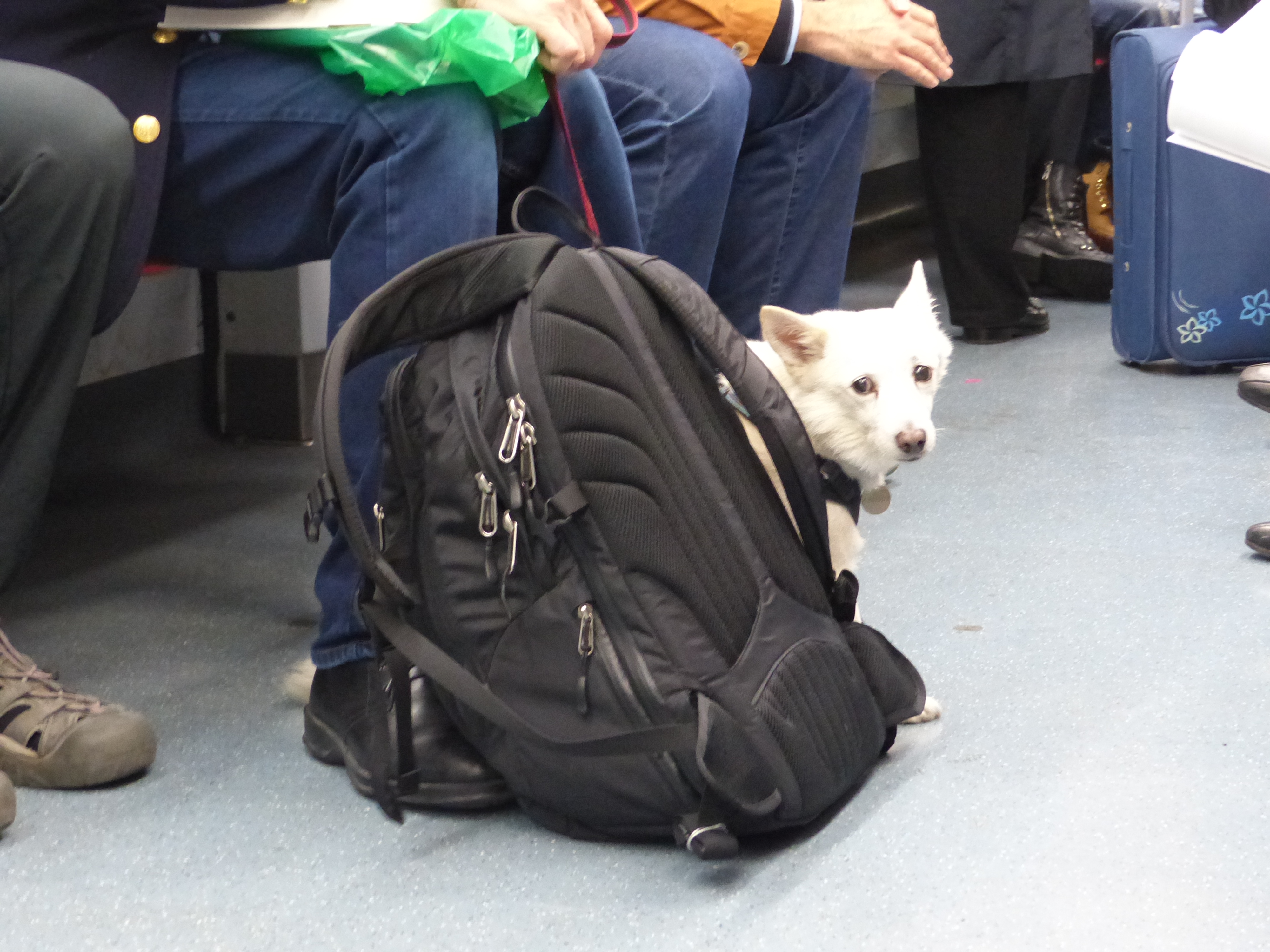 Steve and I were sitting apart but we both noticed a particular passenger get on at a later stop because we both looked at each other at the same time and mouthed, “Rosie.” A man had got on with a little dog that looked just like our own dog, Rosie, from back home. It sat at the man’s feet and every now and again, the man would look up from the book he was reading and smile at the little dog and give it a reassuring rub on the ears. The dog just sat calmly among the forest of legs and feet, looking like a seasoned subway traveller. I’m glad it obliged by turning around so I could snap a discreet photo.