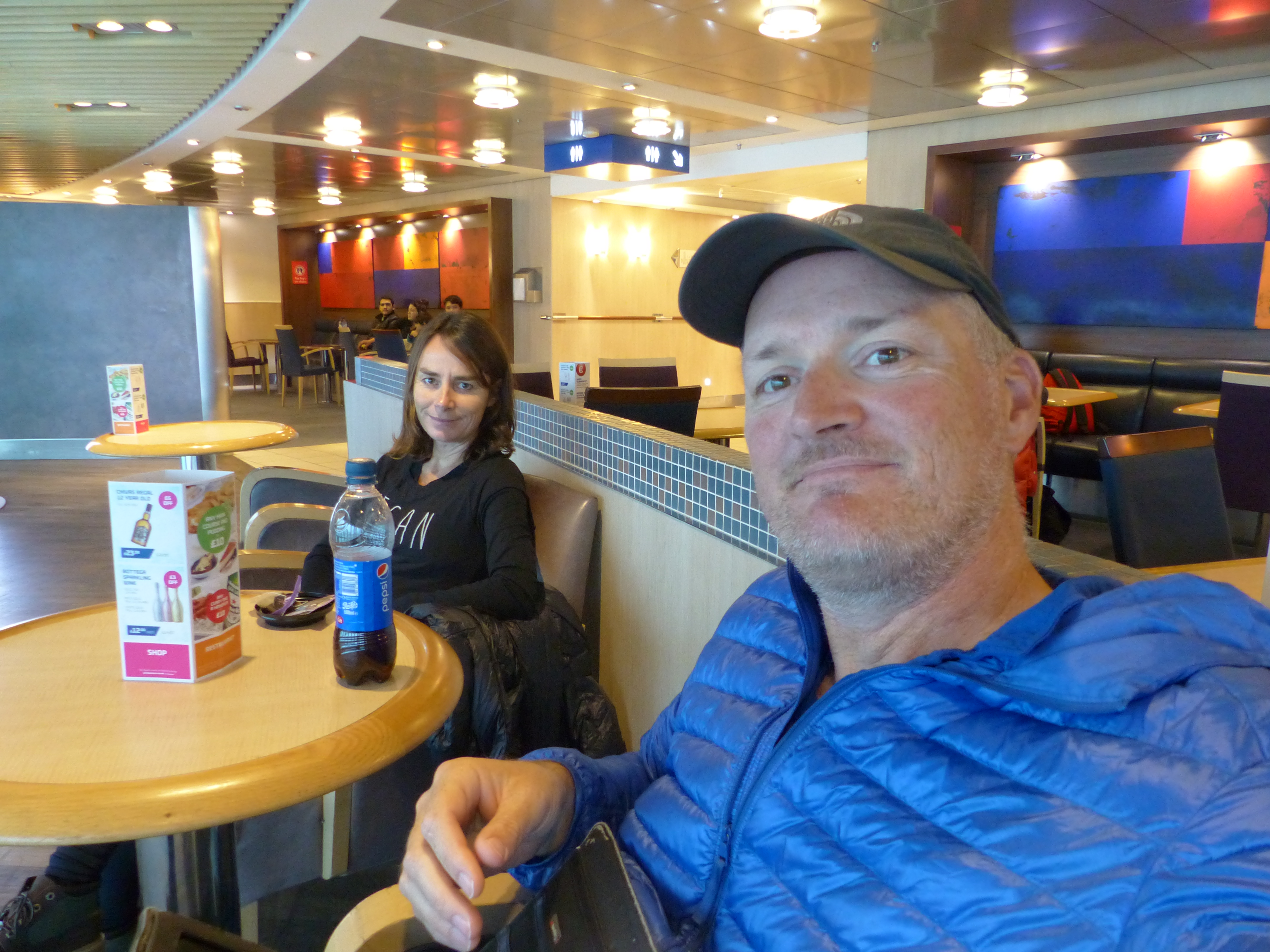 We found a good possie for the two hour crossing, on comfy chairs, with a table, near the tea supply and the toilets and the emergency muster station. Every base was covered! We also had floor to ceiling windows, so had a view too, even though that view was just grey and misty, but we could see the water. This proved not to be an advantage, because it was a rocking and rolling ride at times, so looking at that rolling horizon and the wild waves, wasn’t going to be a good idea for some parts of the crossing!