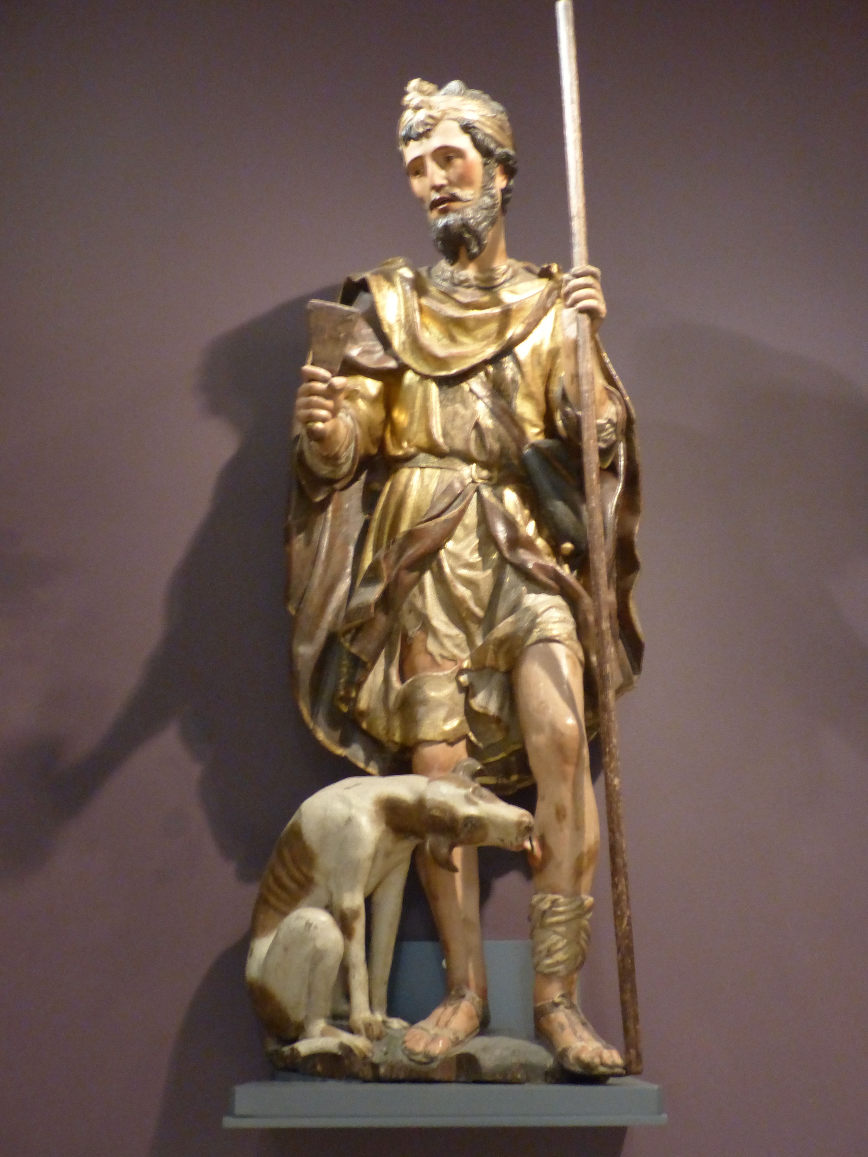I was quite taken with this statue of Saint Roch, patron saint of plague victims. The story goes, that while in Italy he caught the plague; a dog found bread and brought to him and it was this regular feeding from the dog, that helped to keep him alive. In the sculpture, St Roch is holding a clapper, which was used to warn people of his presence, so they could stay away and the dog is licking the open sores on his leg. He was reputed to have miraculously cured those suffering from the plague, hence the status of Saint. I just really liked the image of that little dog, being so kind to him, which was something that I don’t think his fellow humans would have been, given his condition. All through history, animals have done such amazing things for us, and here was a scene of such loyal behaviour, depicted in art.