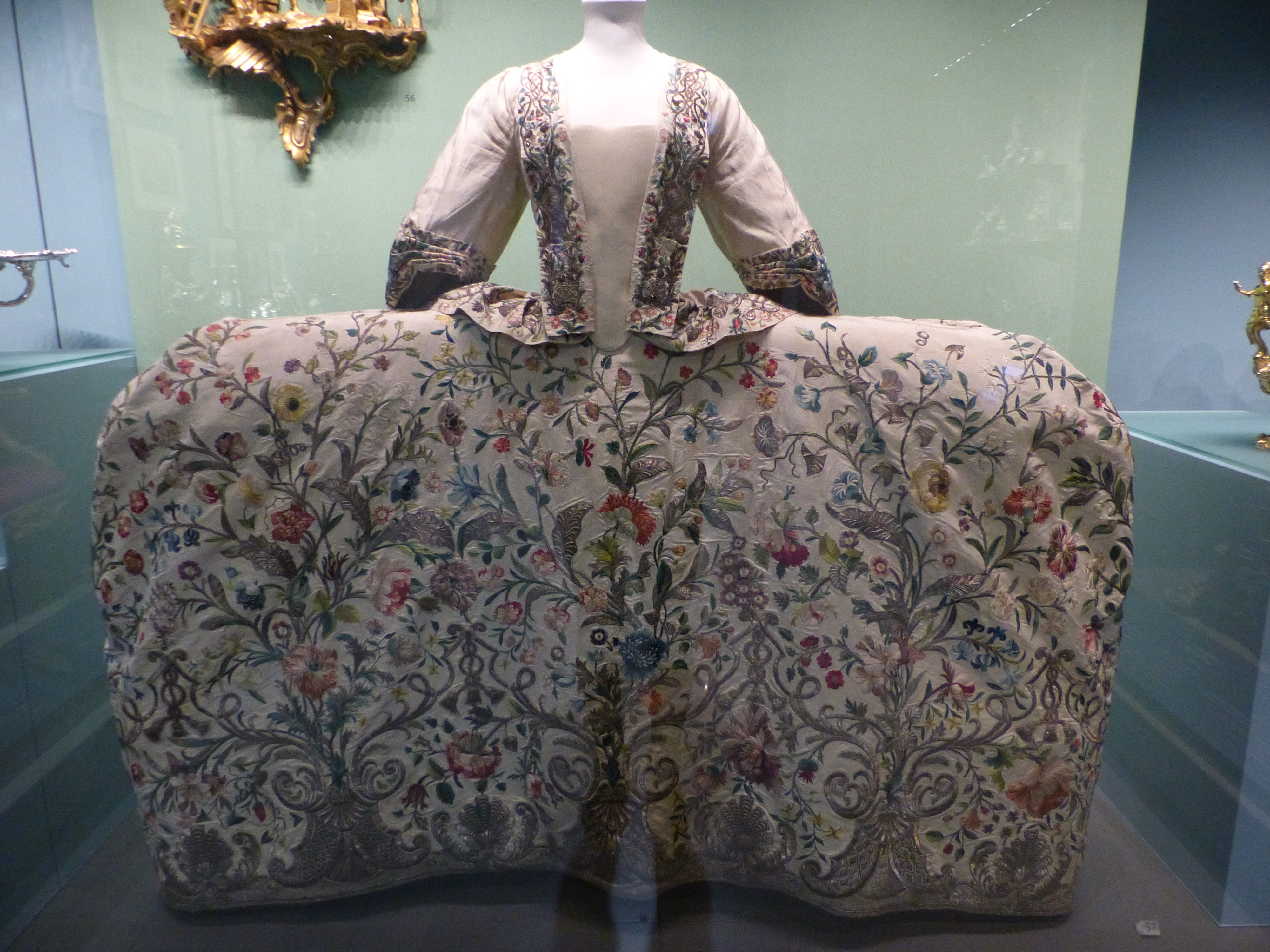 I’d seen lots of pictures and period movies of women wearing those dresses that stuck out to the side and were worn at court; I had no idea how wide they were though, until I saw one today. Fair dinkum! I think this style was the fashion item that coined the question, “Does my bum look big in this?” This dress is from the 1740’s and the wearer did indeed have to walk sideways through doors. The idea was to display as much of the lavish decoration as possible, hence the width, but talk about fashion before comfort!