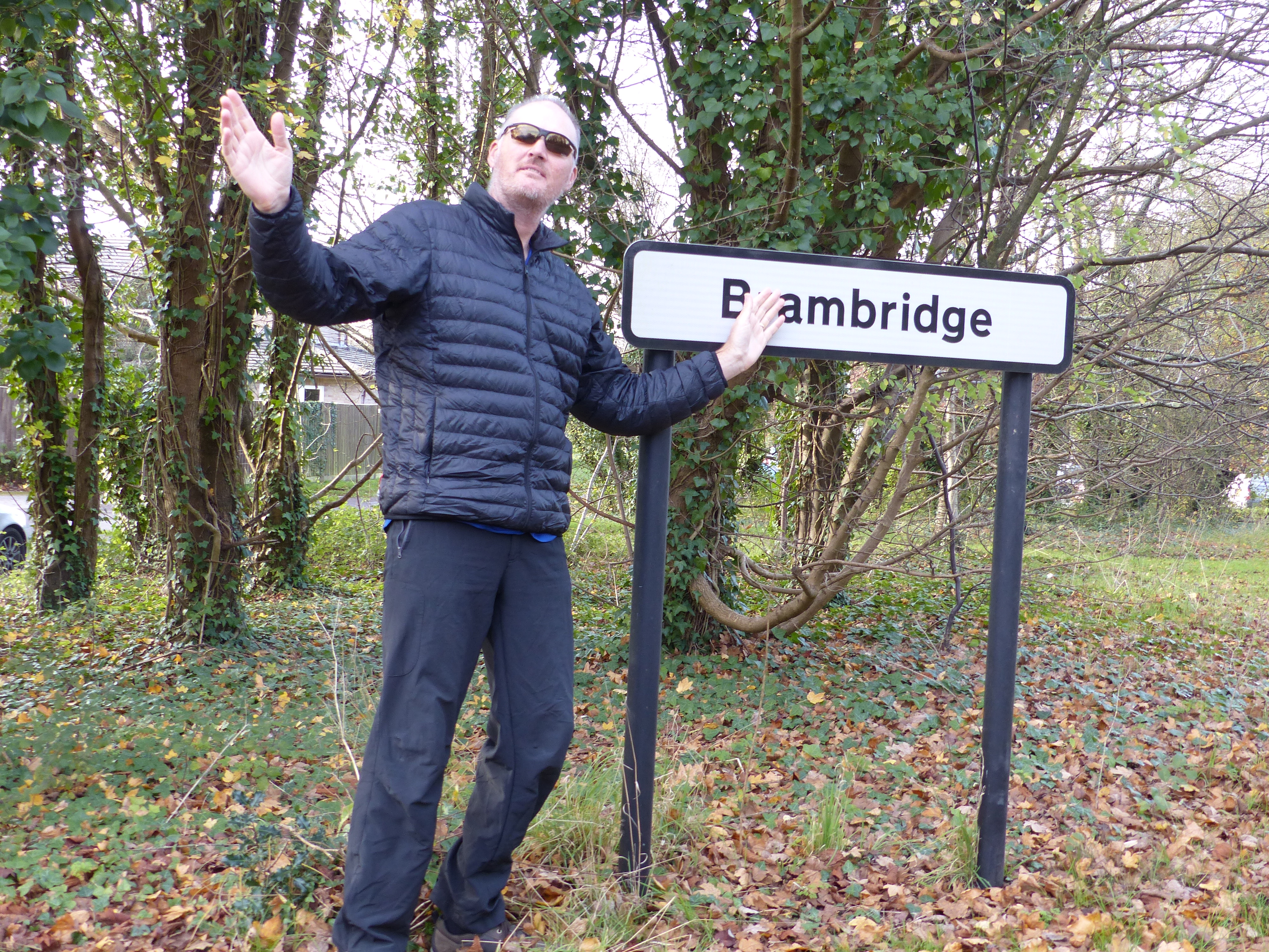 The sign came into view and there was the little hamlet of Brambride, which Steve set about rectifying the spelling of, to give it a more accurate place on the branches of the Big Fella’s family tree. He abandoned the “Emperor’s point” but still maintained his regal, Emperor’s pose, just to let that little village know it almost had the same name as someone of his supreme level of greatness.