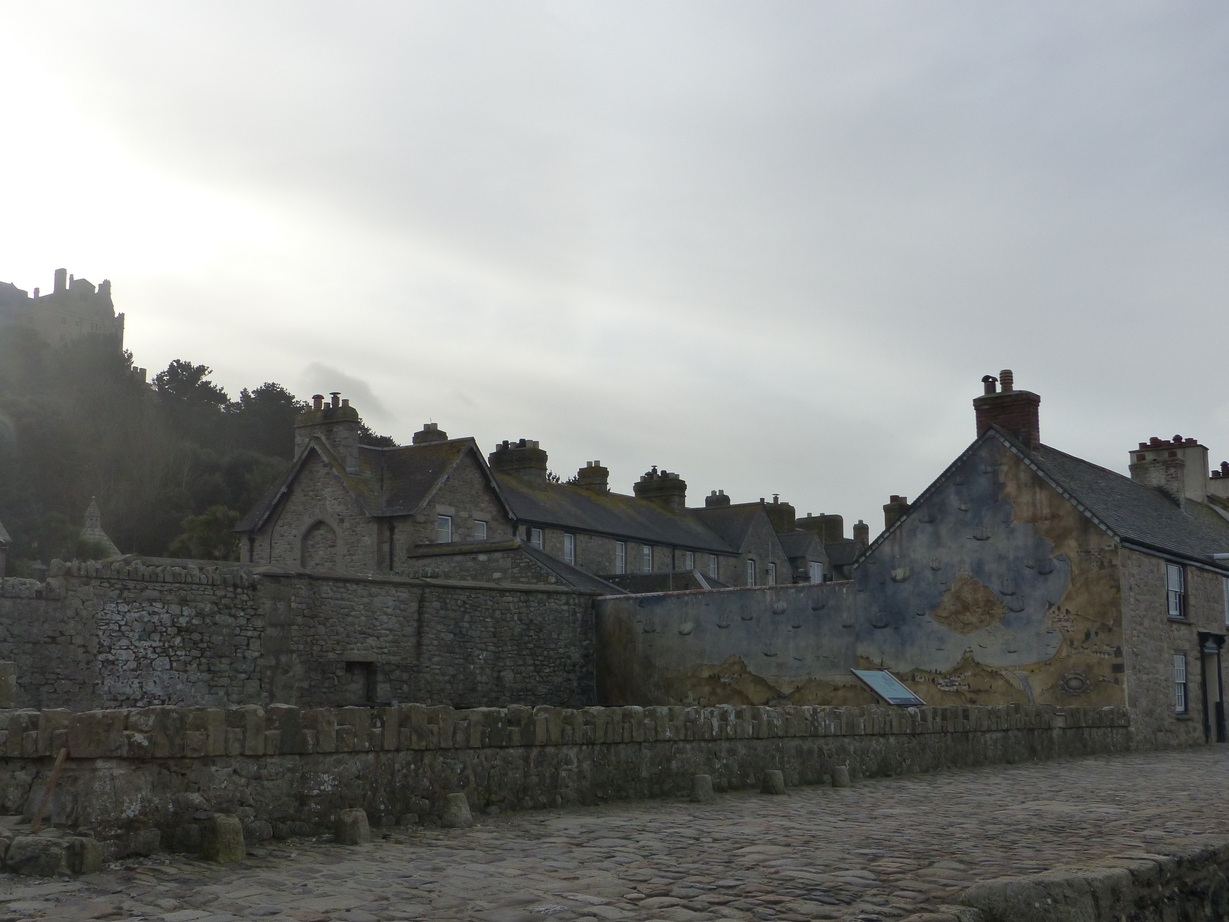 St. Michael’s Mount is a castle sitting atop an island near Penzance, which can only be reached by foot at low tide. In 1066, it was owned by the same monks that inhabited its sister island, Mont St. Michel in Normandy and in the 12th century they built the church and priory that are still in the castle today. The castle was closed today, so we couldn’t go inside, but it was low tide so we braced ourselves and fought the wind to walk across the causeway and have a look around the island. Just getting there was an adventure! The stones on the causeway were very slippery and very moss covered and the wind was FIERCE, EXTREME, POWER-PACKED AND WILD! I was walking sideways, against the wind, just to try and keep my footing. There were a lot of other hardy folks out and about on the beach and walking across to the island too. Everyone was laughing, just as we were, at the side-stepping and dancing we were all doing, while the wind pushed all of us around and sideways and this way and that.